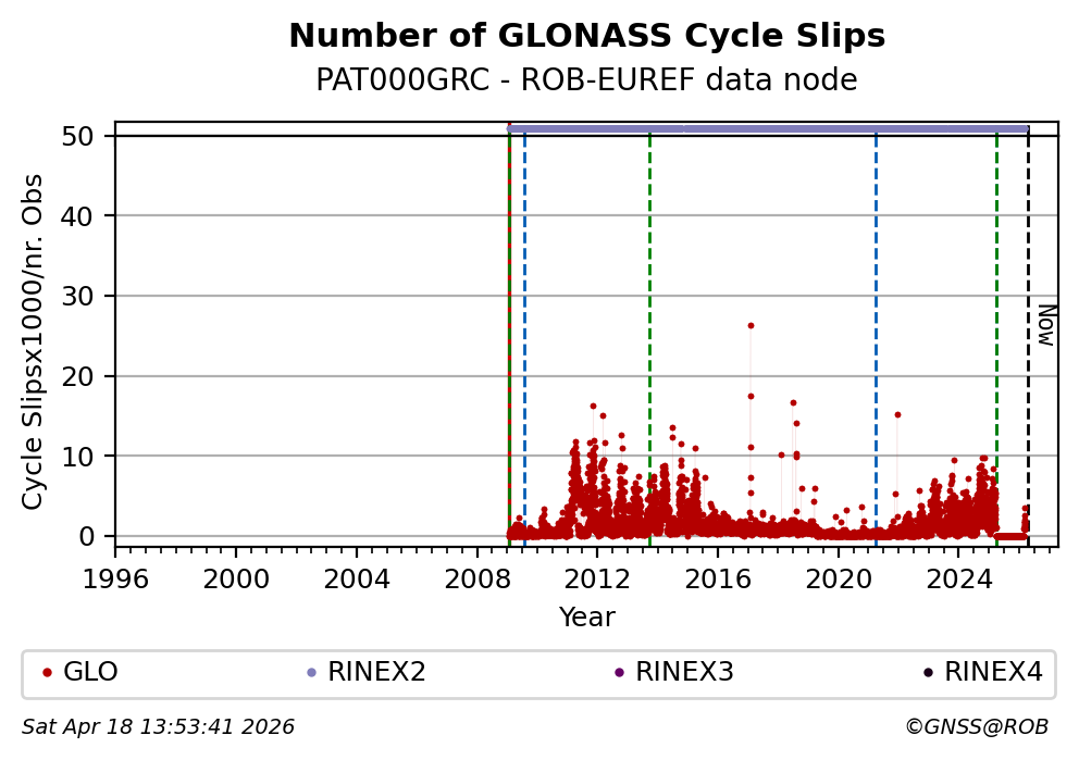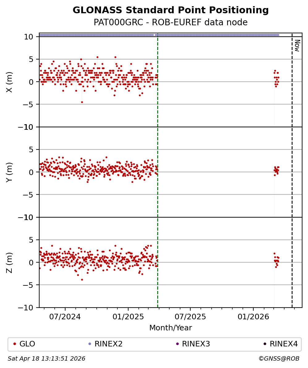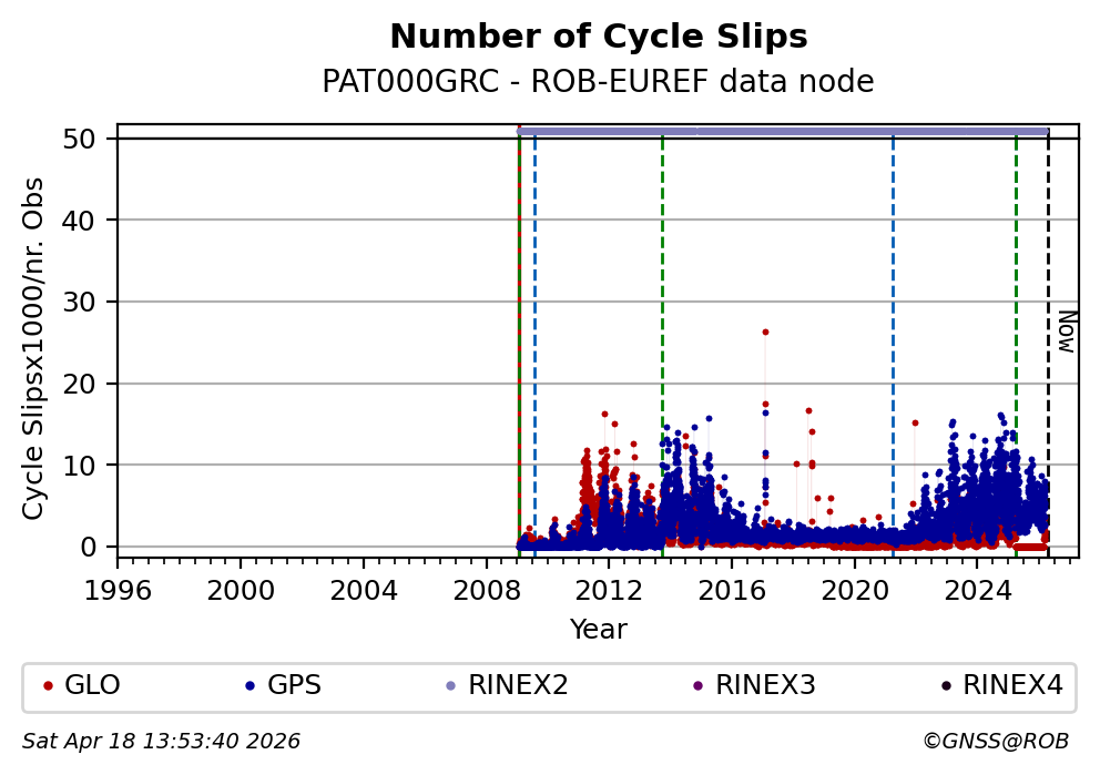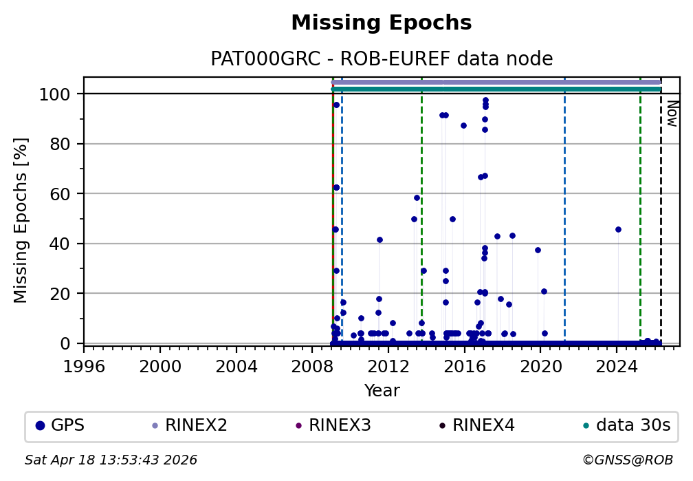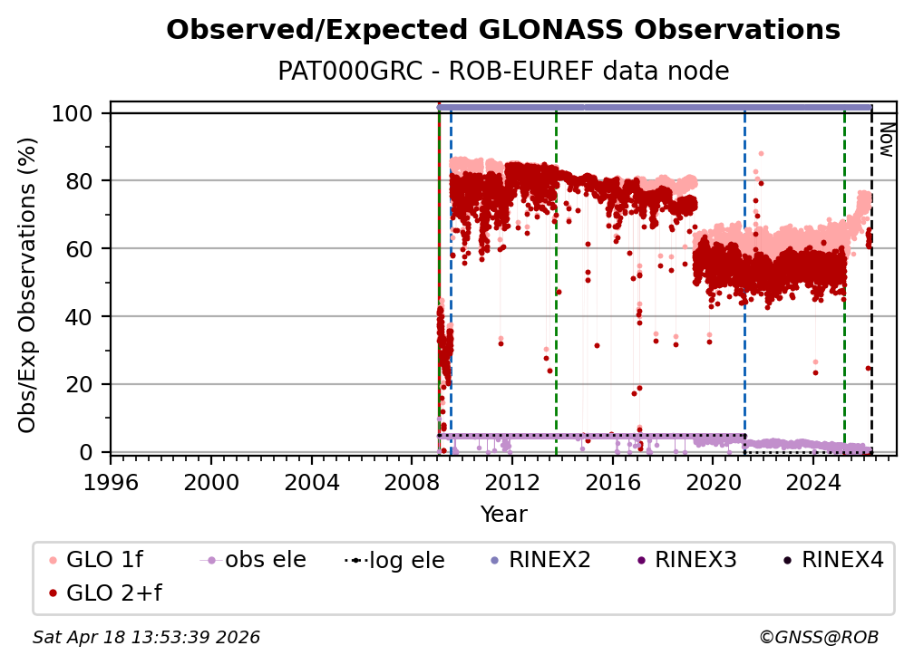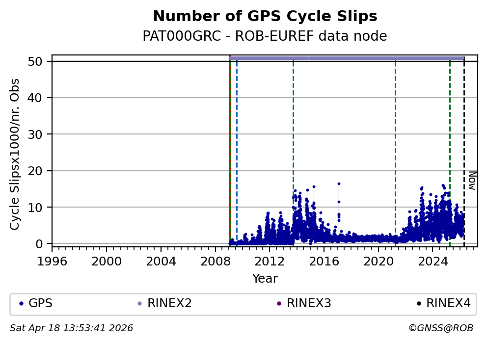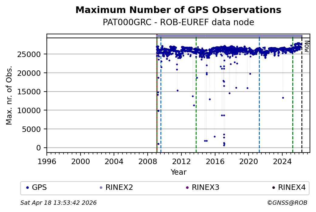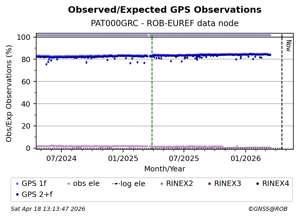 The plots below present the long-term tracking performance of the EPOS-GNSS station PAT000GRC based on the daily RINEX data available from the ROB-EUREF EPOS-GNSS data node. The data quality metrics have been computed at the data node using the G-Nut/Anubis software.