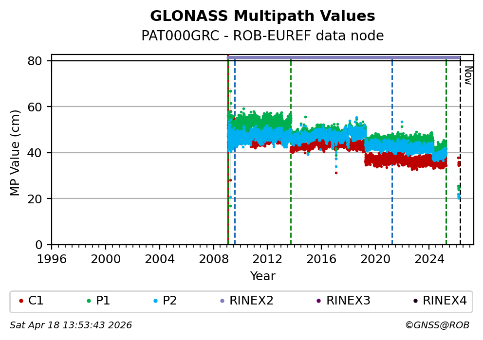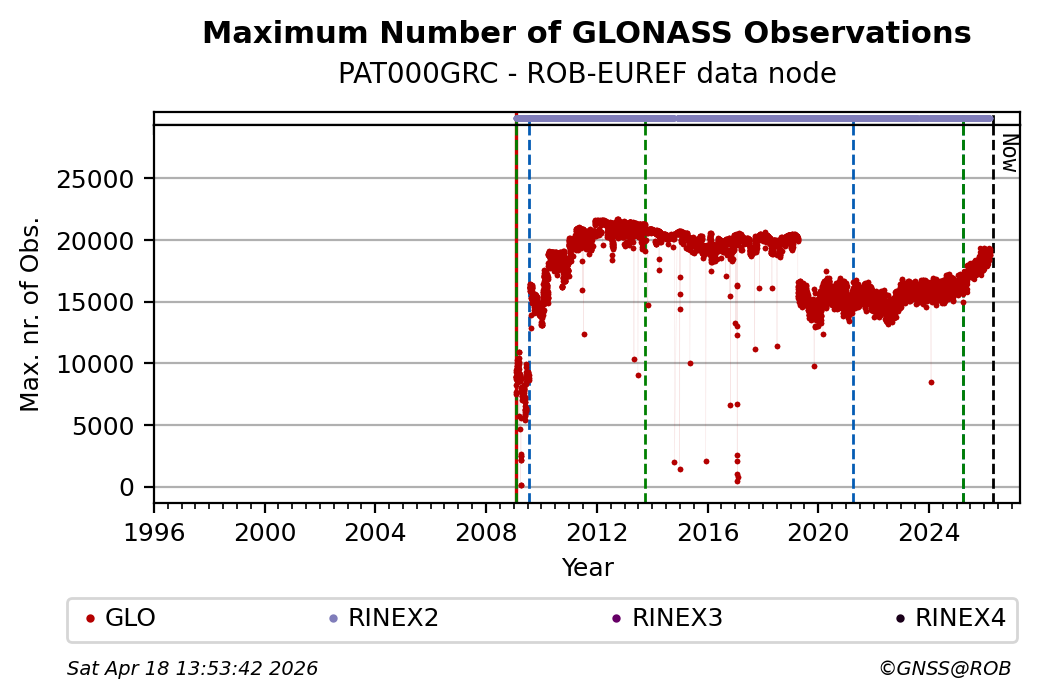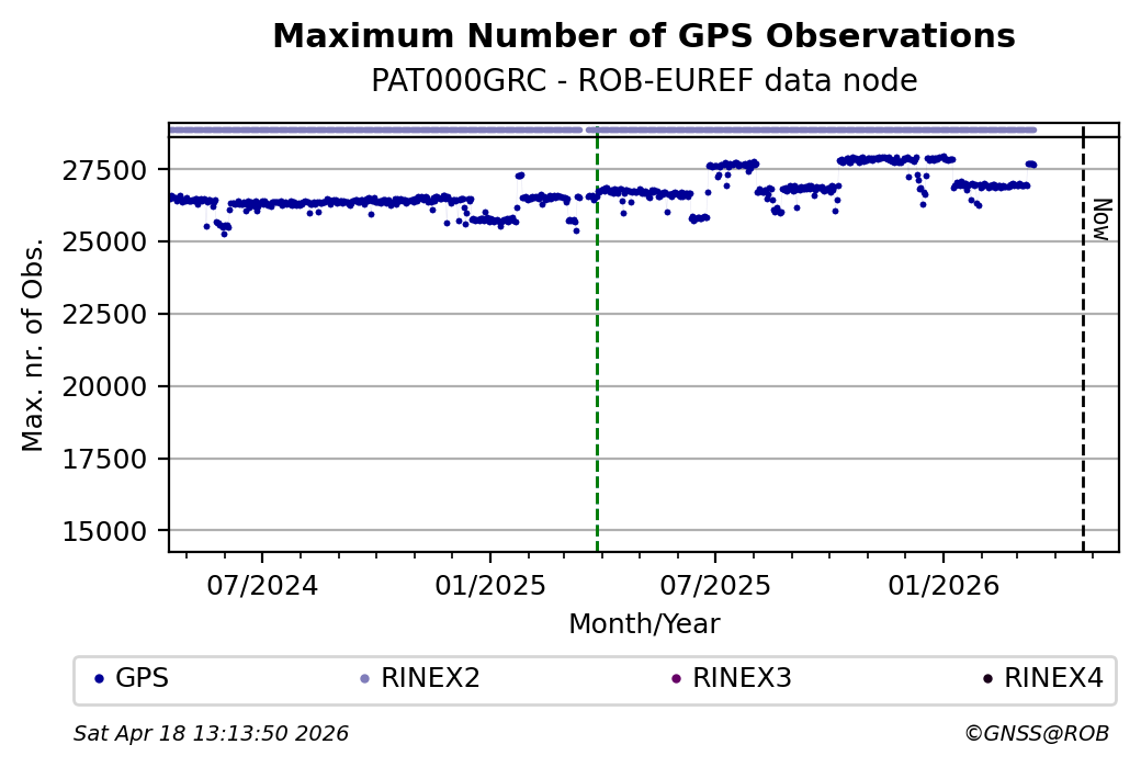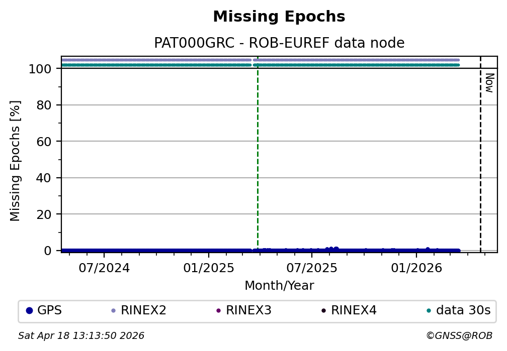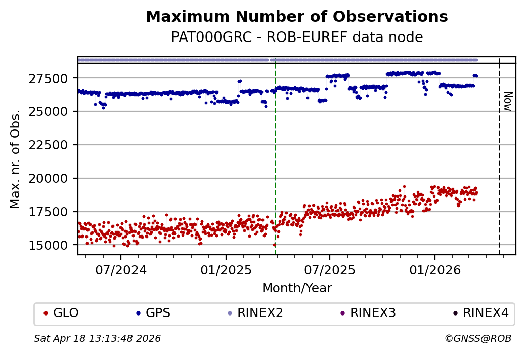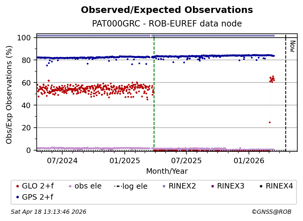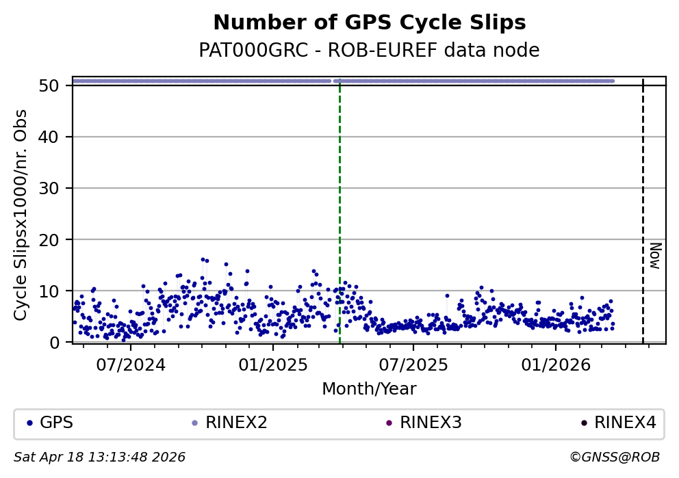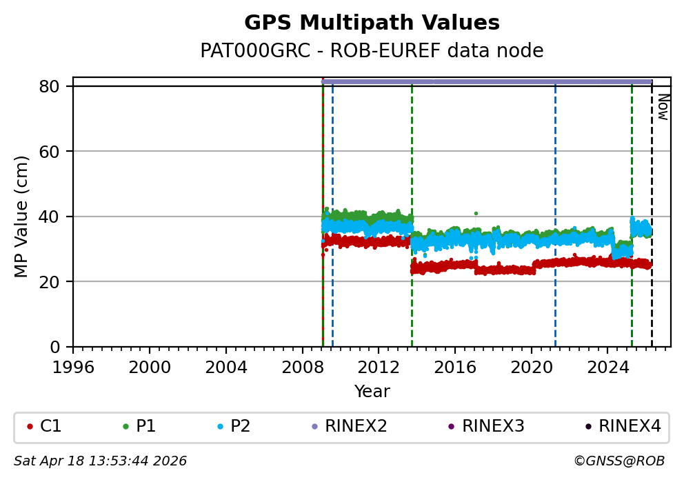 The plots below present the long-term tracking performance of the EPOS-GNSS station PAT000GRC based on the daily RINEX data available from the ROB-EUREF EPOS-GNSS data node. The data quality metrics have been computed at the data node using the G-Nut/Anubis software.