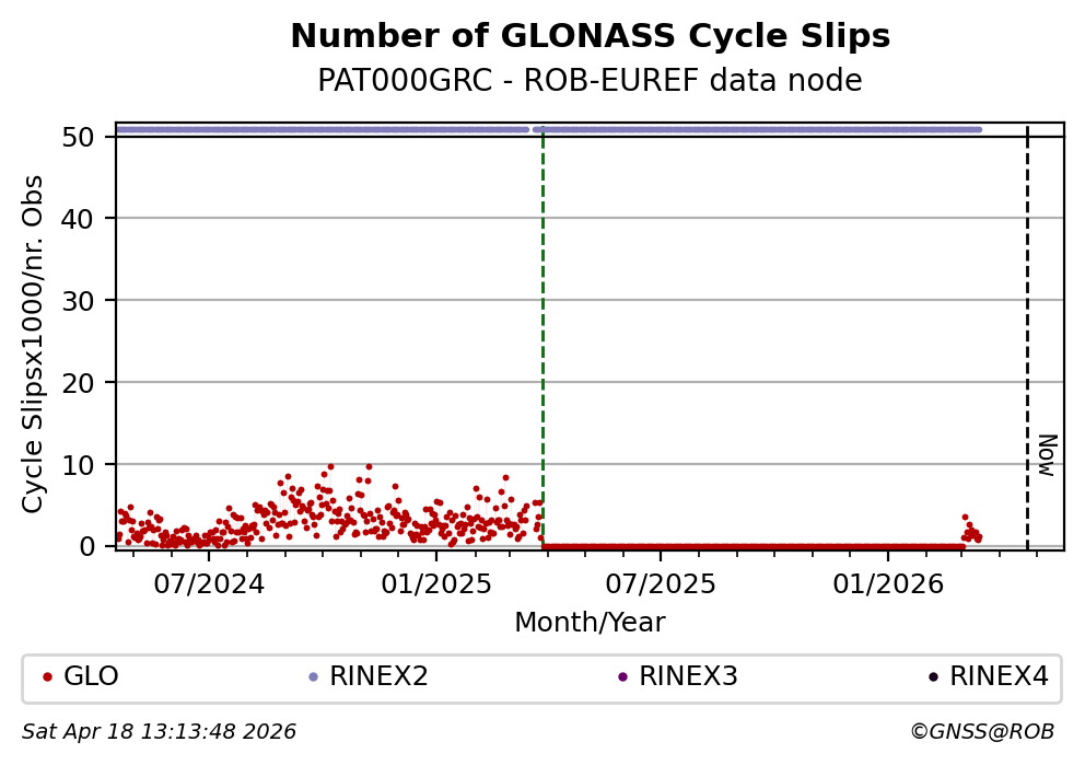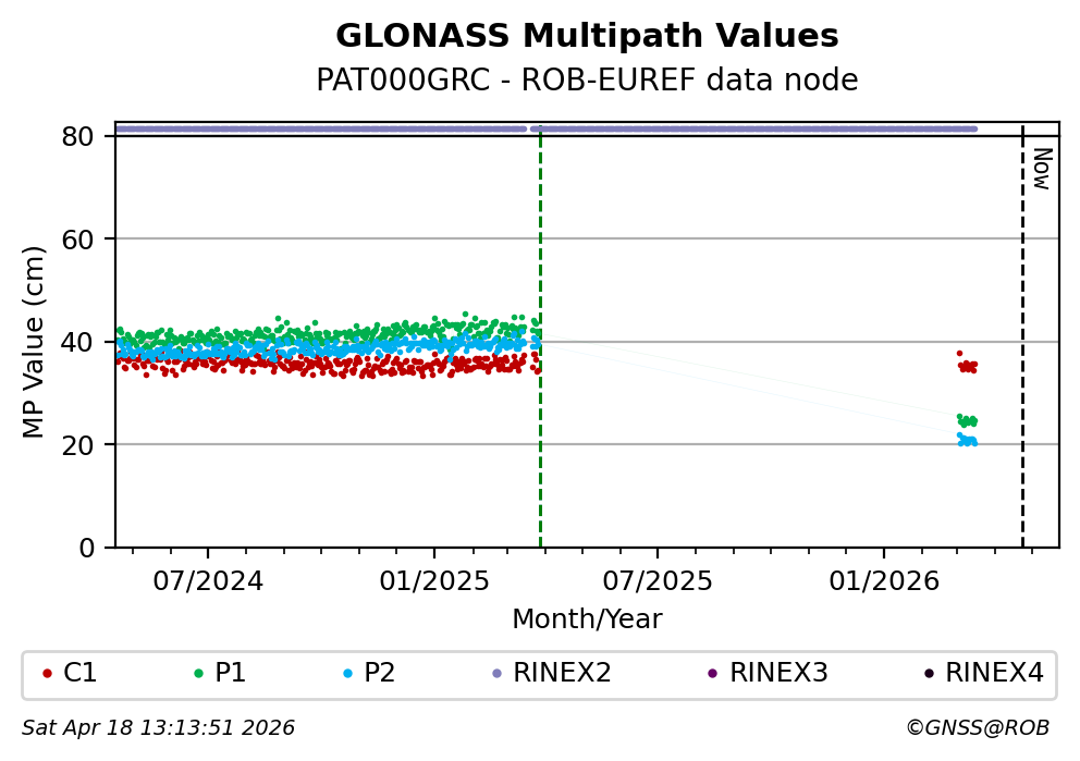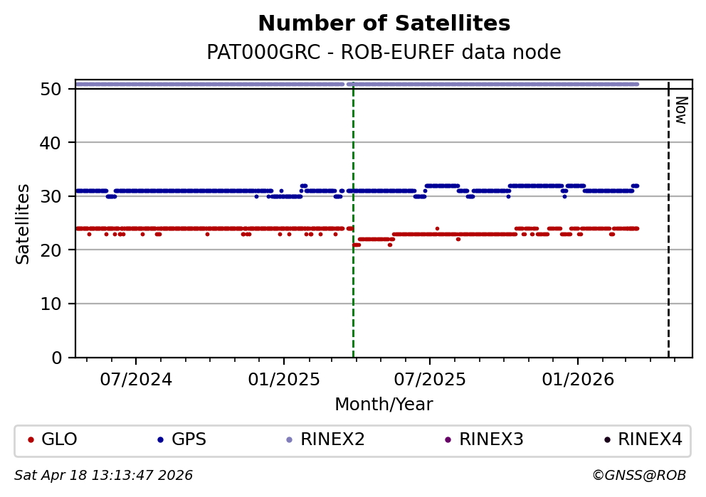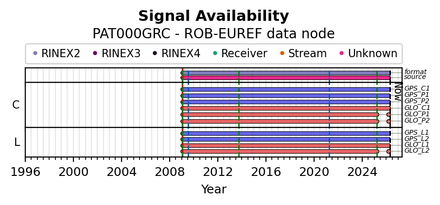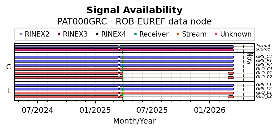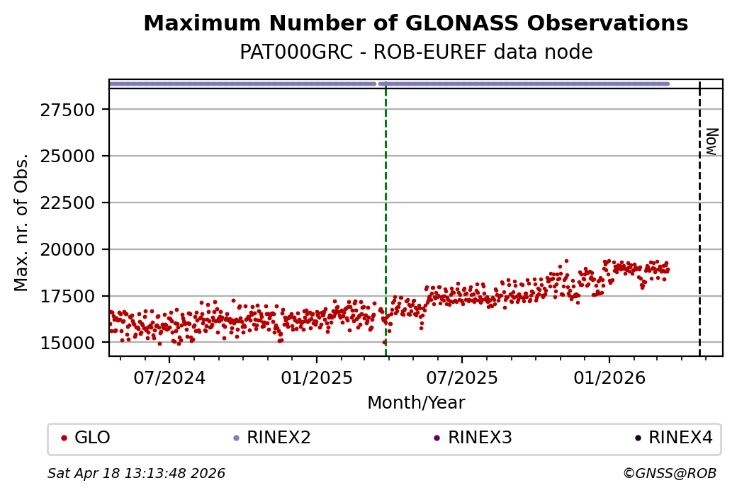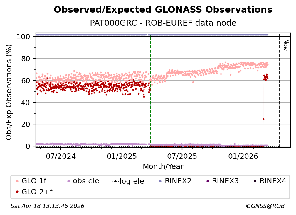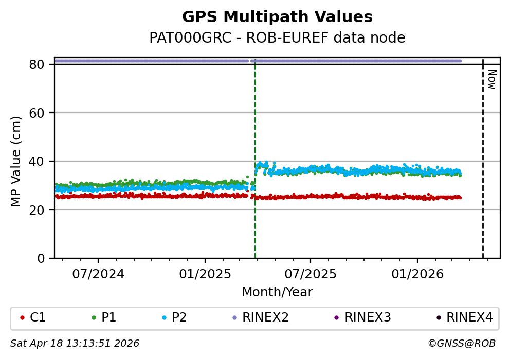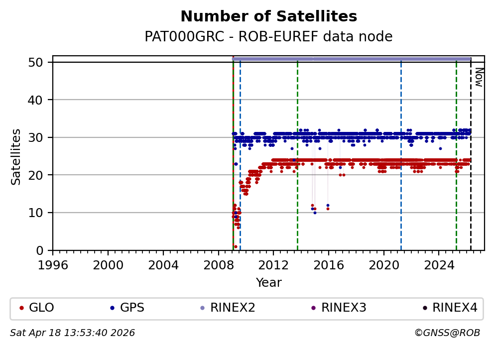 The plots below present the long-term tracking performance of the EPOS-GNSS station PAT000GRC based on the daily RINEX data available from the ROB-EUREF EPOS-GNSS data node. The data quality metrics have been computed at the data node using the G-Nut/Anubis software.