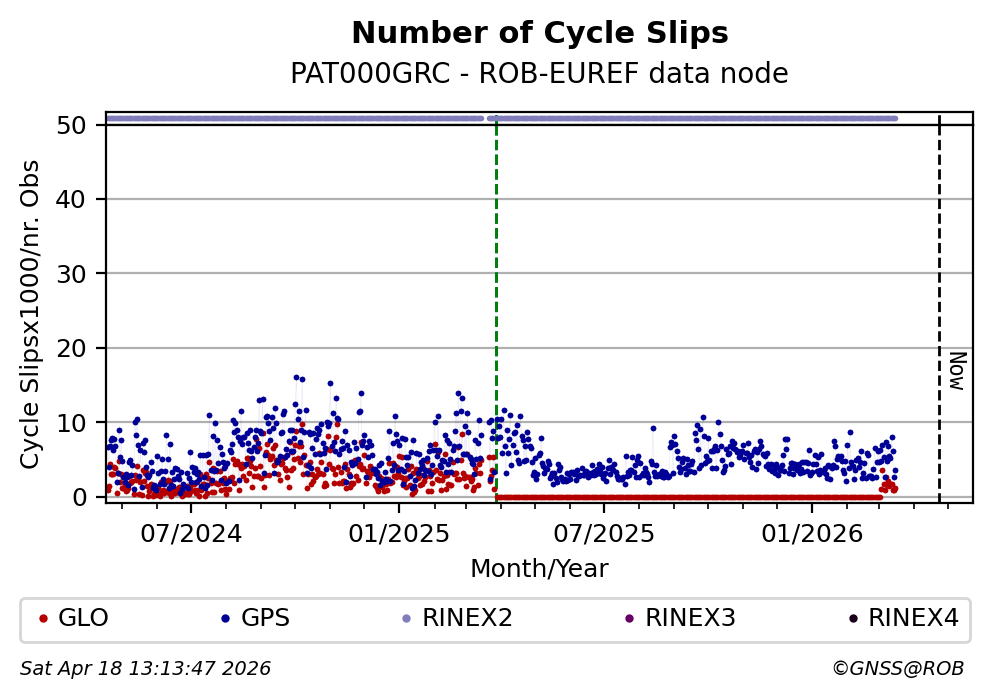 These plots display the number of identified phase cycle slips for each constellation tracked by the station.