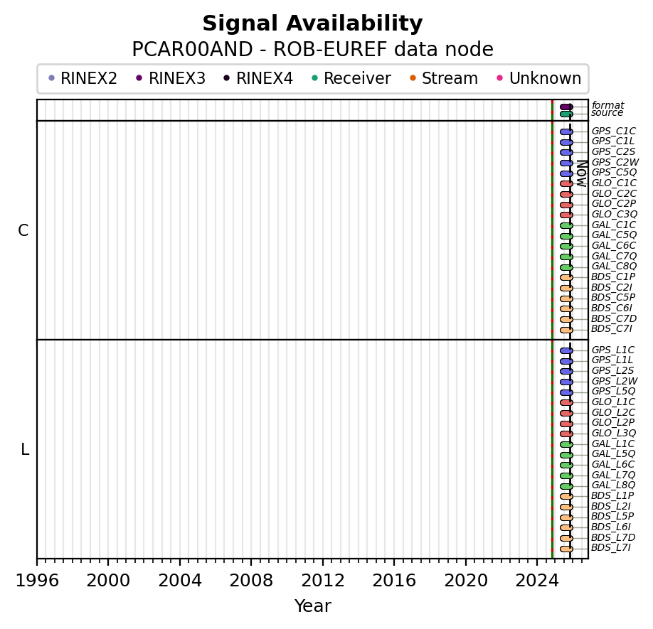 Red vertical lines, green and blue vertical dotted lines indicate respectively a change of antenna, receiver or receiver configuration (including firmware) as indicated by the station manager in the station site log available from the M3G GNSS Metadata Catalog. The purple points in the top of the plot indicate the daily RINEX data availability at the data node.