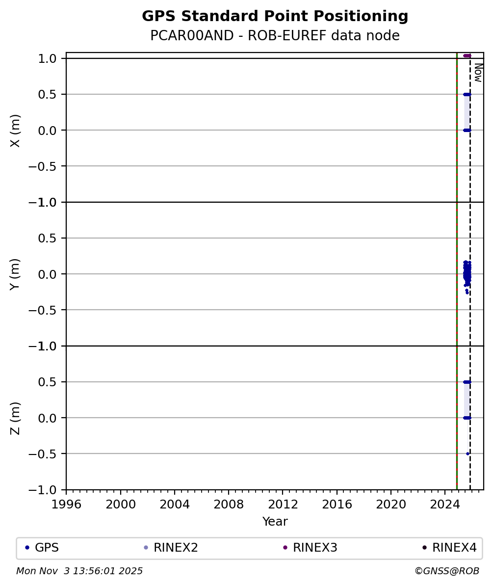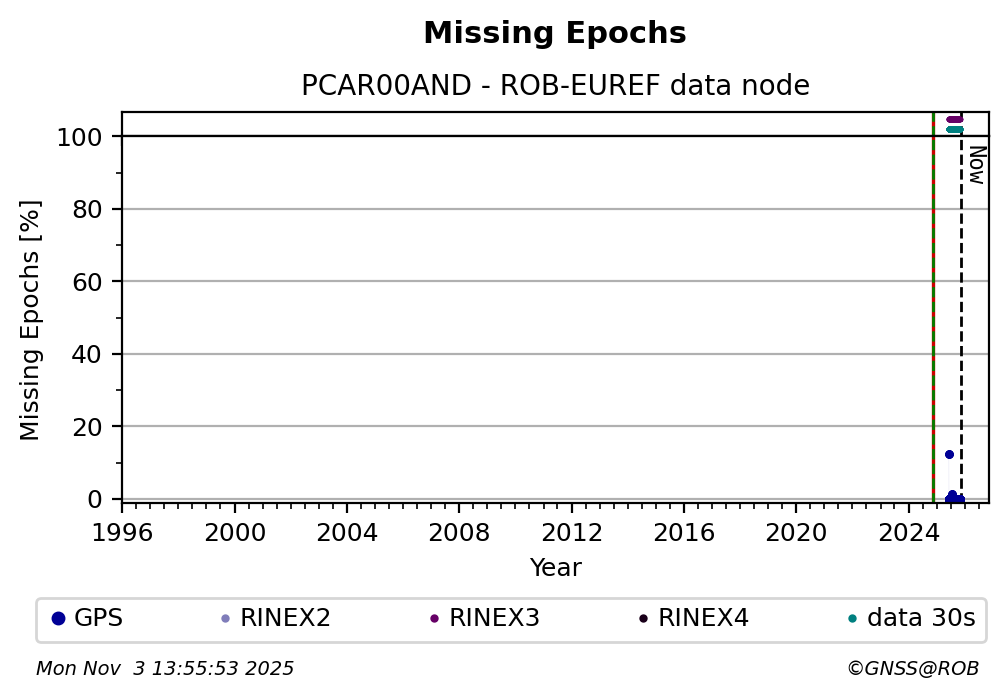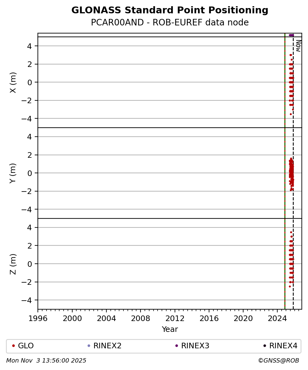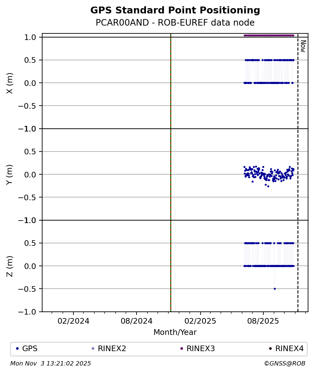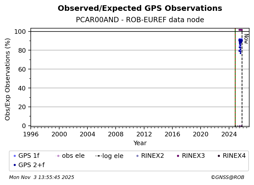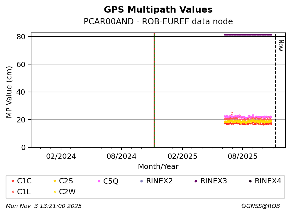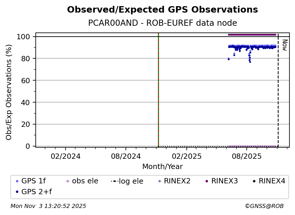 The plots below present the long-term tracking performance of the EPOS-GNSS station PCAR00AND based on the daily RINEX data available from the ROB-EUREF EPOS-GNSS data node. The data quality metrics have been computed at the data node using the G-Nut/Anubis software.