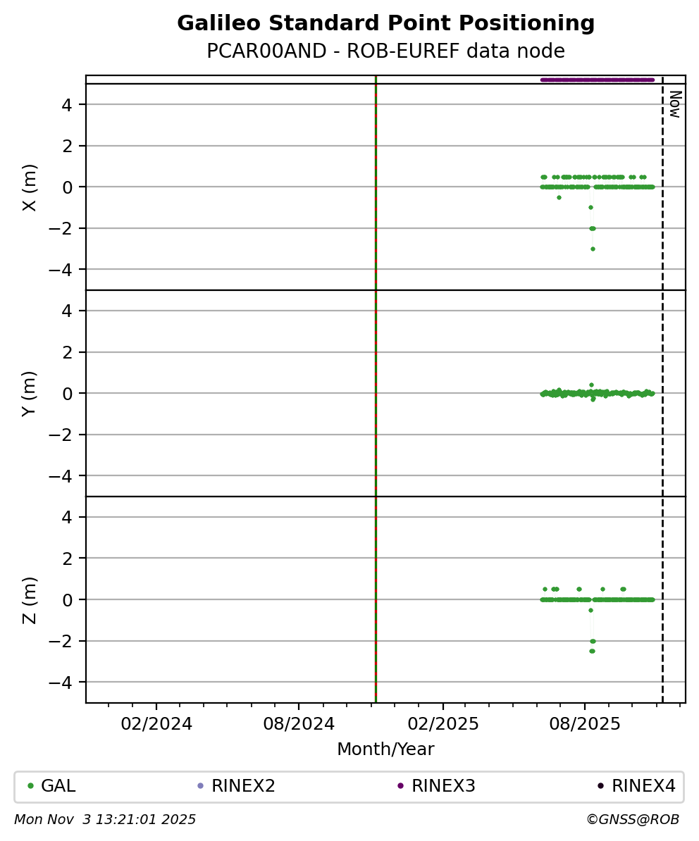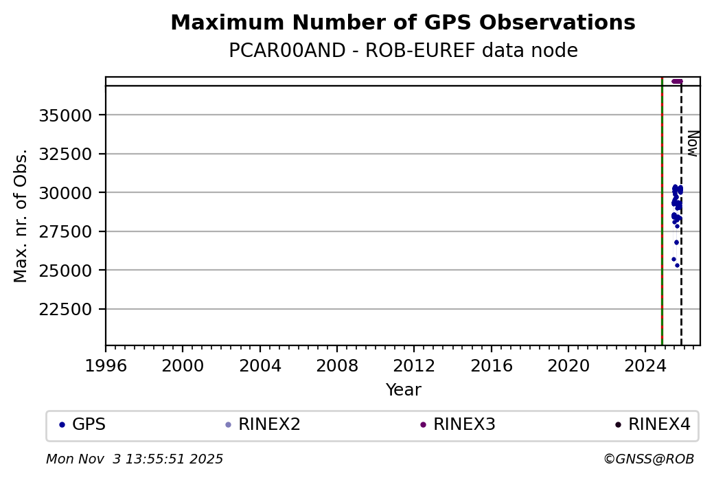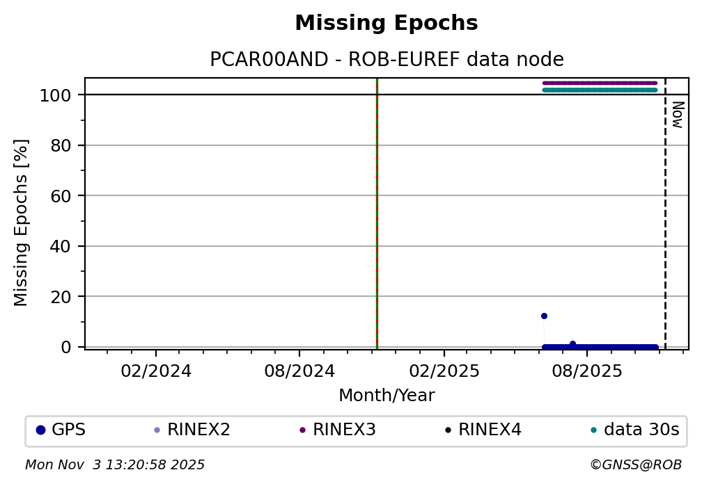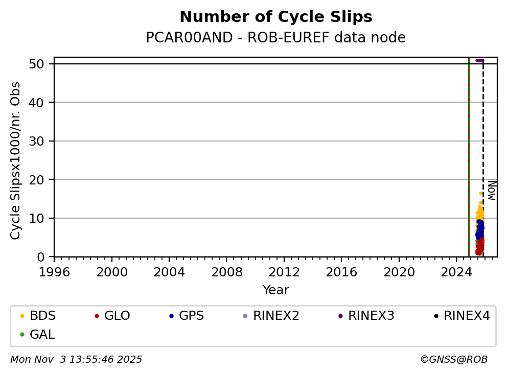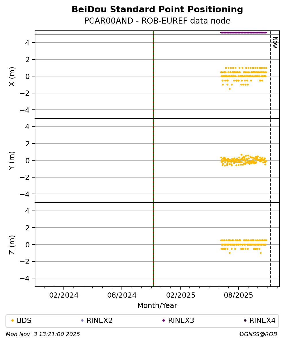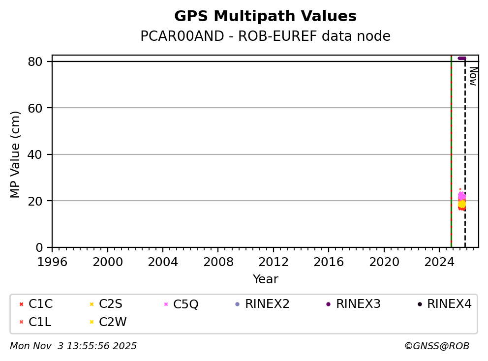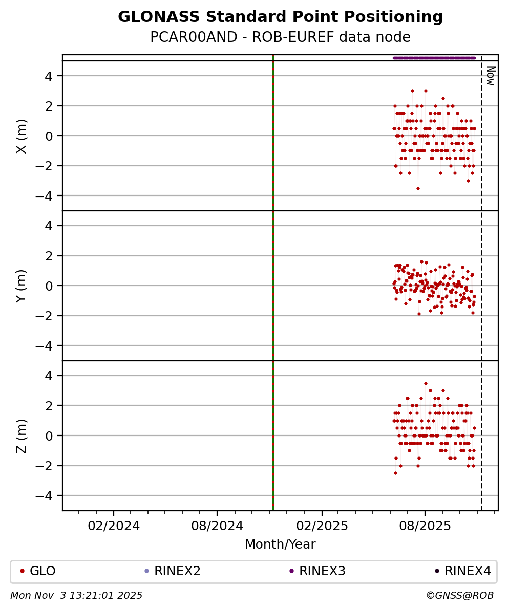 The plots below present the long-term tracking performance of the EPOS-GNSS station PCAR00AND based on the daily RINEX data available from the ROB-EUREF EPOS-GNSS data node. The data quality metrics have been computed at the data node using the G-Nut/Anubis software.