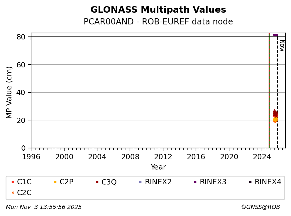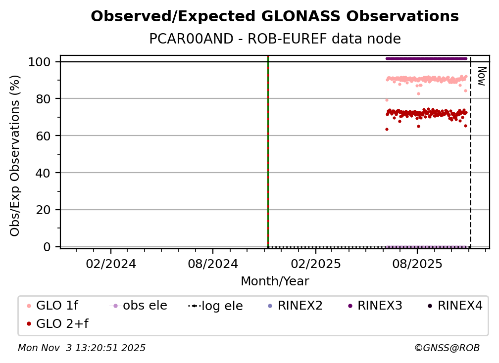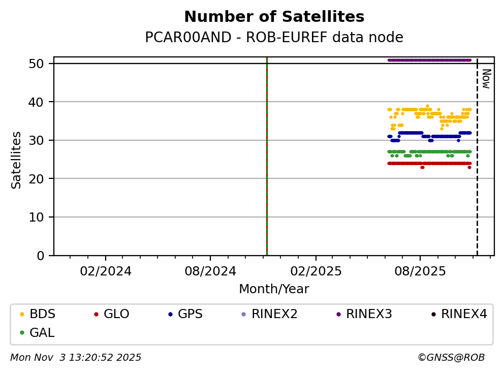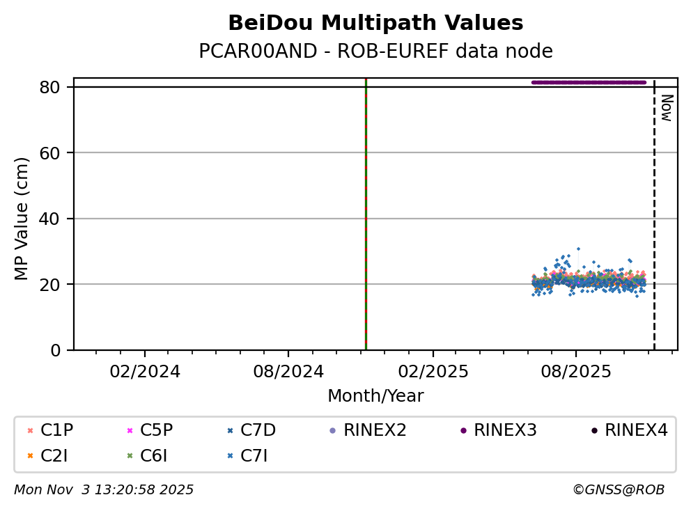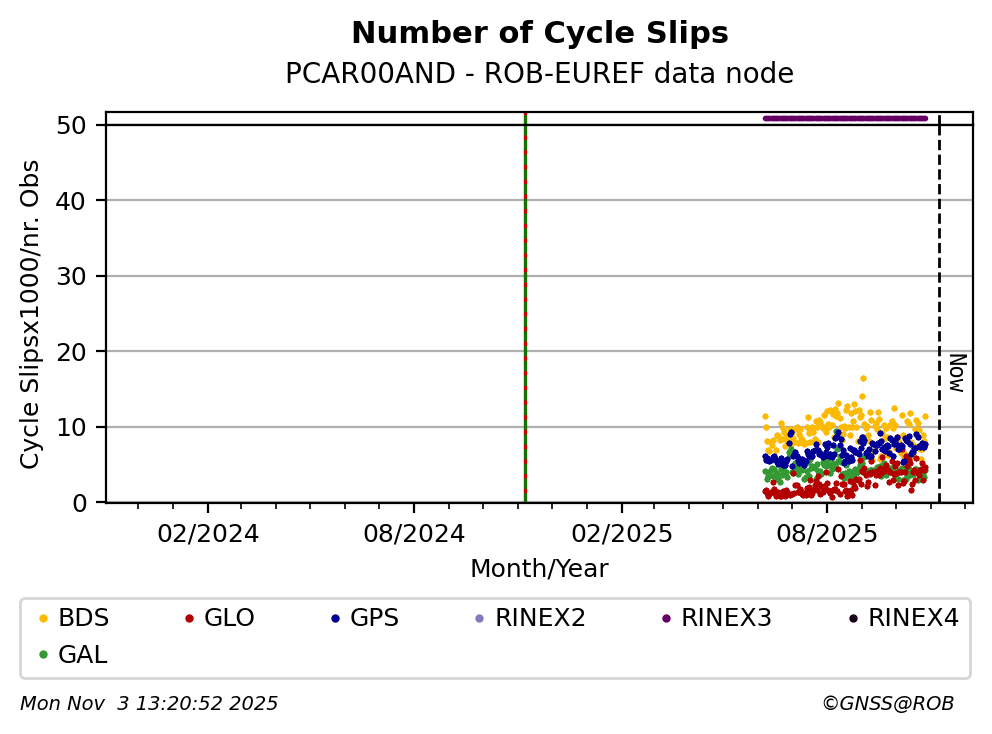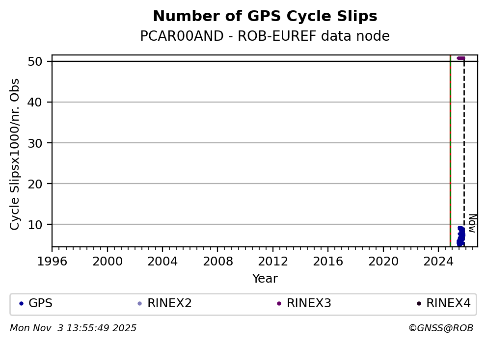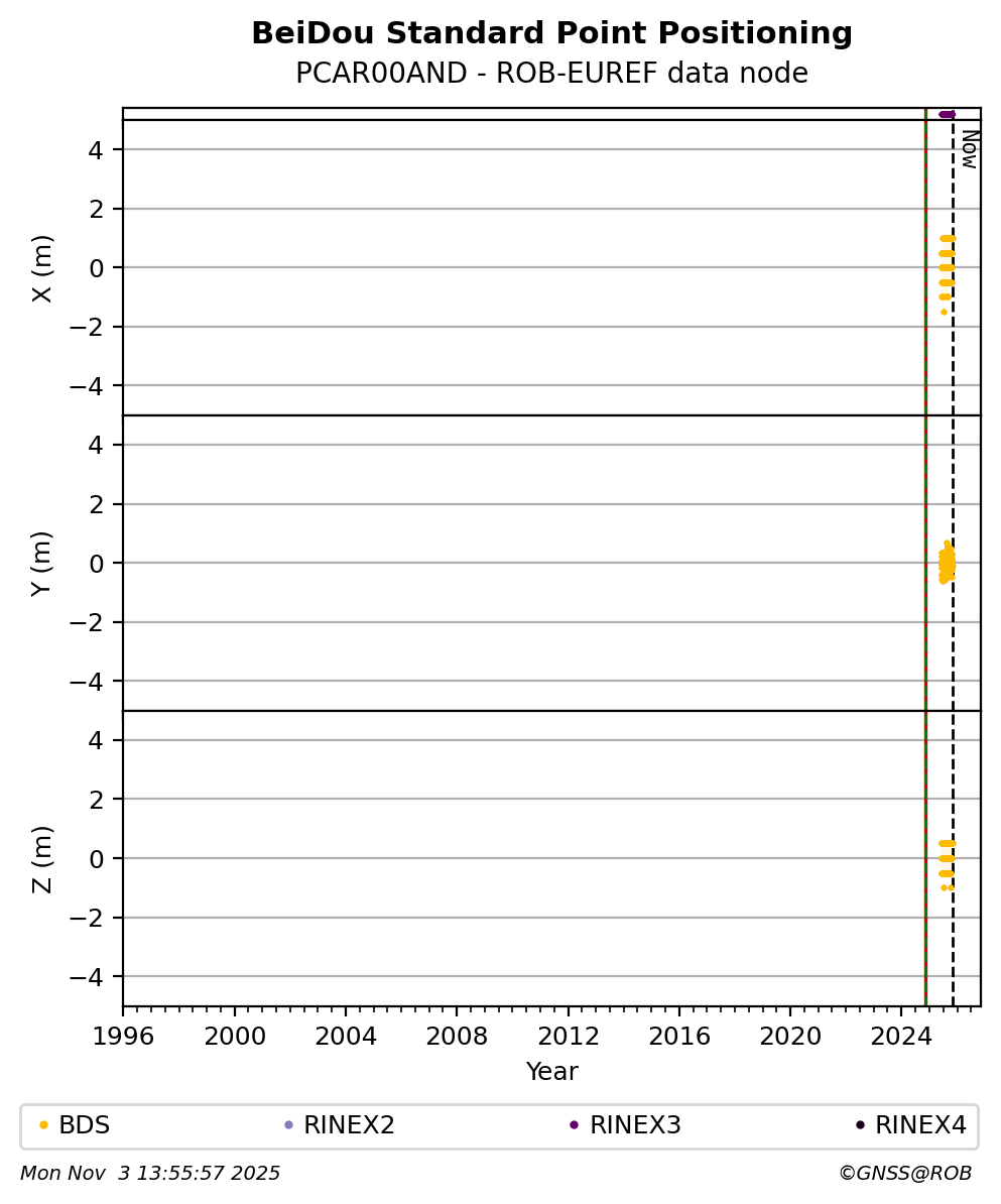 The plots below present the long-term tracking performance of the EPOS-GNSS station PCAR00AND based on the daily RINEX data available from the ROB-EUREF EPOS-GNSS data node. The data quality metrics have been computed at the data node using the G-Nut/Anubis software.