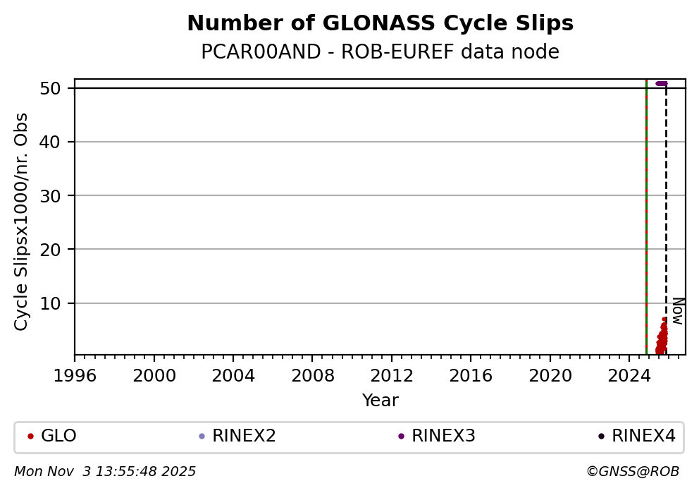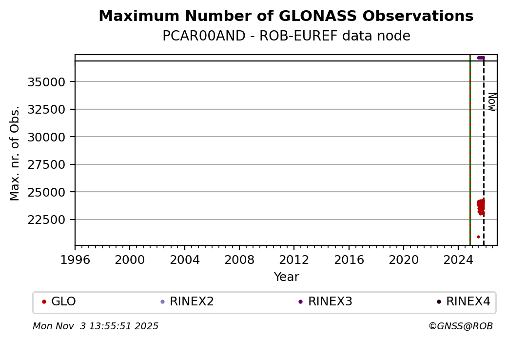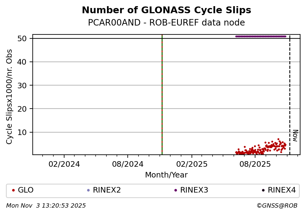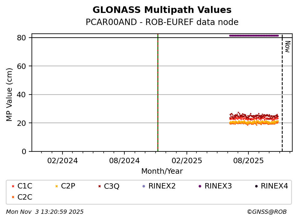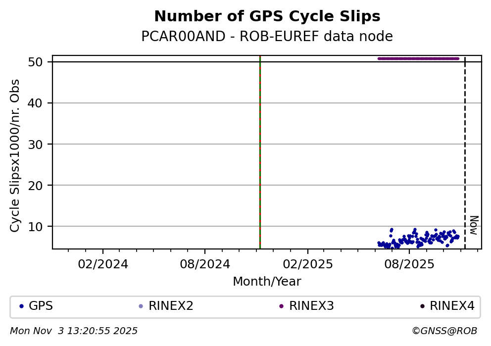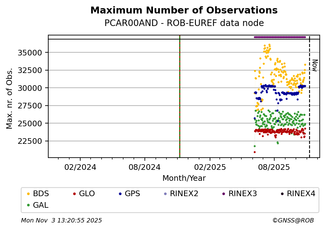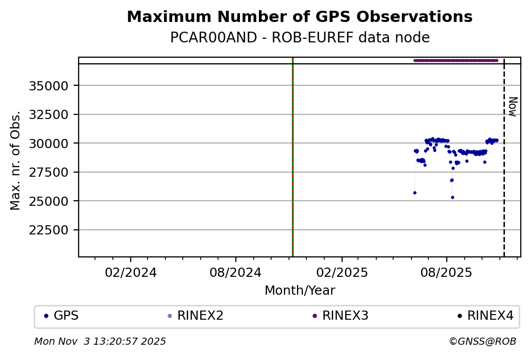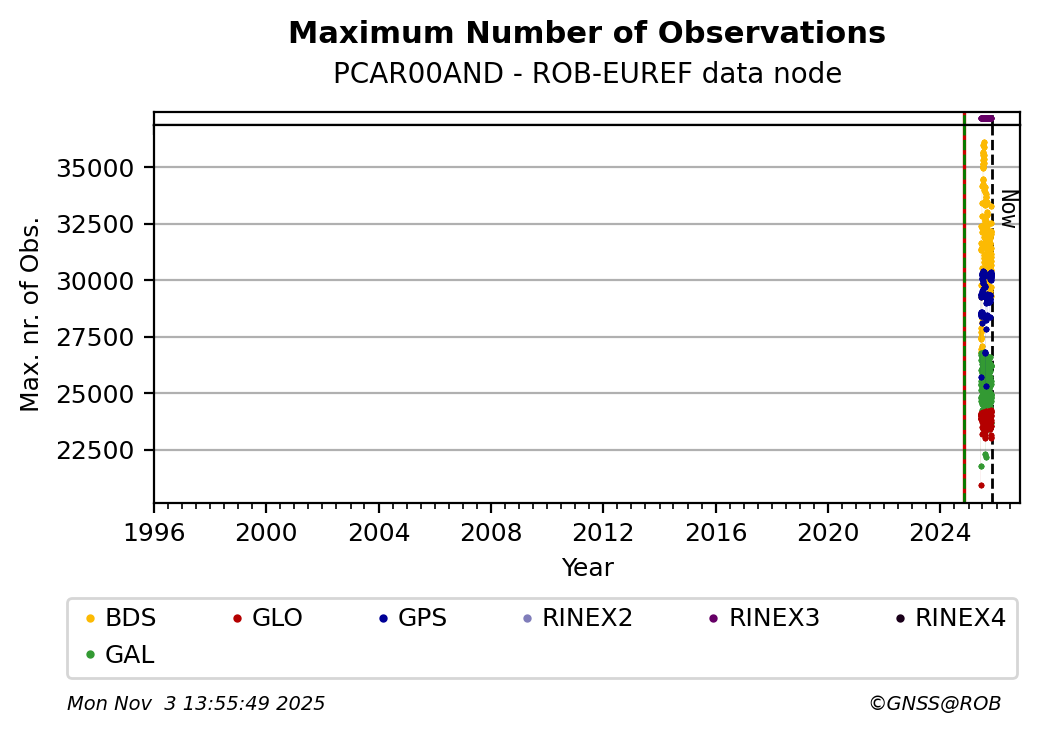 The plots below present the long-term tracking performance of the EPOS-GNSS station PCAR00AND based on the daily RINEX data available from the ROB-EUREF EPOS-GNSS data node. The data quality metrics have been computed at the data node using the G-Nut/Anubis software.