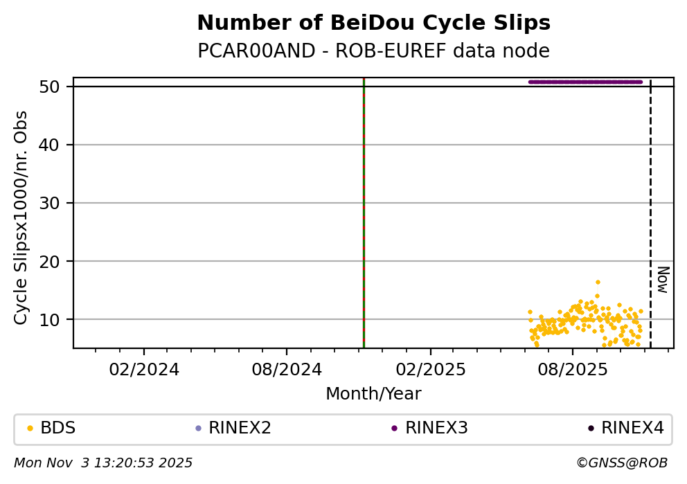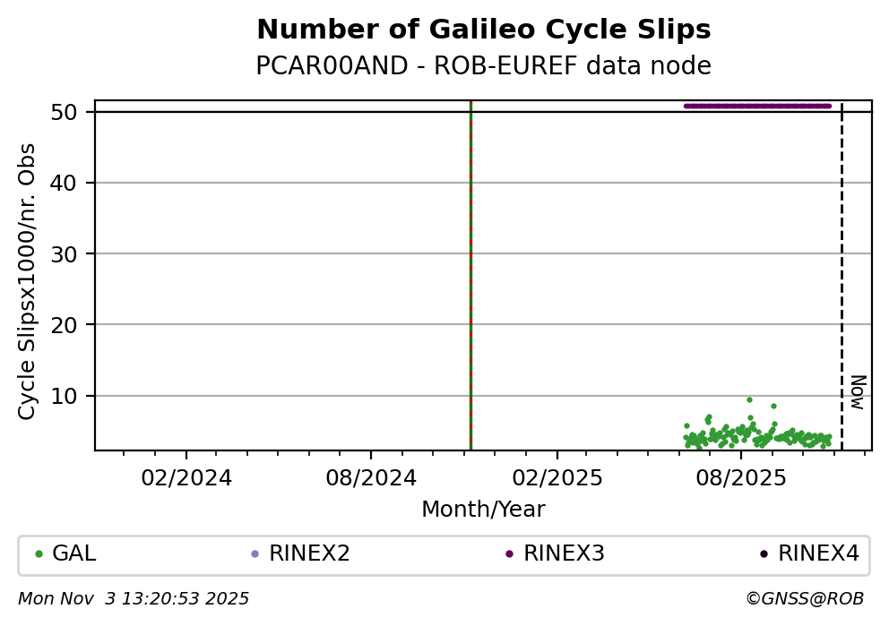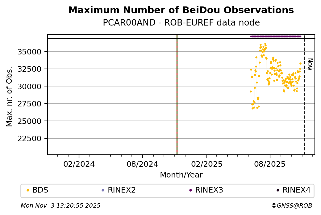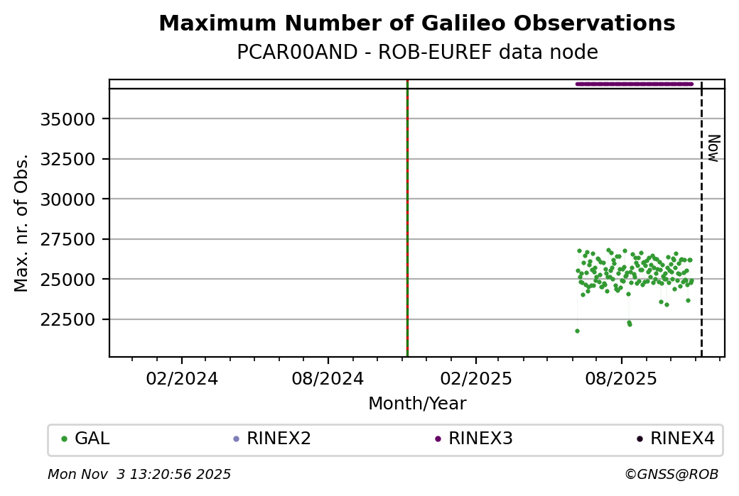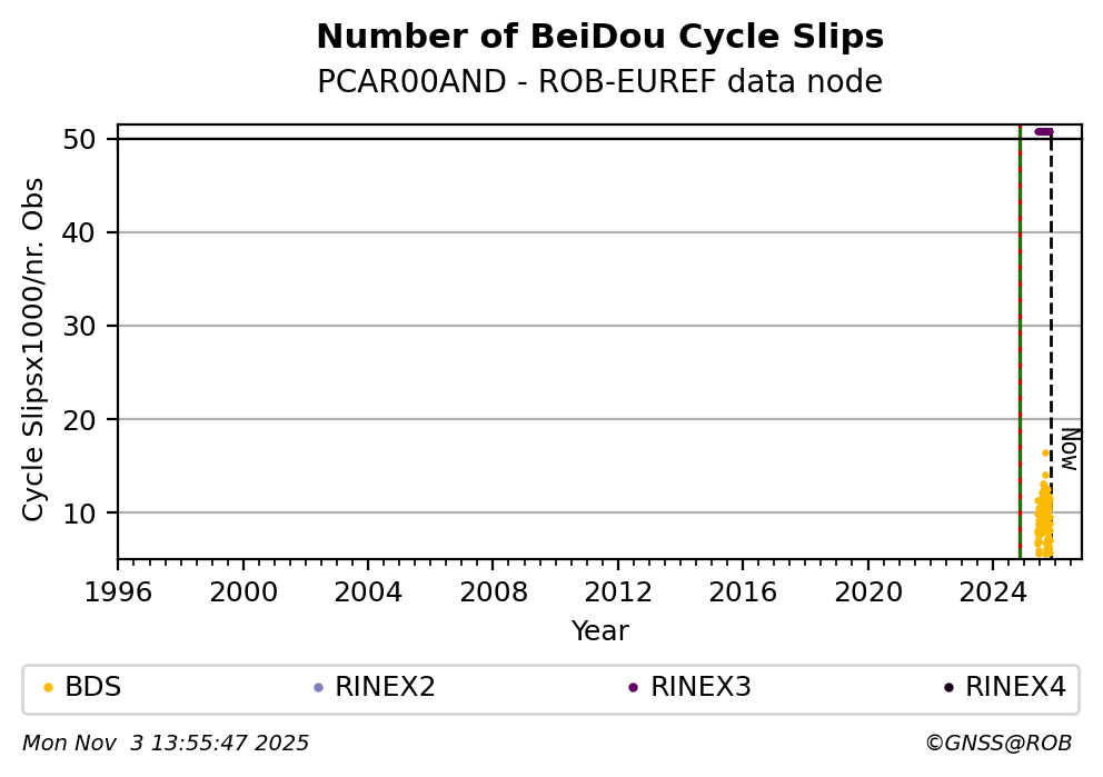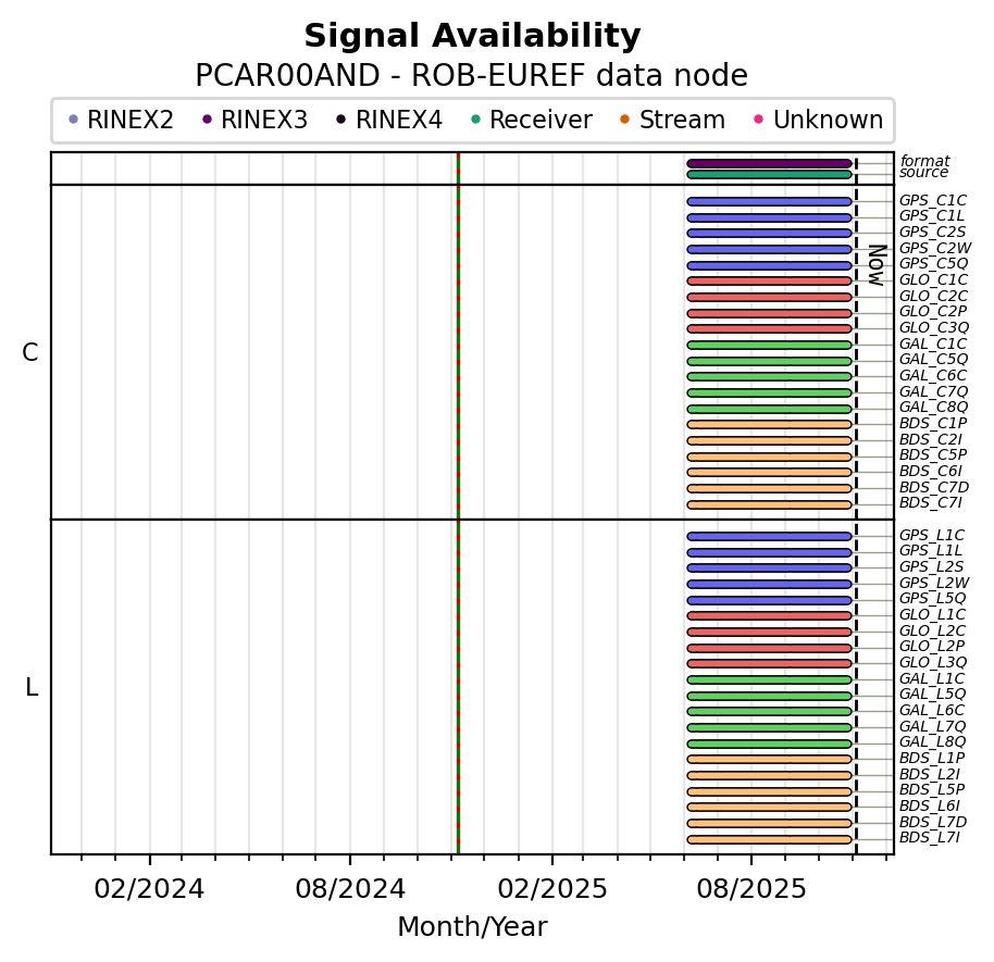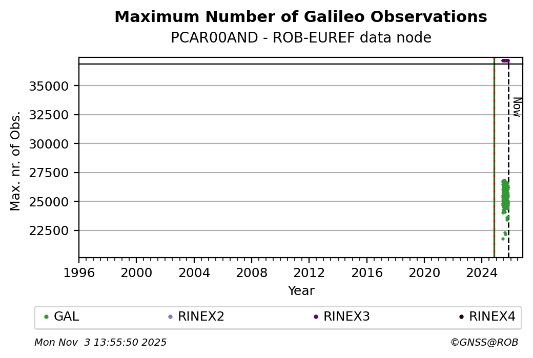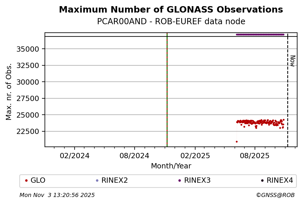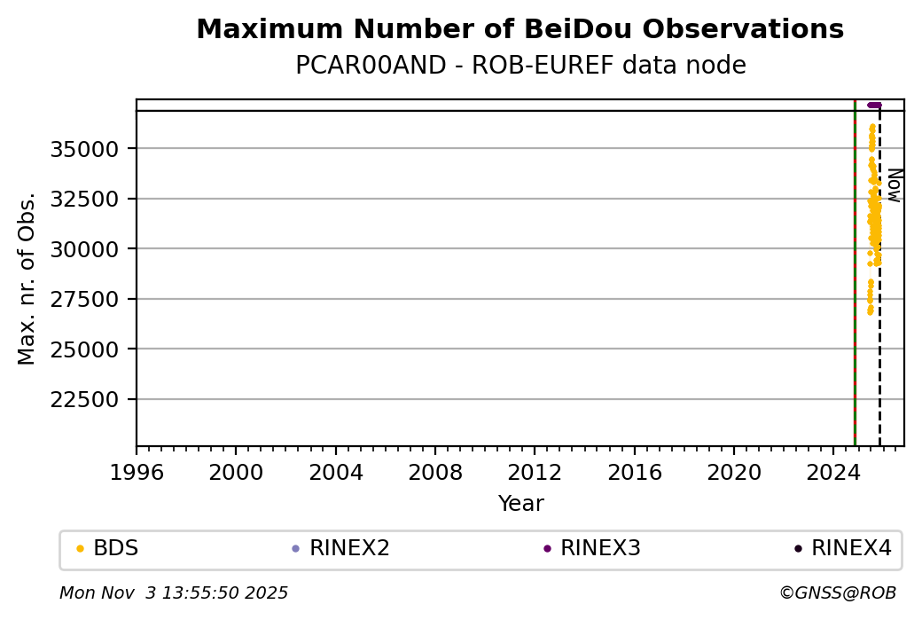 The plots below present the long-term tracking performance of the EPOS-GNSS station PCAR00AND based on the daily RINEX data available from the ROB-EUREF EPOS-GNSS data node. The data quality metrics have been computed at the data node using the G-Nut/Anubis software.