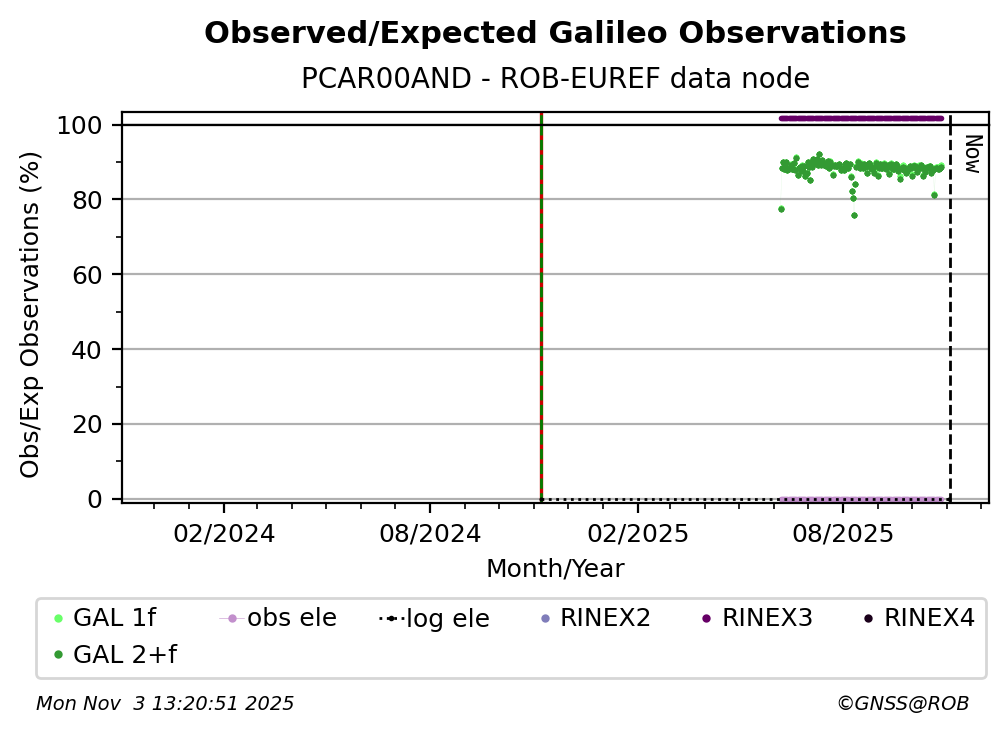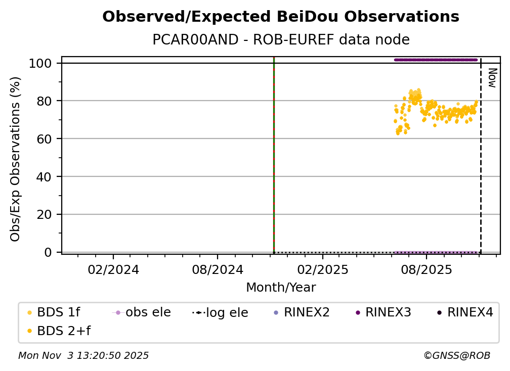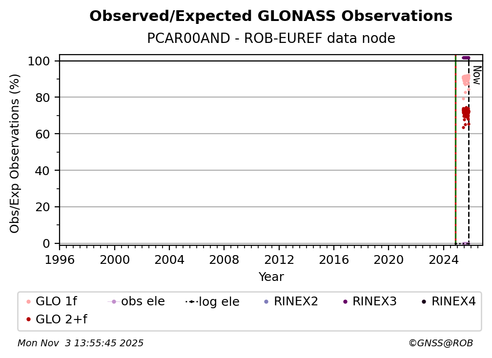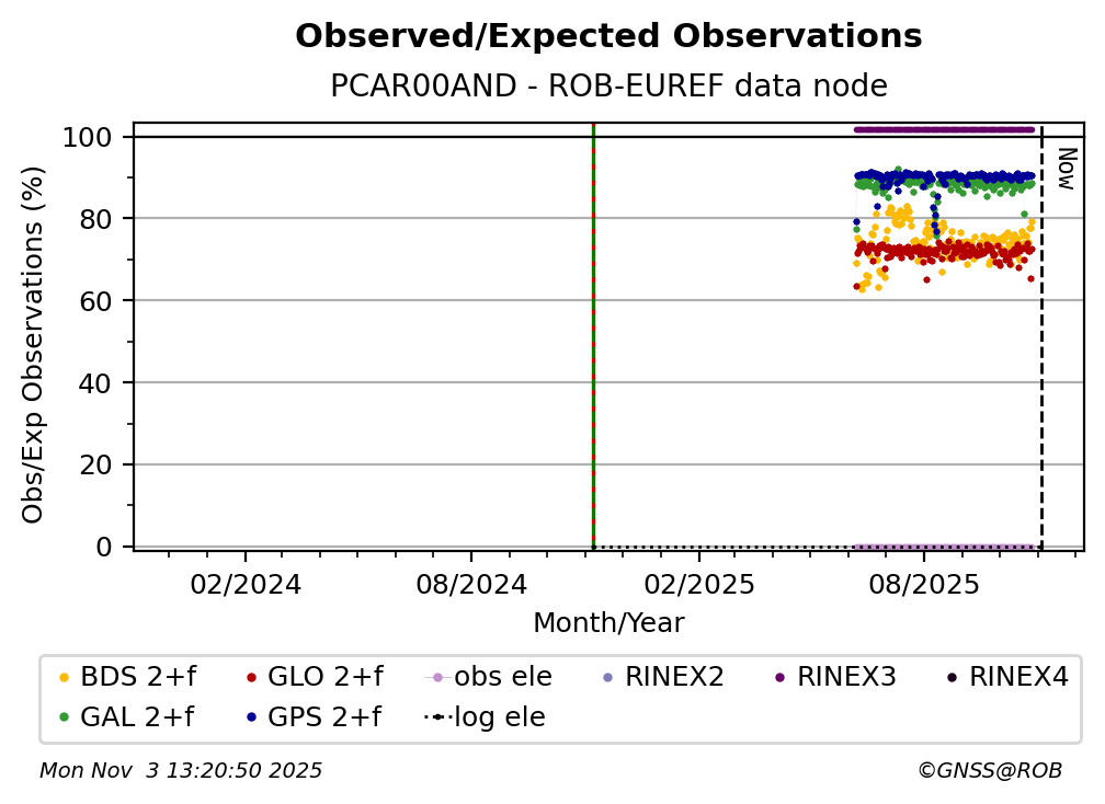 The percentage corresponds, for each constellation tracked by the station, to the ratio of the number of observations in the daily RINEX file with respect to the number of expected observations: