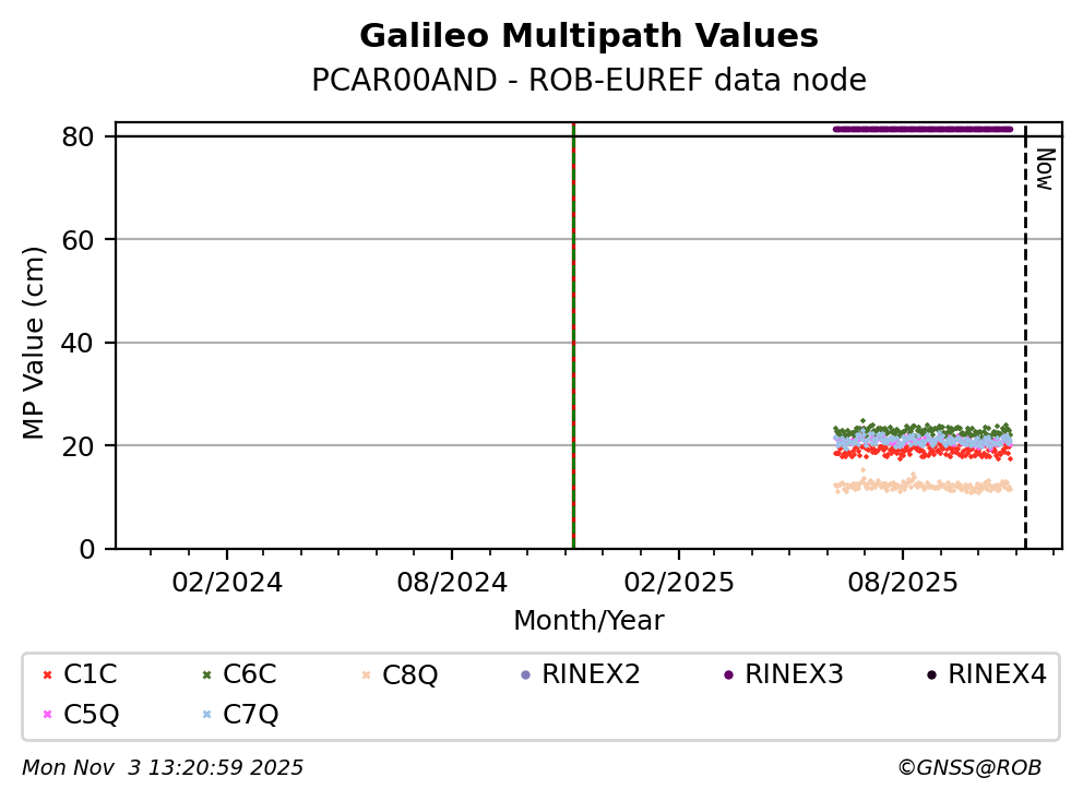 These plots display the daily mean of code multipath per frequency band and satellite constellation. Code multipath statistics are calculated for all pseudorange codes of all GNSS satellites providing dual-frequency carrier-phase observations. The code multipath characterizes the quality of the observed signal and the site environment.