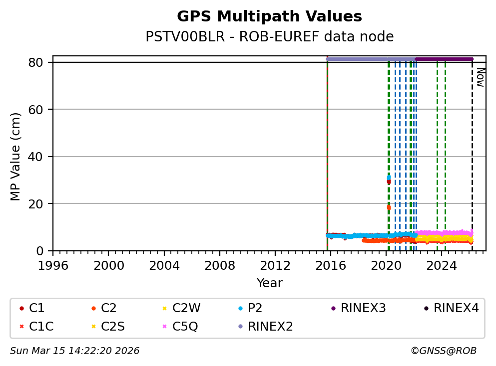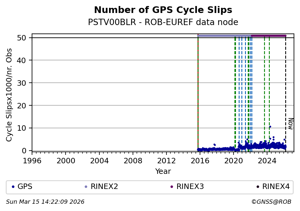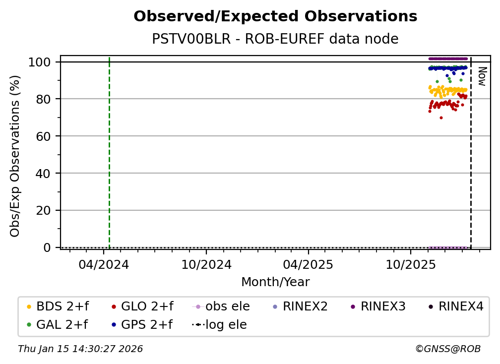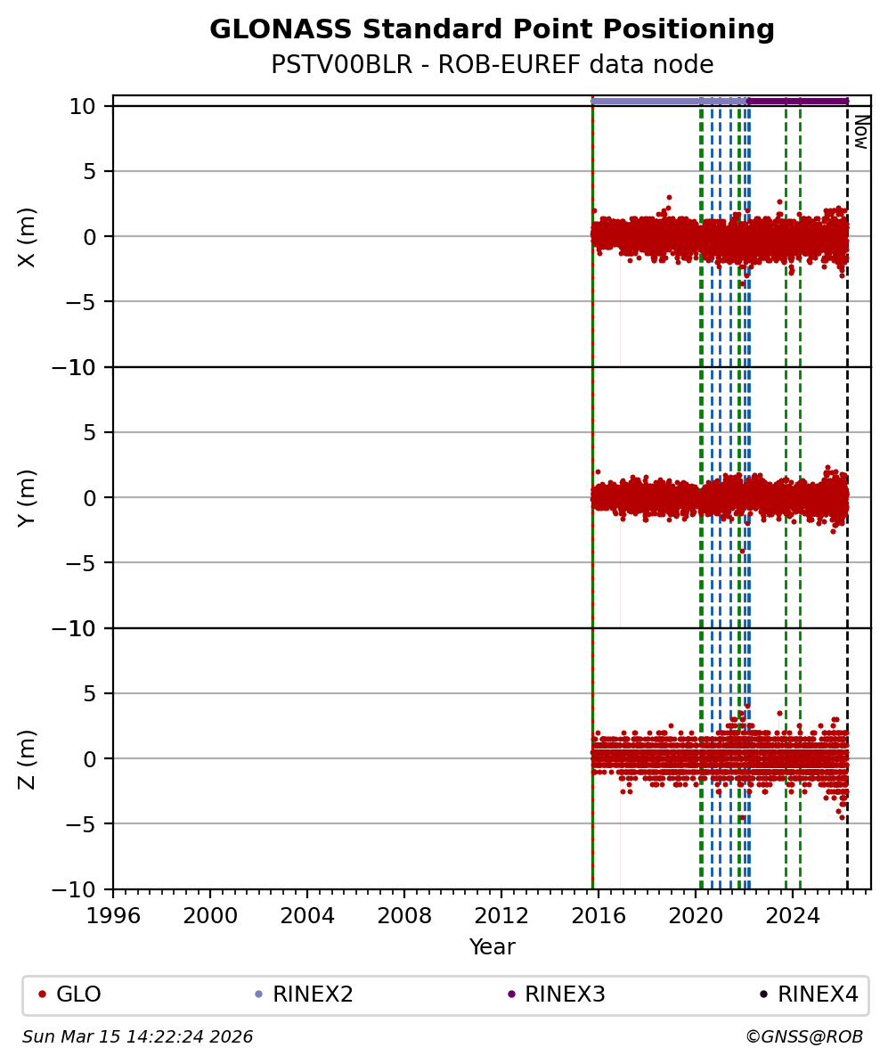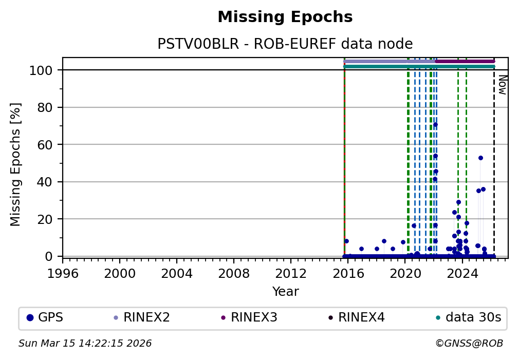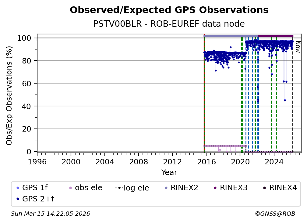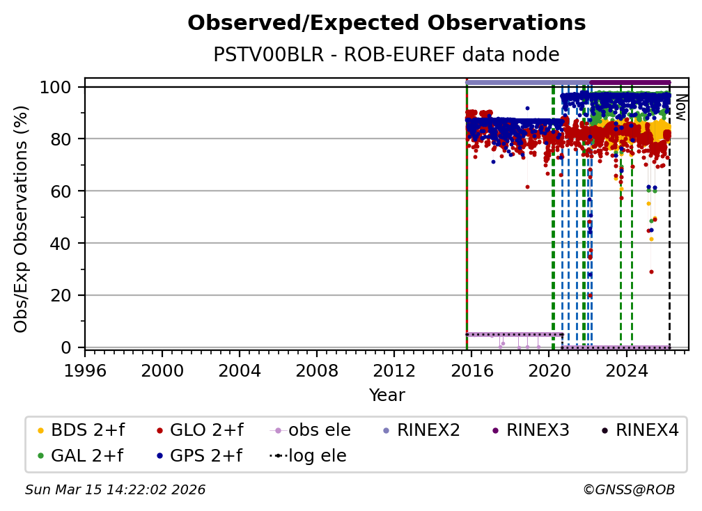 The plots below present the long-term tracking performance of the EPOS-GNSS station PSTV00BLR based on the daily RINEX data available from the ROB-EUREF EPOS-GNSS data node. The data quality metrics have been computed at the data node using the G-Nut/Anubis software.