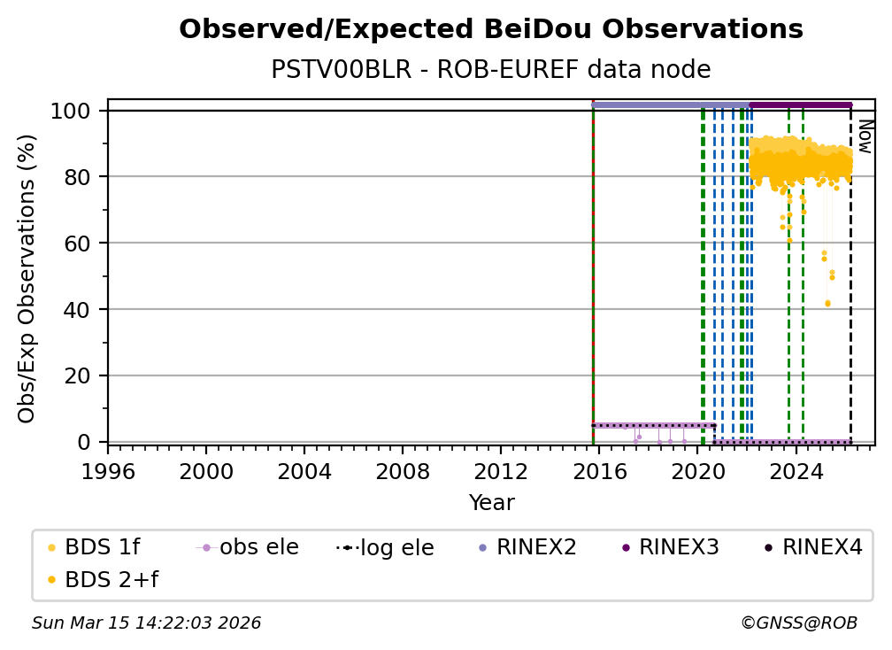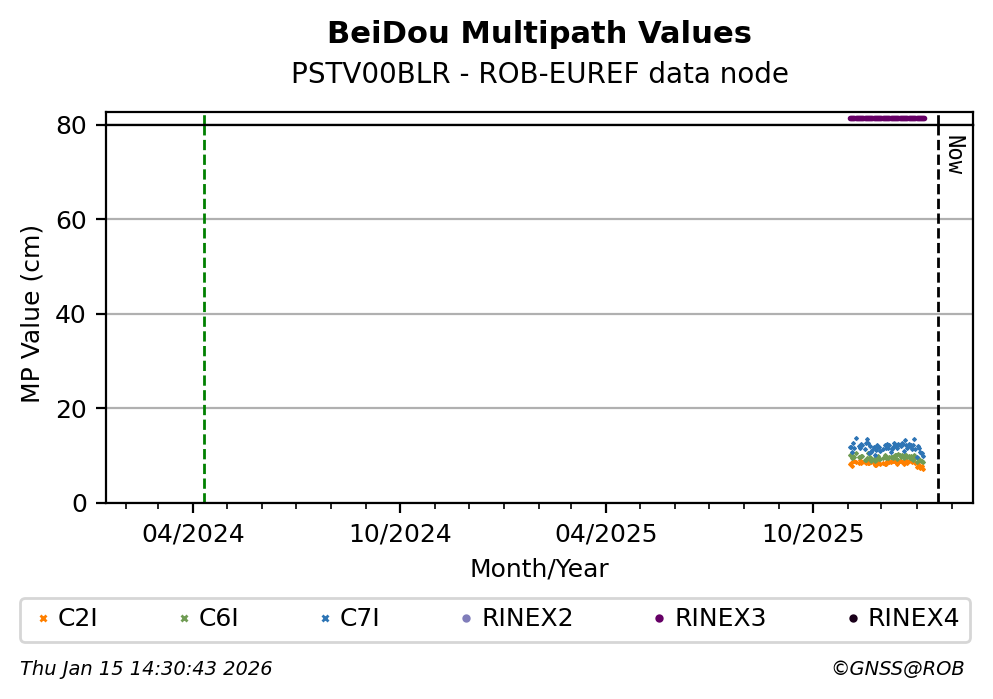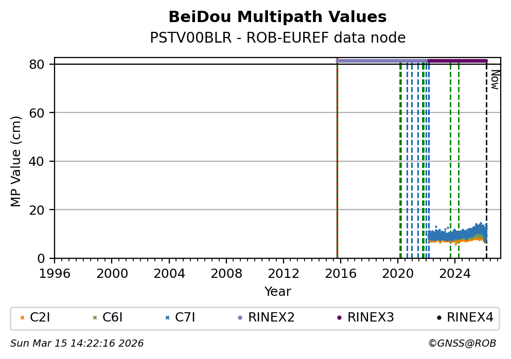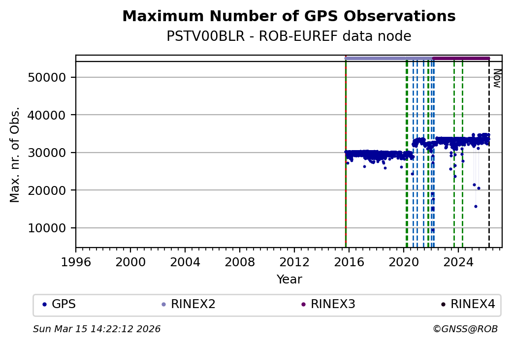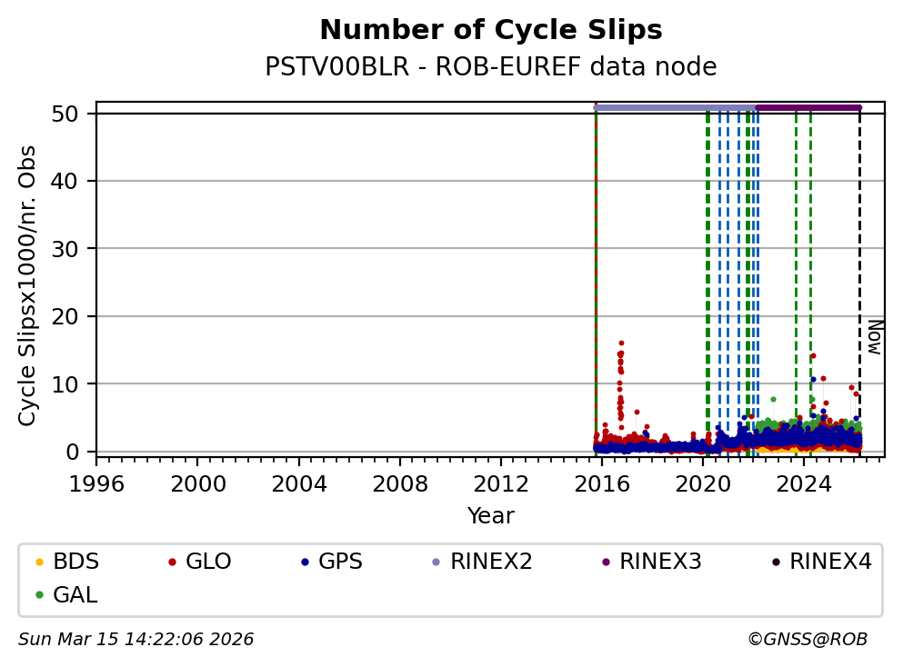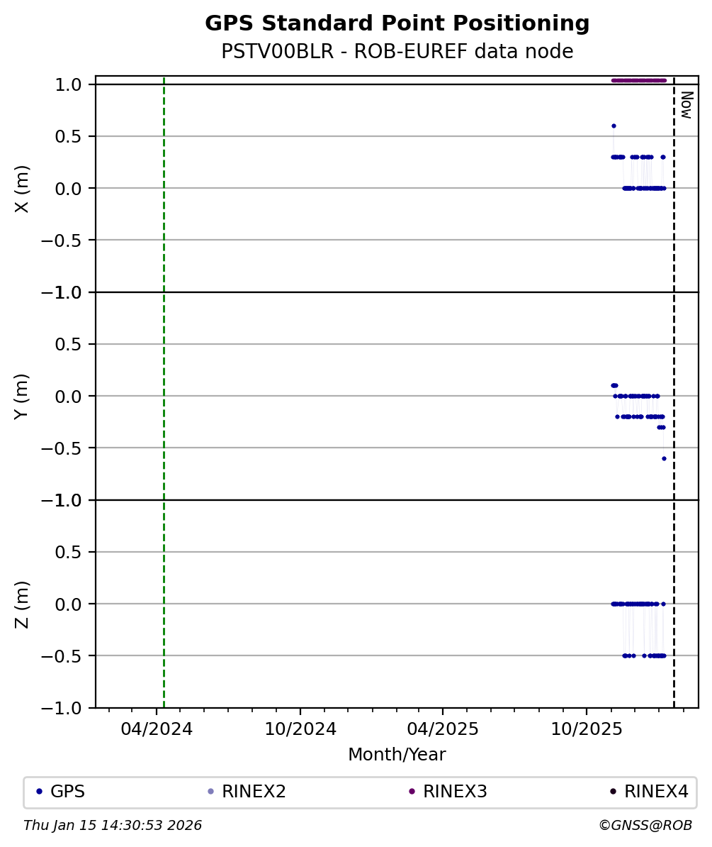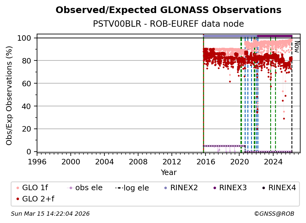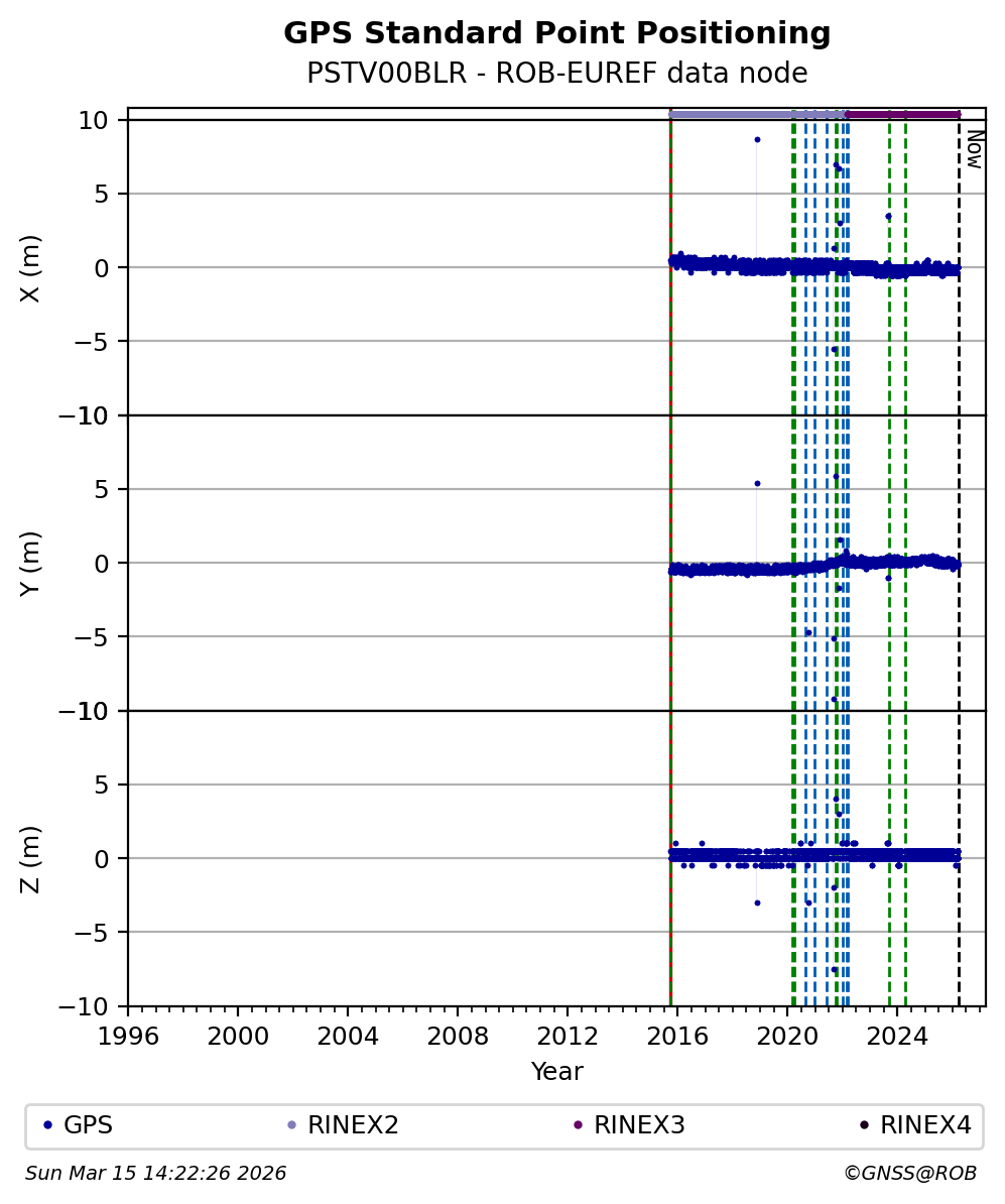 The plots below present the long-term tracking performance of the EPOS-GNSS station PSTV00BLR based on the daily RINEX data available from the ROB-EUREF EPOS-GNSS data node. The data quality metrics have been computed at the data node using the G-Nut/Anubis software.