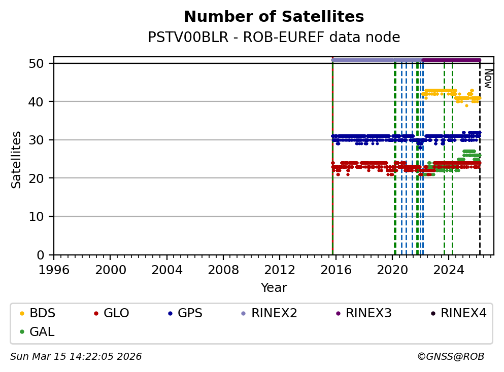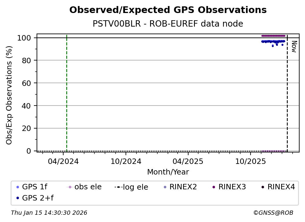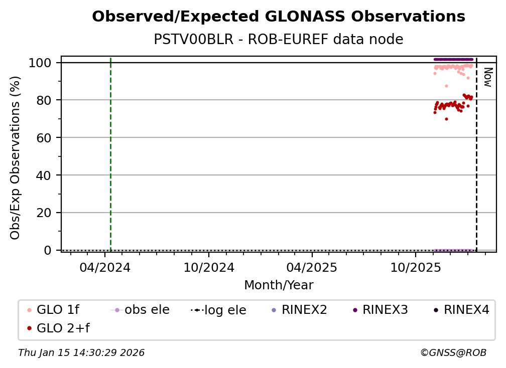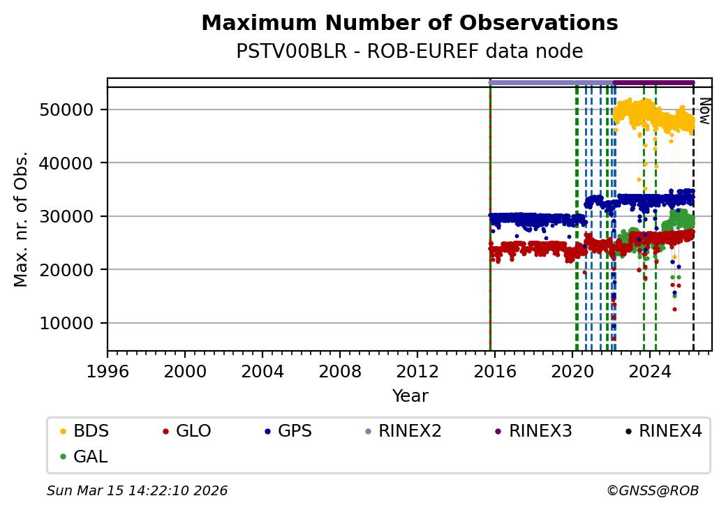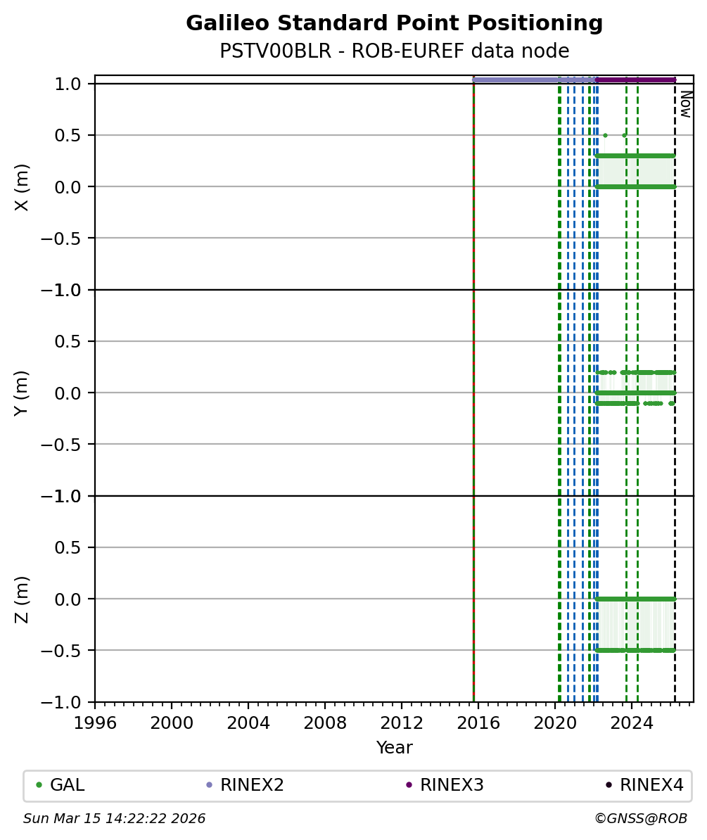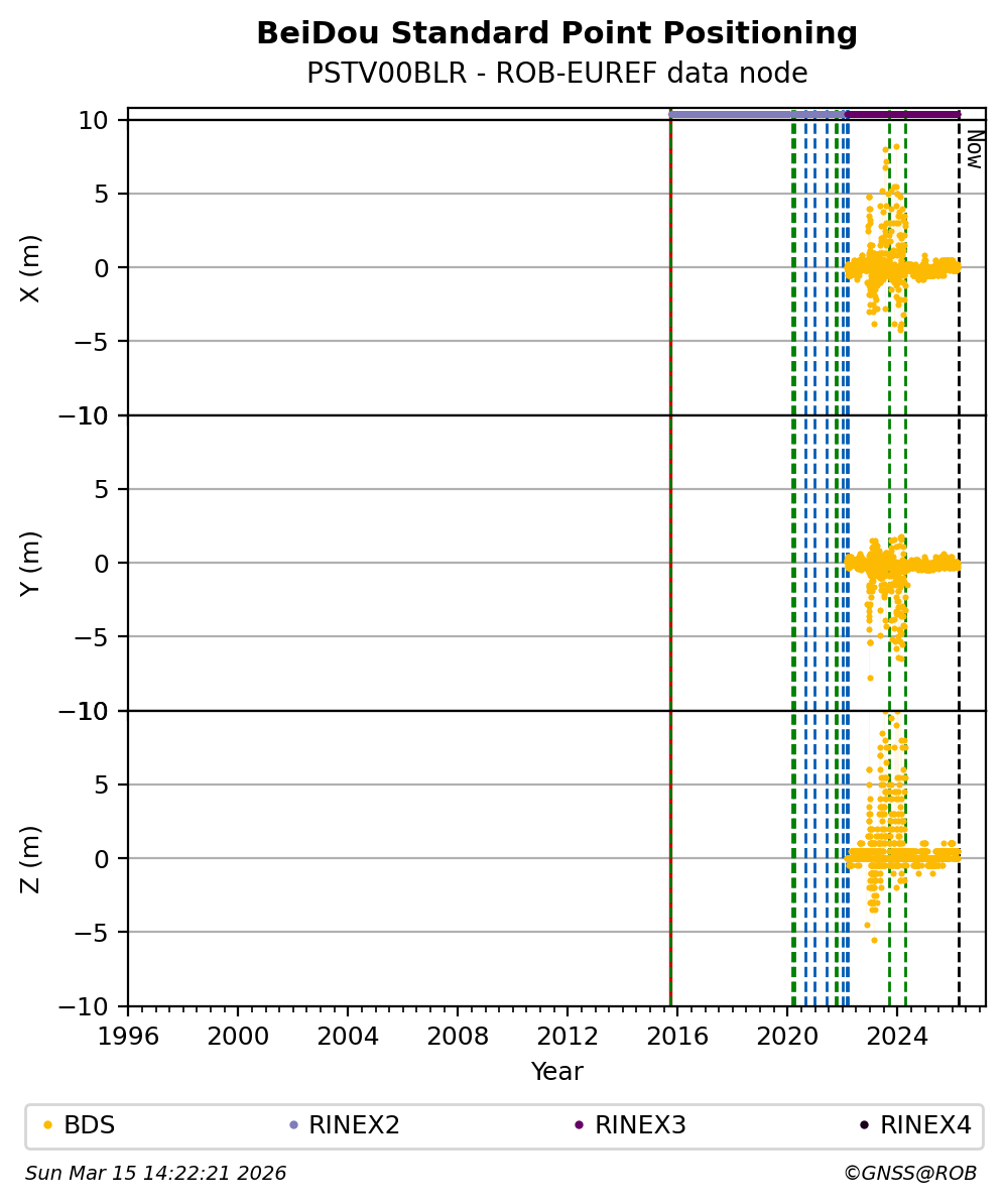 The plots below present the long-term tracking performance of the EPOS-GNSS station PSTV00BLR based on the daily RINEX data available from the ROB-EUREF EPOS-GNSS data node. The data quality metrics have been computed at the data node using the G-Nut/Anubis software.