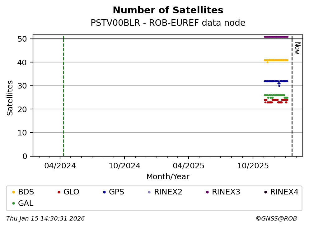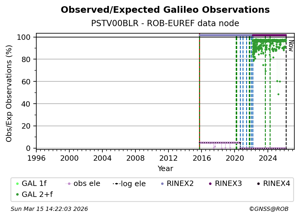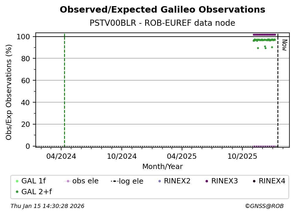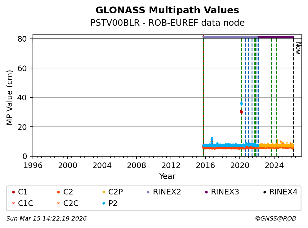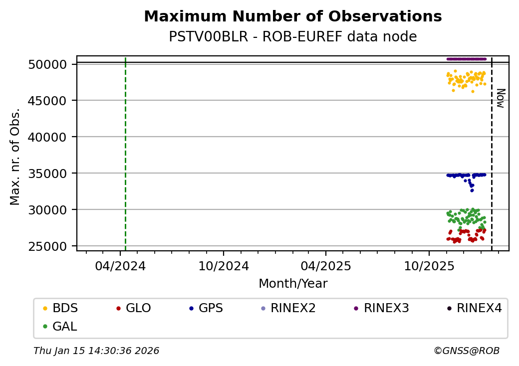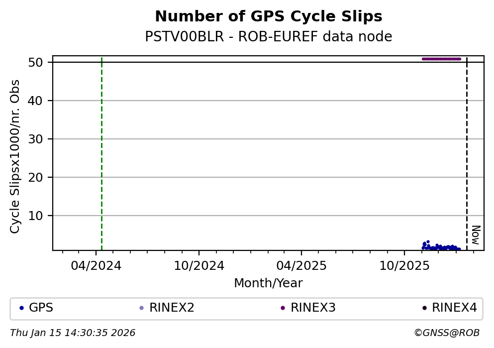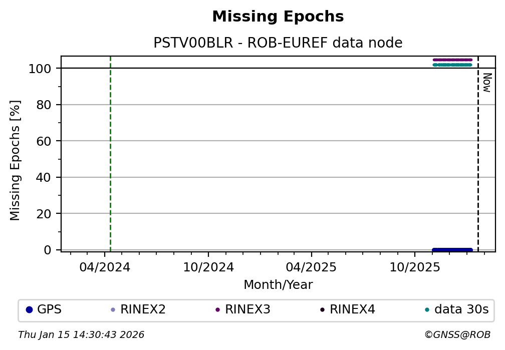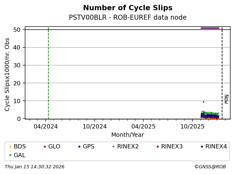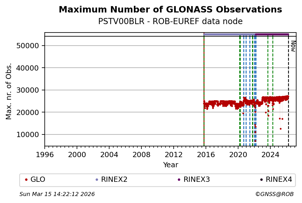 The plots below present the long-term tracking performance of the EPOS-GNSS station PSTV00BLR based on the daily RINEX data available from the ROB-EUREF EPOS-GNSS data node. The data quality metrics have been computed at the data node using the G-Nut/Anubis software.