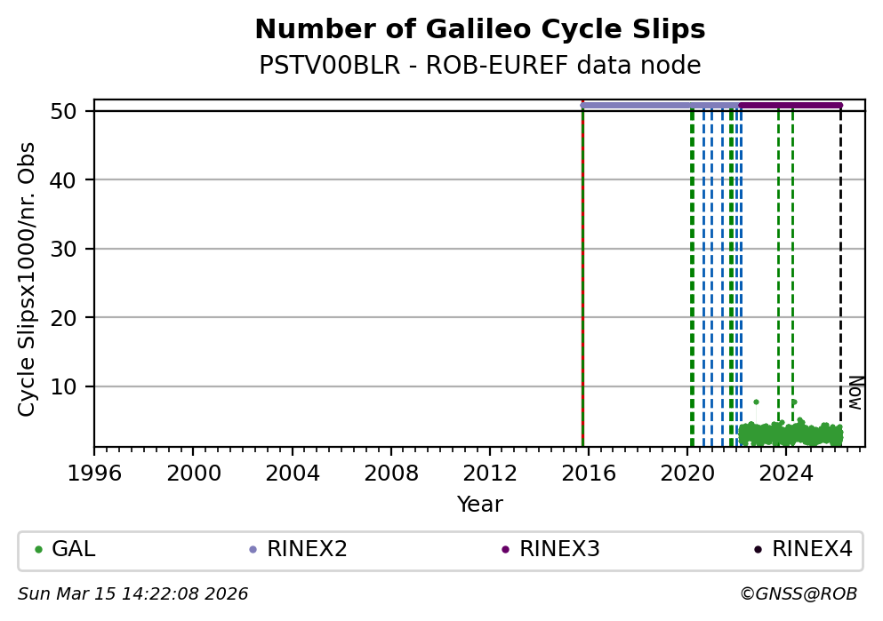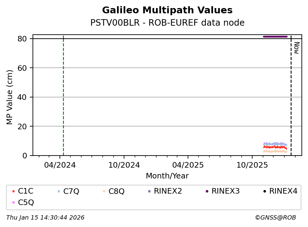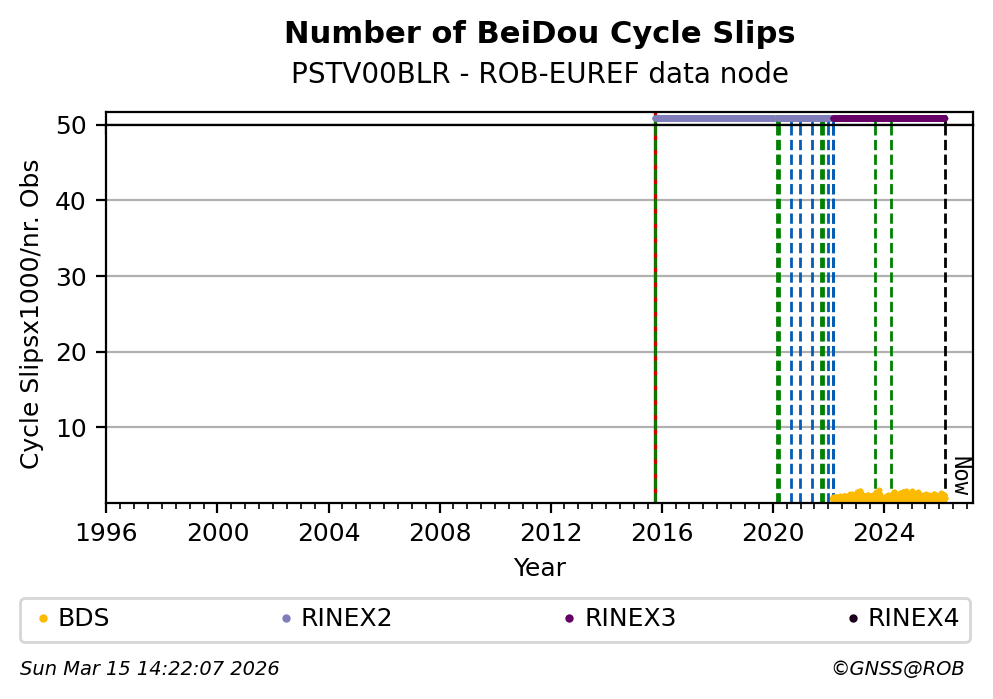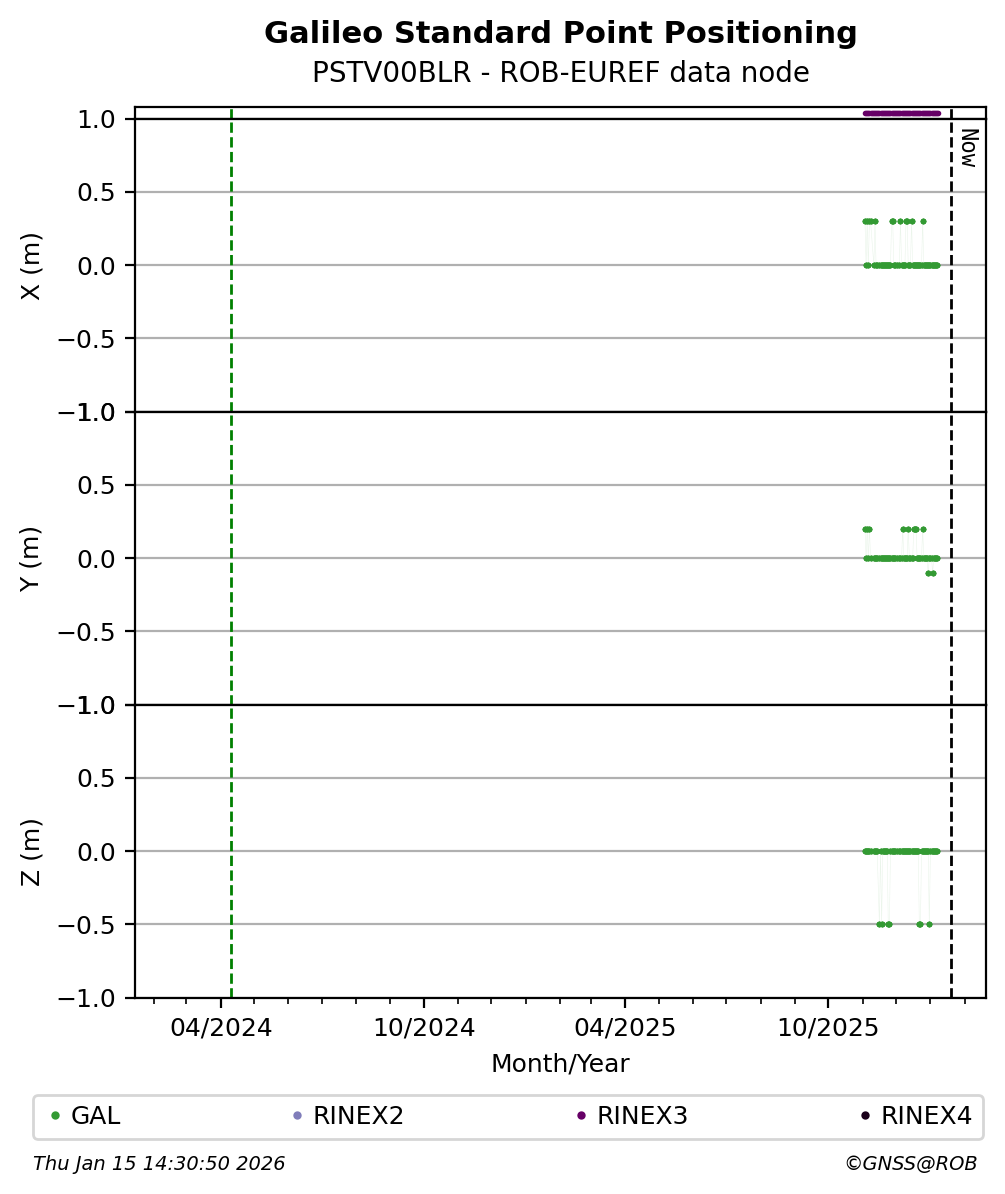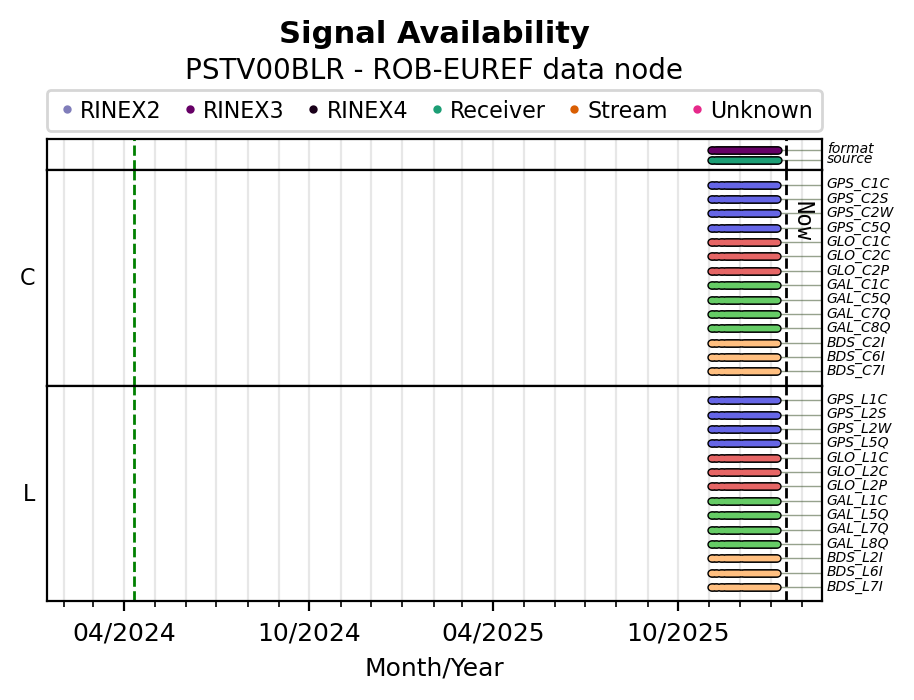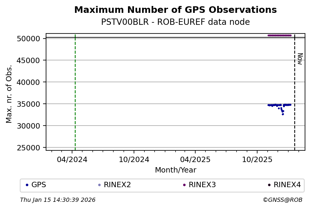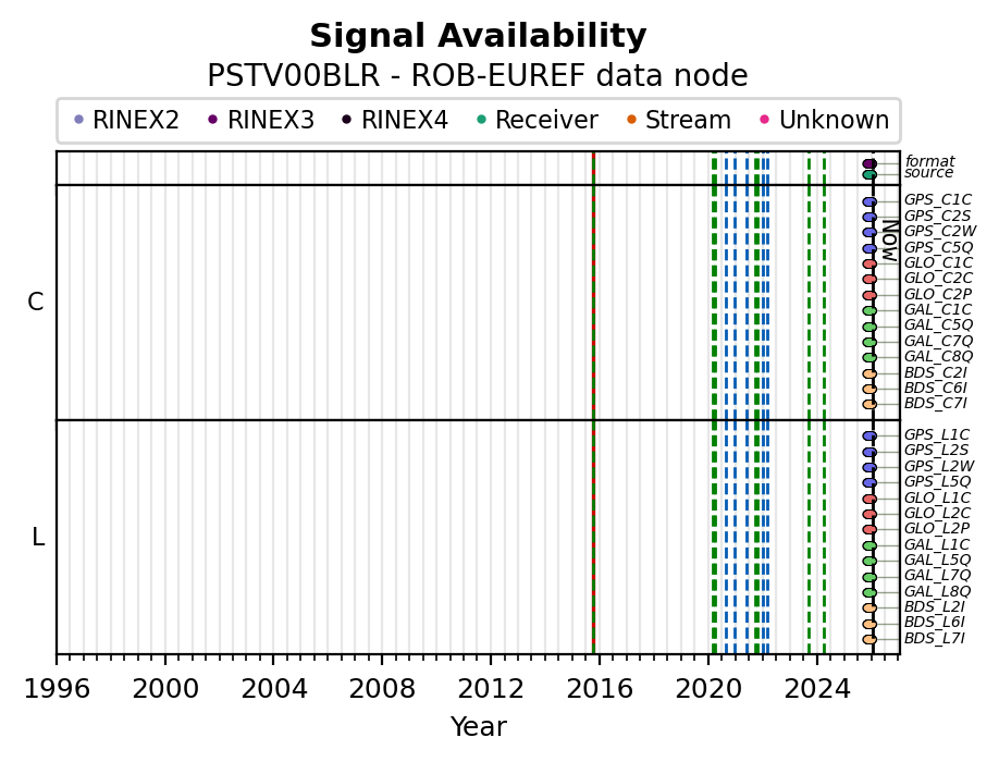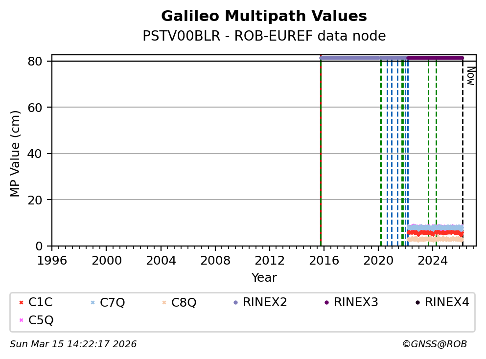 The plots below present the long-term tracking performance of the EPOS-GNSS station PSTV00BLR based on the daily RINEX data available from the ROB-EUREF EPOS-GNSS data node. The data quality metrics have been computed at the data node using the G-Nut/Anubis software.