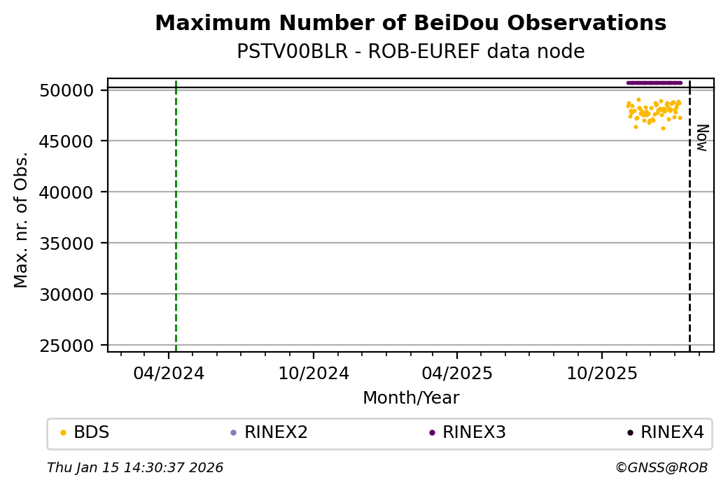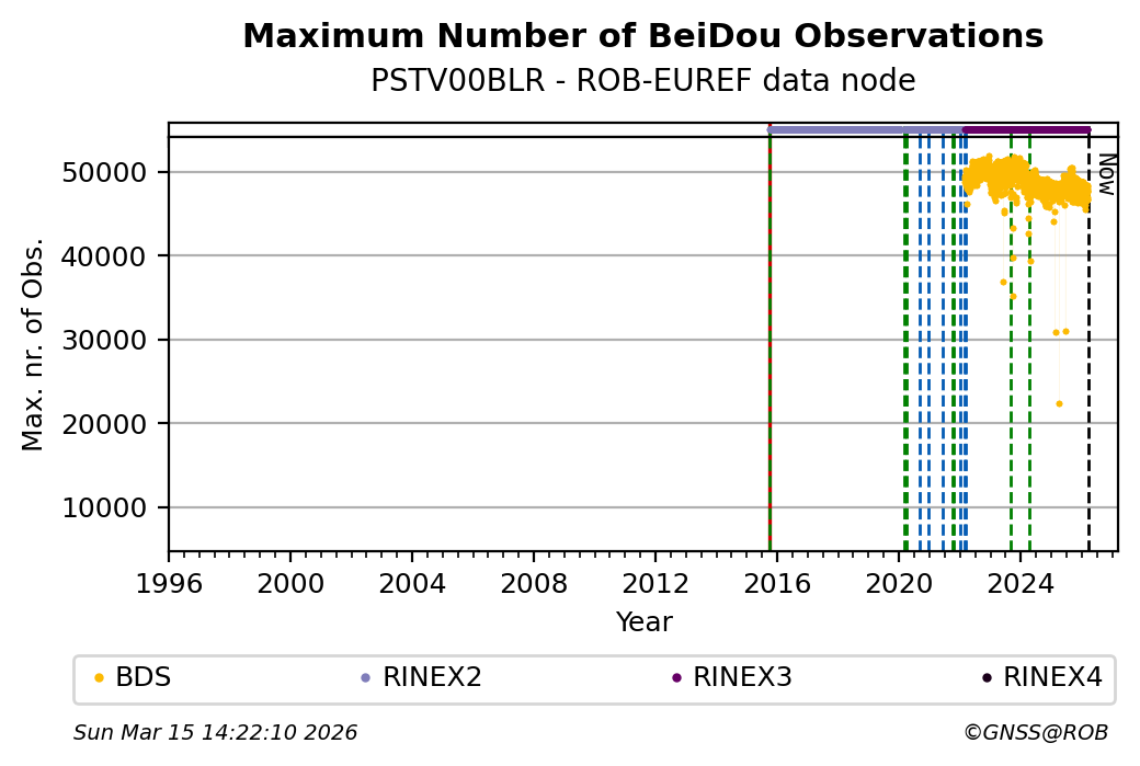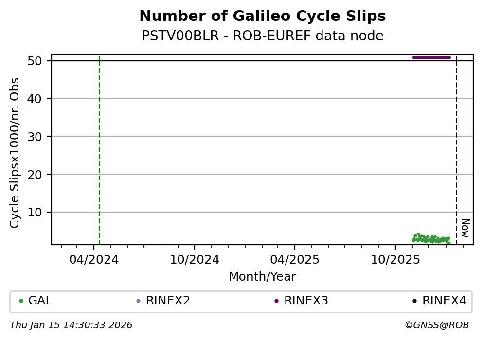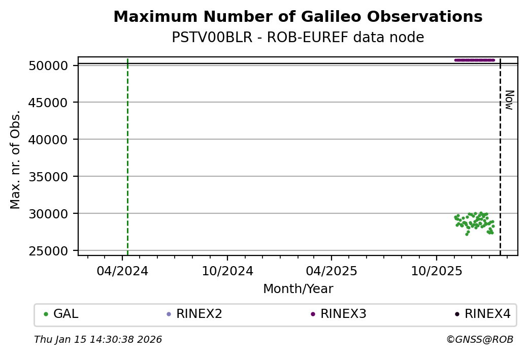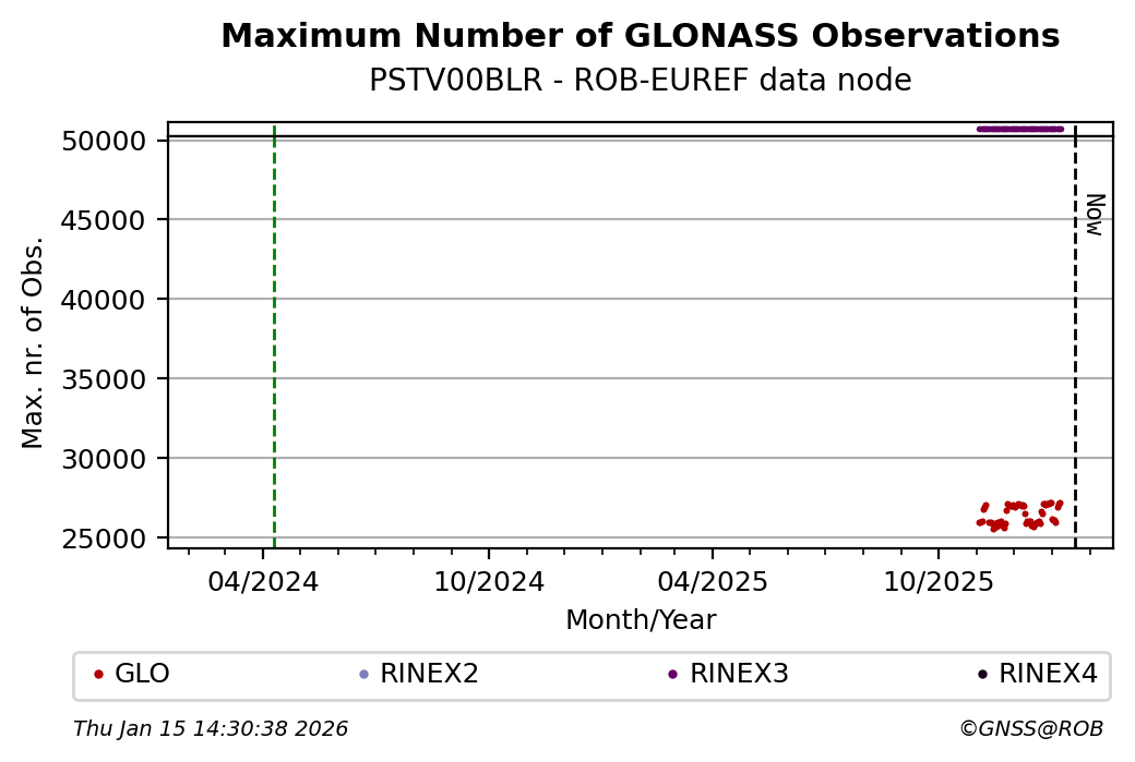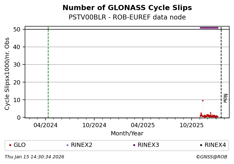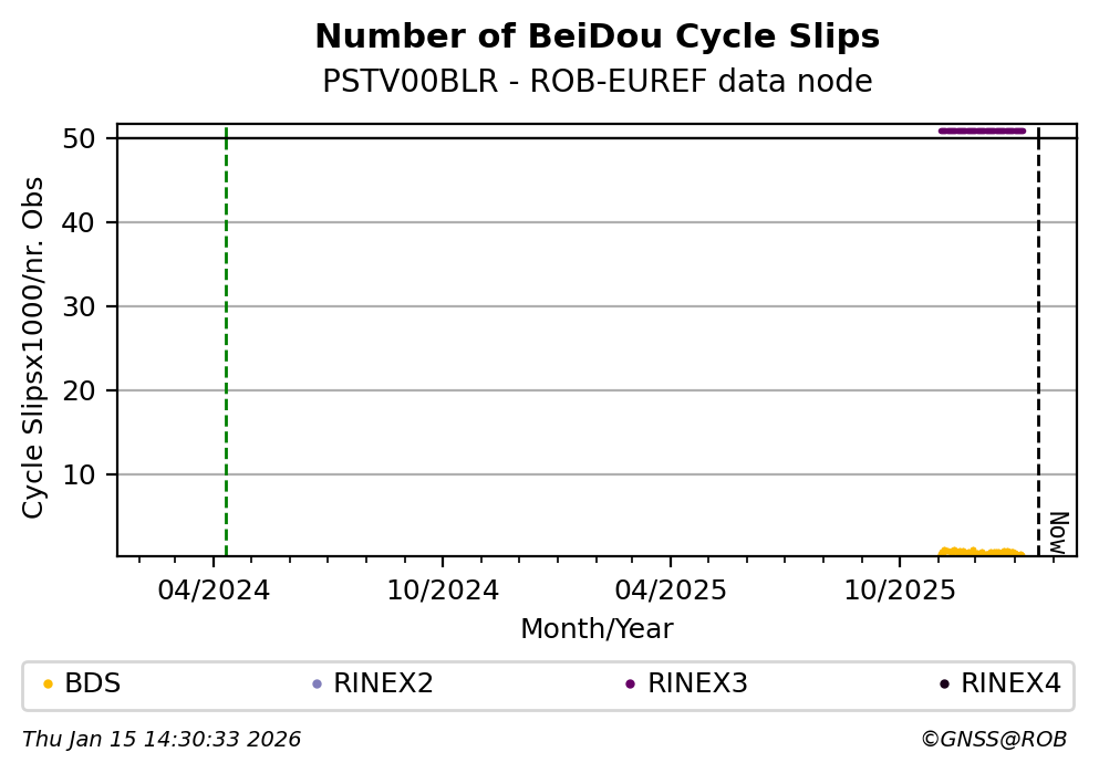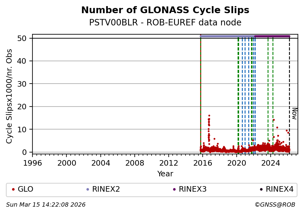 The plots below present the long-term tracking performance of the EPOS-GNSS station PSTV00BLR based on the daily RINEX data available from the ROB-EUREF EPOS-GNSS data node. The data quality metrics have been computed at the data node using the G-Nut/Anubis software.