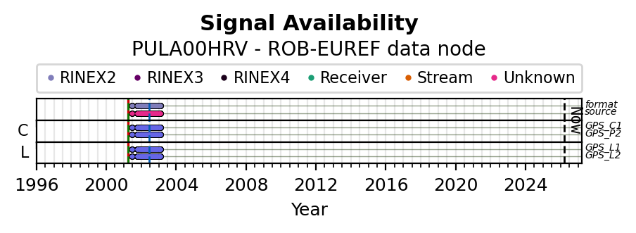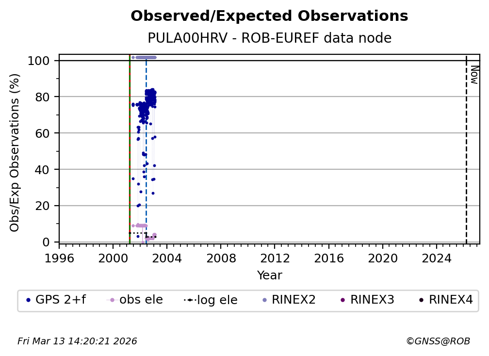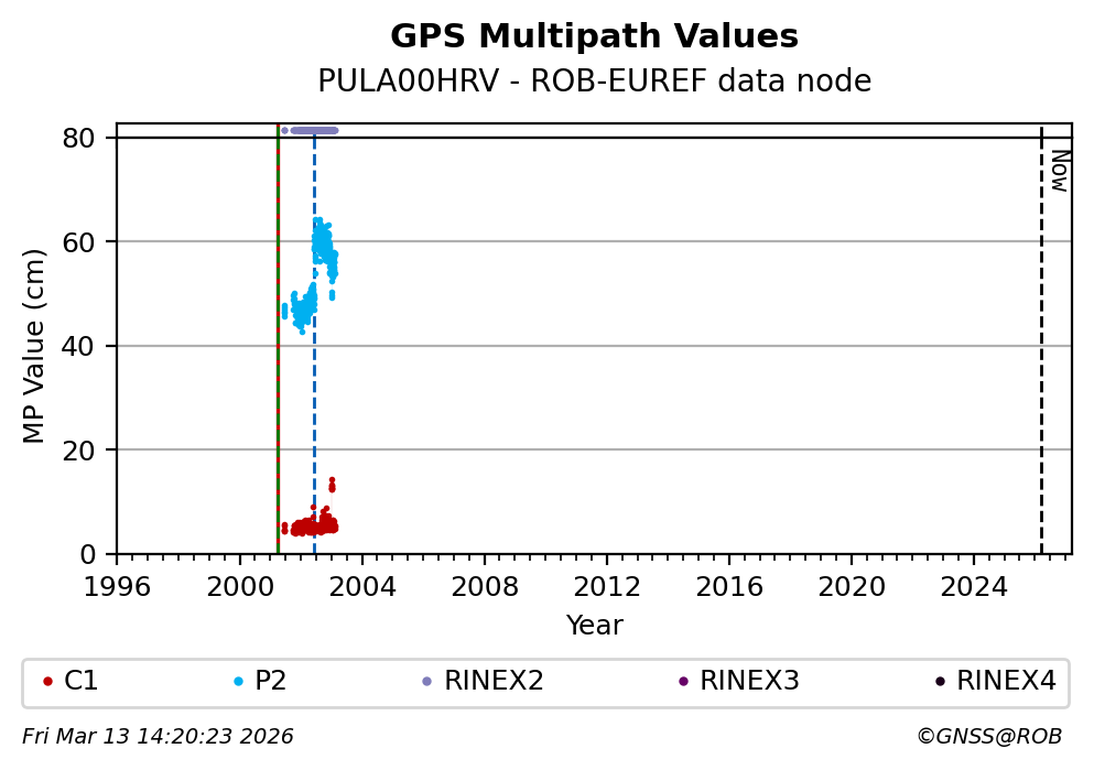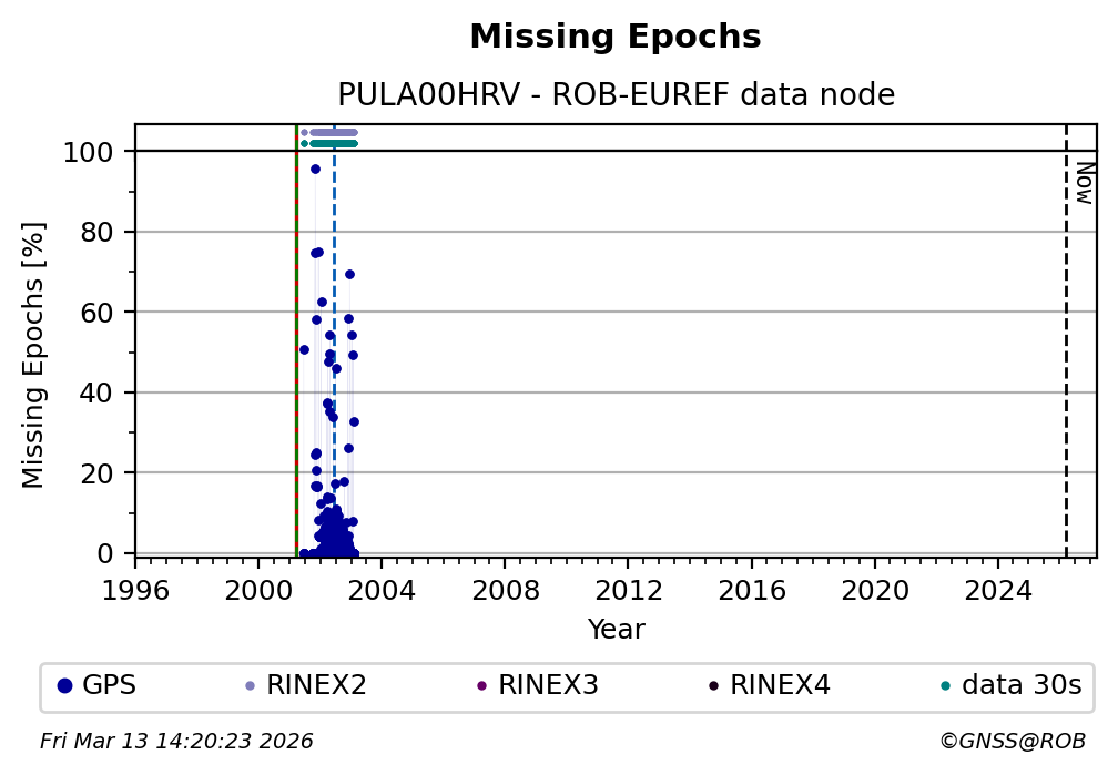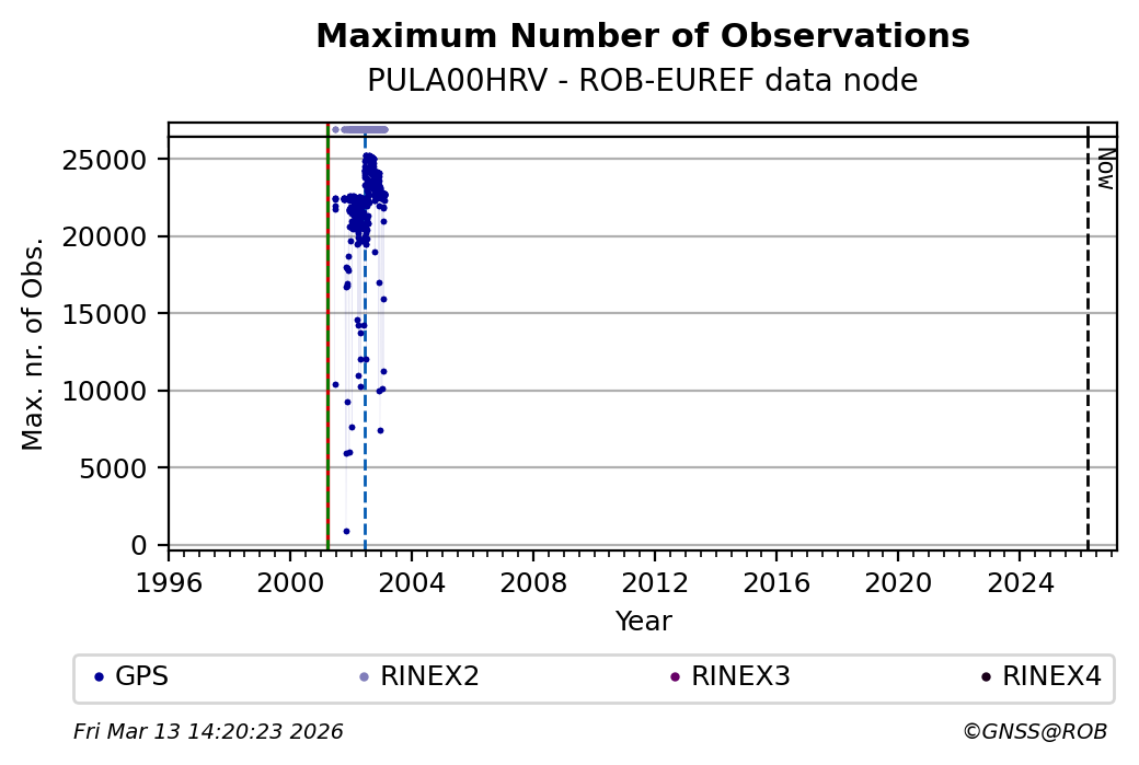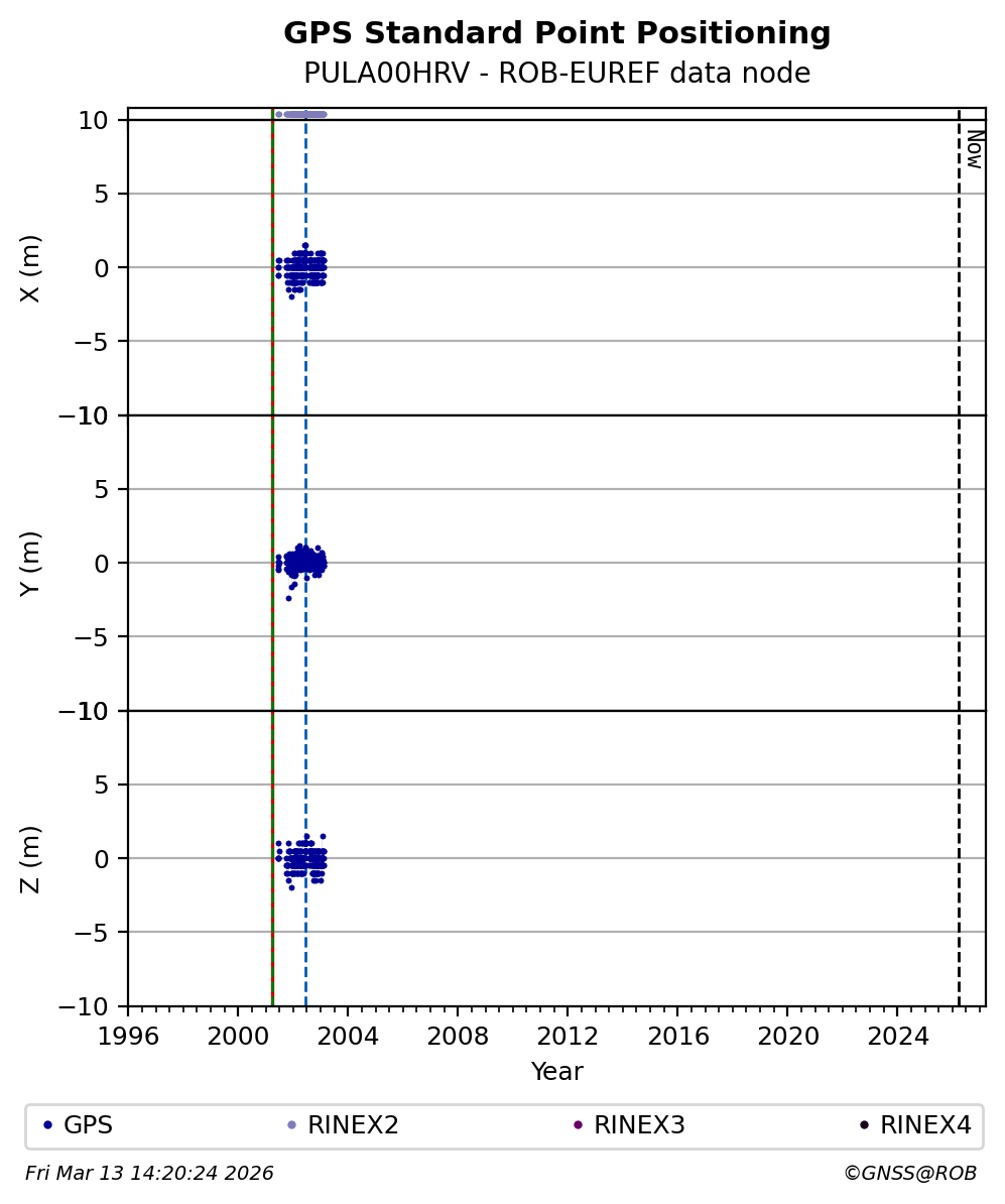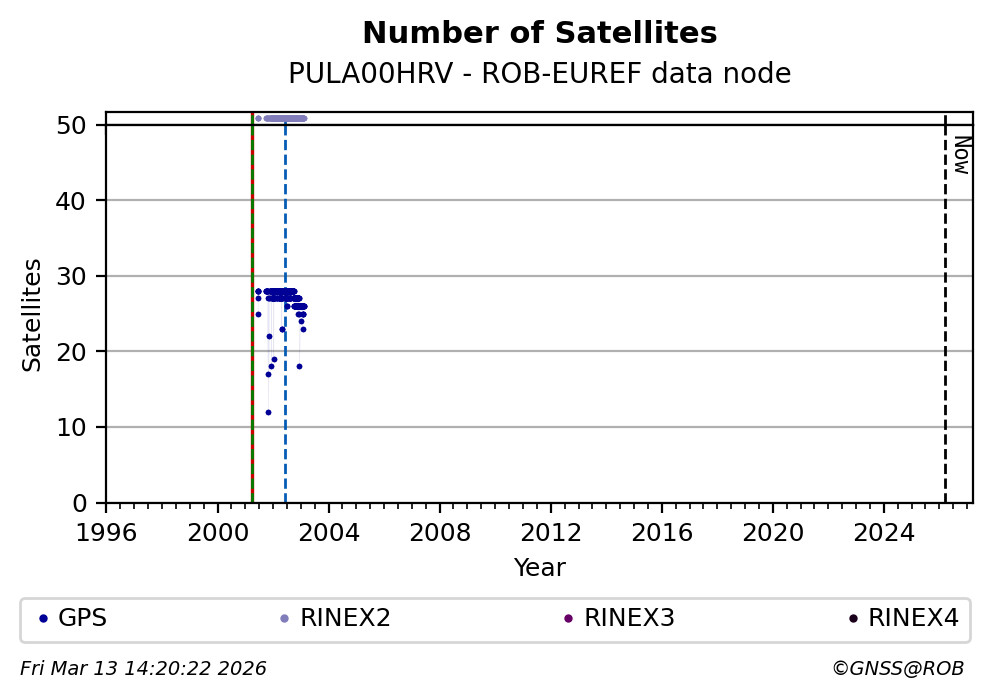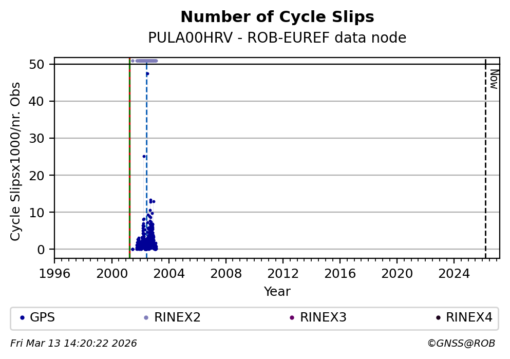The plots below present the long-term tracking performance of the EPOS-GNSS station PULA00HRV based on the daily RINEX data available from the ROB-EUREF EPOS-GNSS data node. The data quality metrics have been computed at the data node using the G-Nut/Anubis software. Input files are the daily RINEX (V2 or V3) observation files available from ROB-EUREF EPOS-GNSS data node.