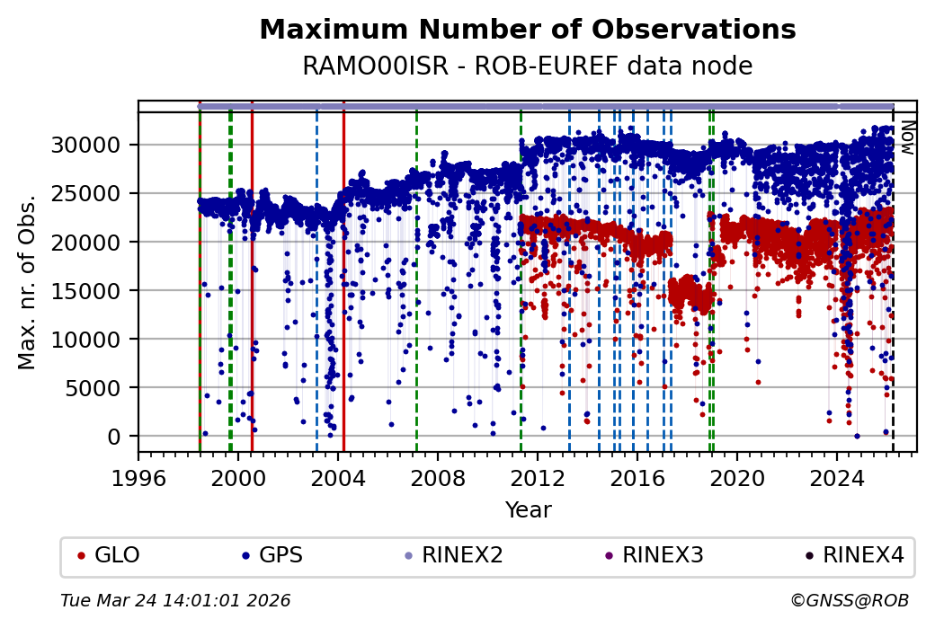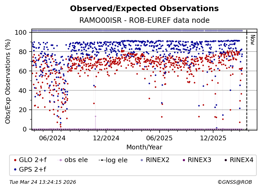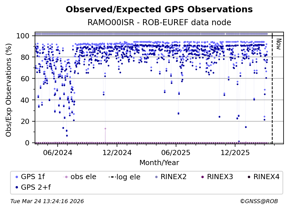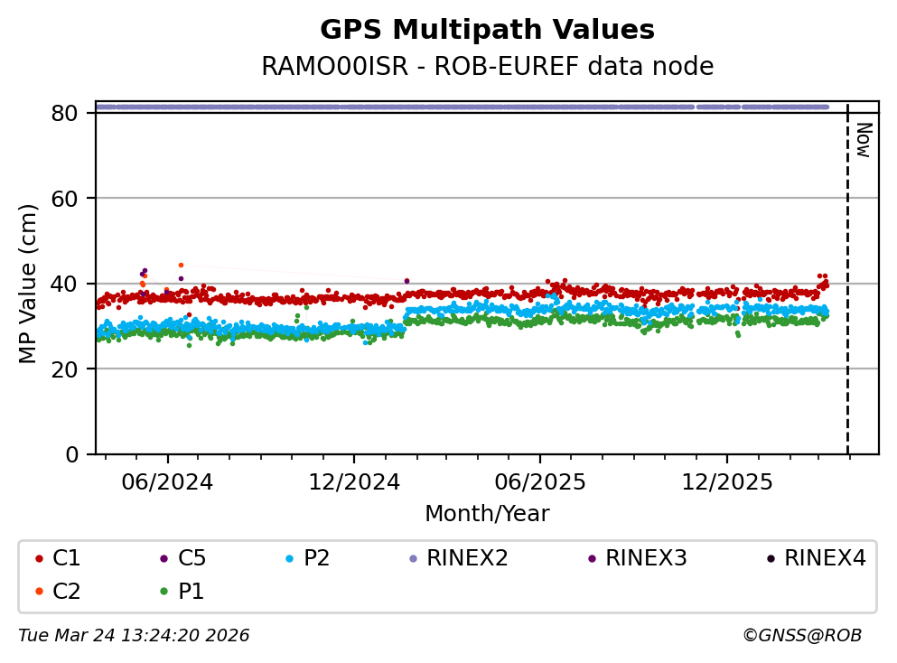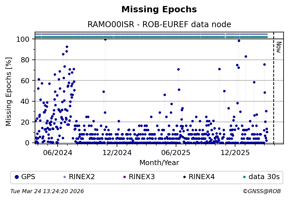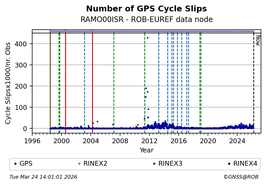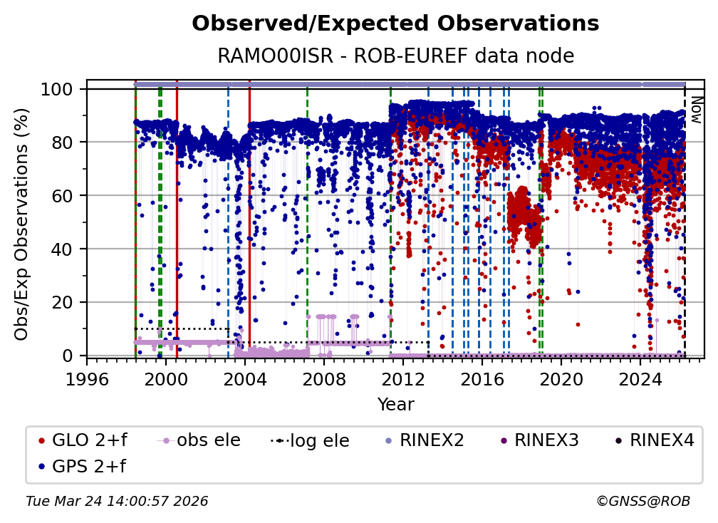 The plots below present the long-term tracking performance of the EPOS-GNSS station RAMO00ISR based on the daily RINEX data available from the ROB-EUREF EPOS-GNSS data node. The data quality metrics have been computed at the data node using the G-Nut/Anubis software.
