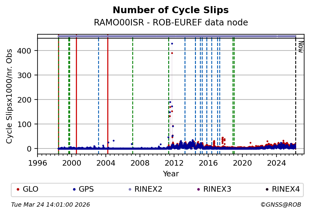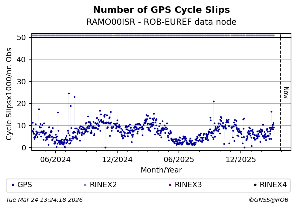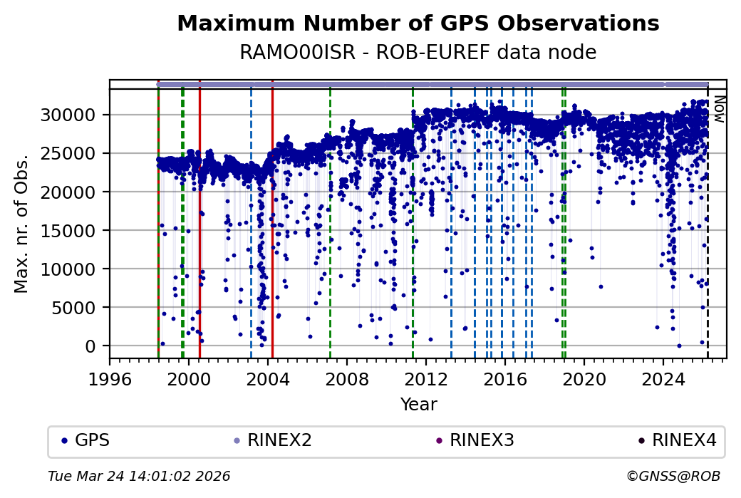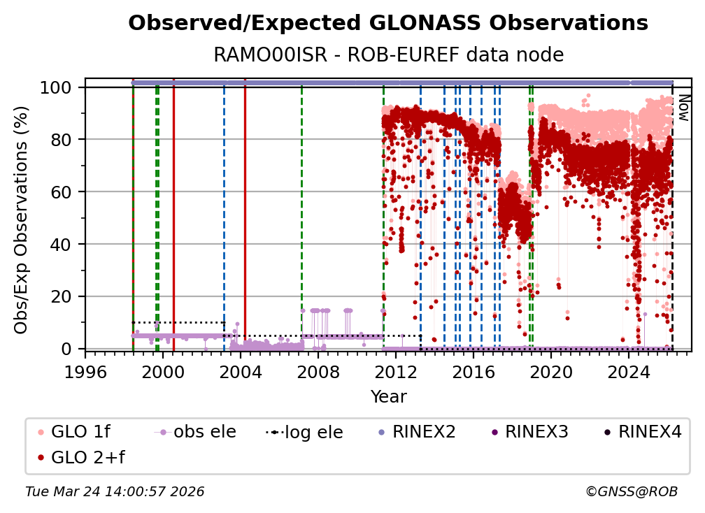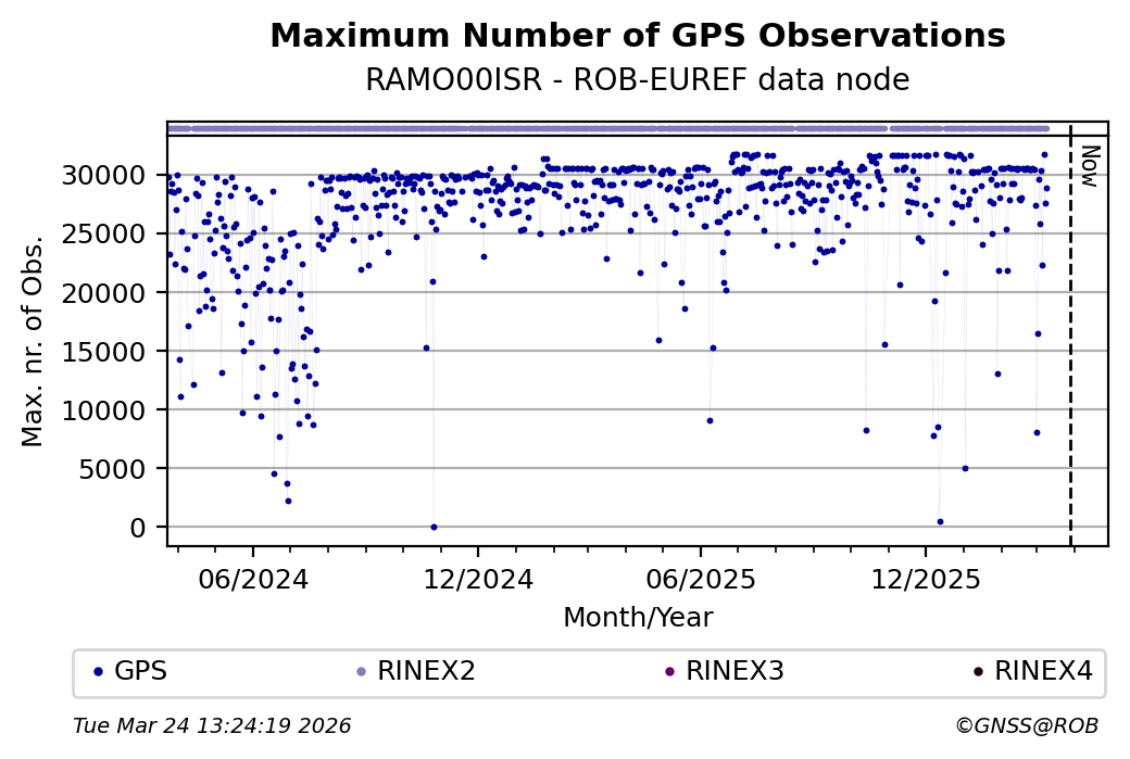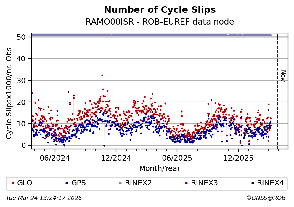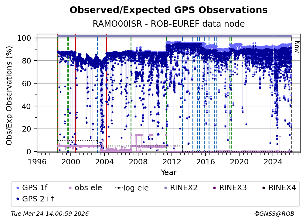 The plots below present the long-term tracking performance of the EPOS-GNSS station RAMO00ISR based on the daily RINEX data available from the ROB-EUREF EPOS-GNSS data node. The data quality metrics have been computed at the data node using the G-Nut/Anubis software.