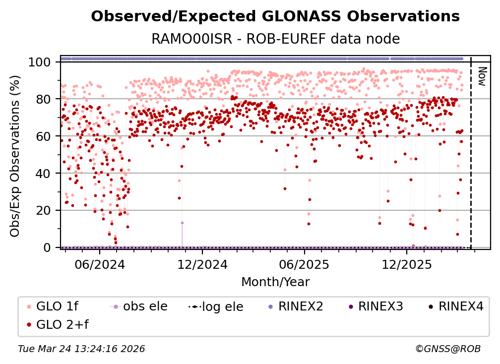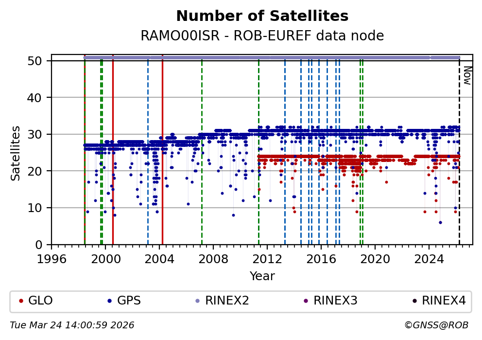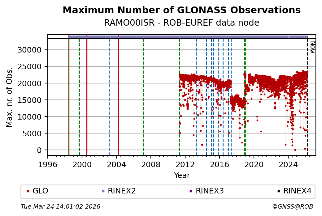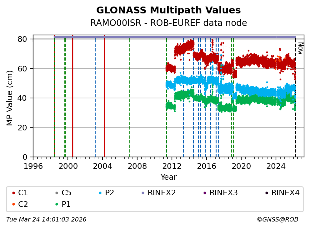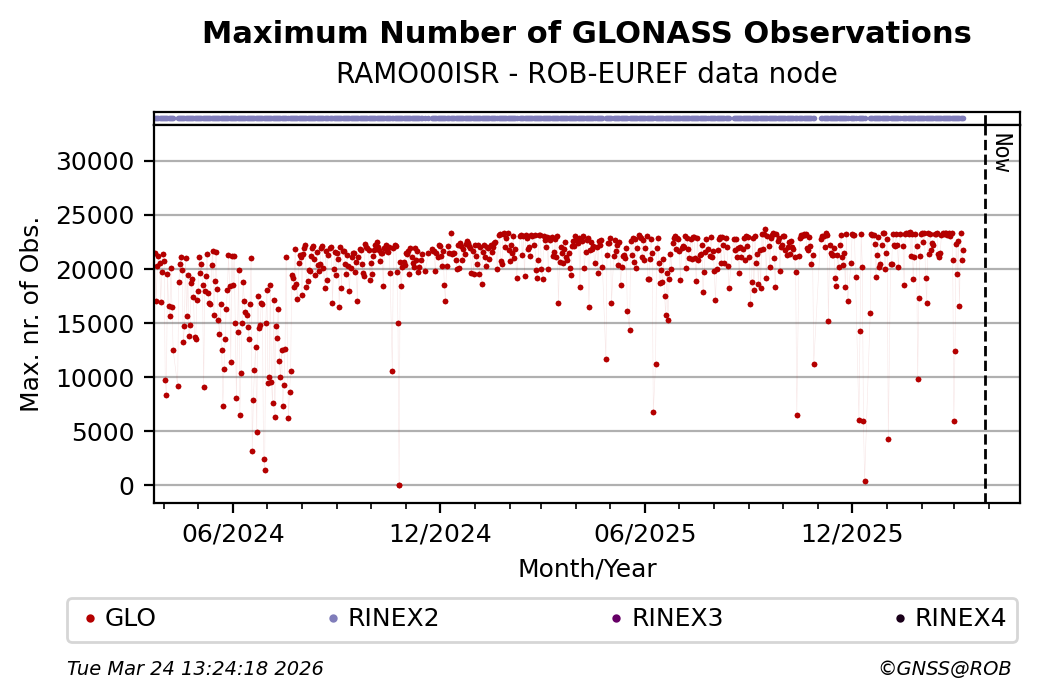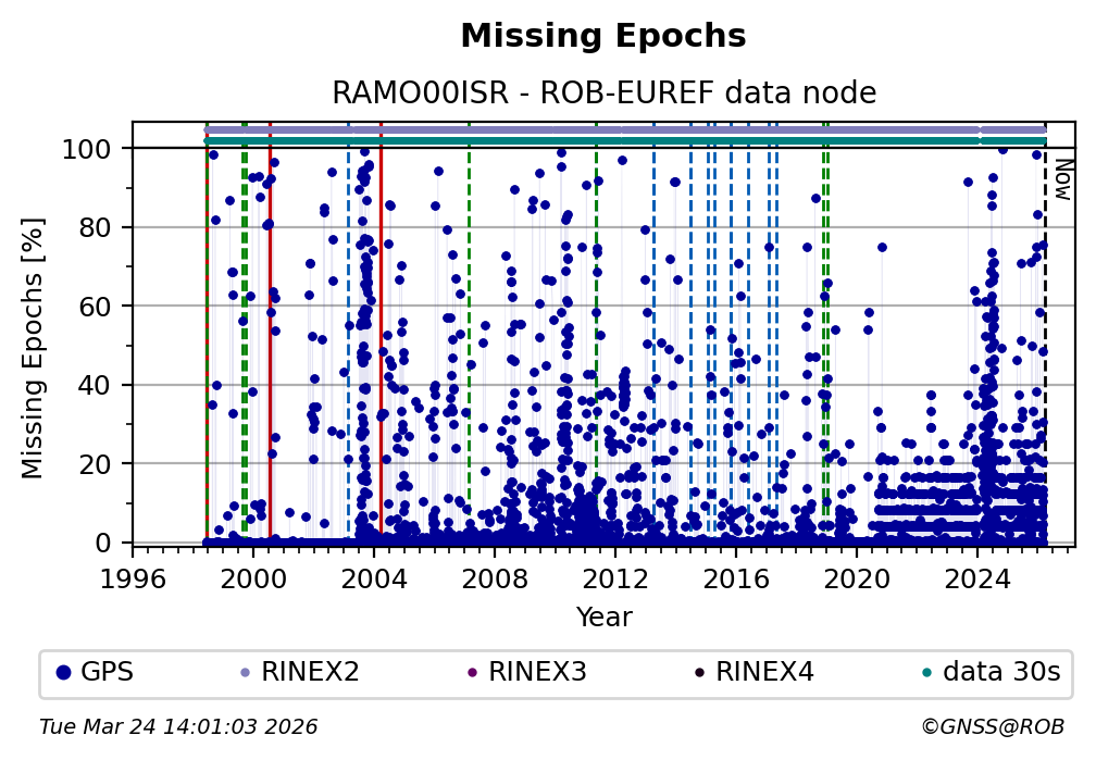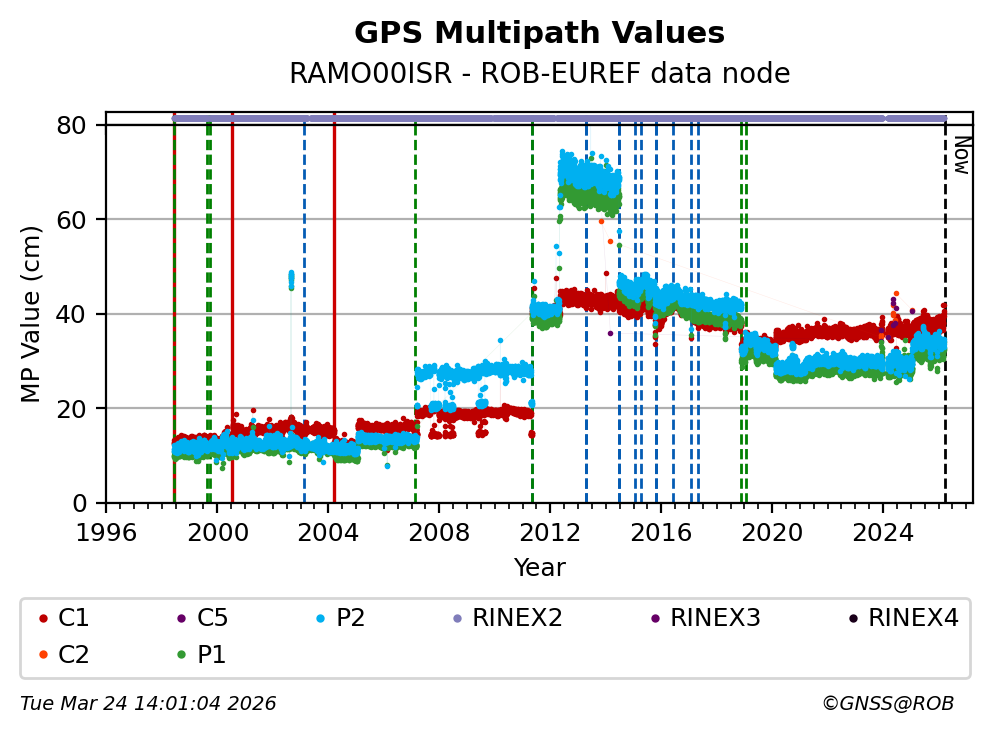 The plots below present the long-term tracking performance of the EPOS-GNSS station RAMO00ISR based on the daily RINEX data available from the ROB-EUREF EPOS-GNSS data node. The data quality metrics have been computed at the data node using the G-Nut/Anubis software.