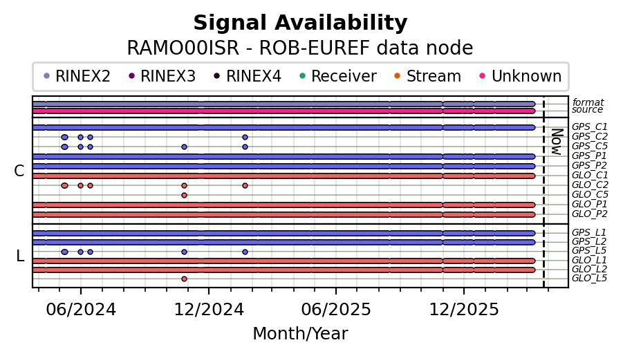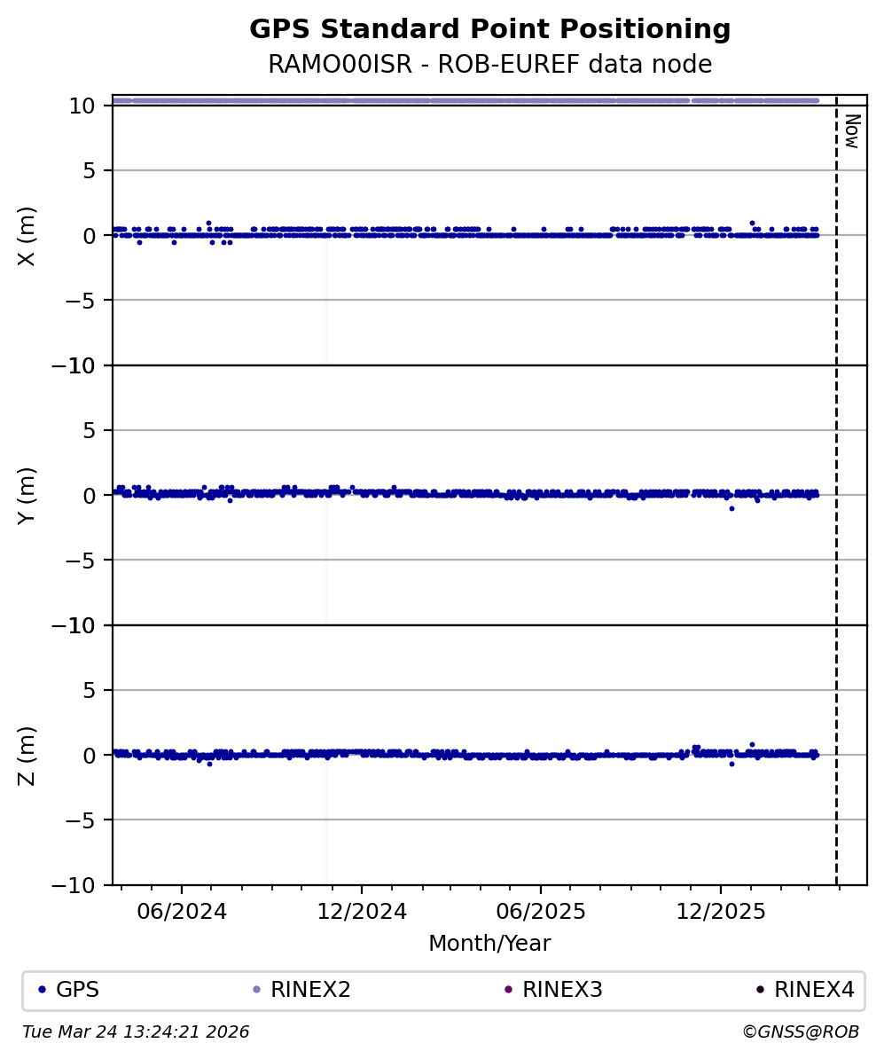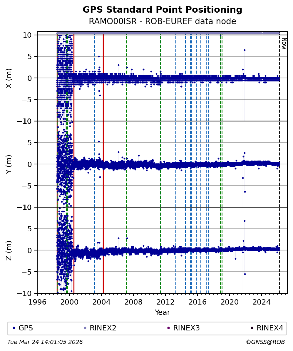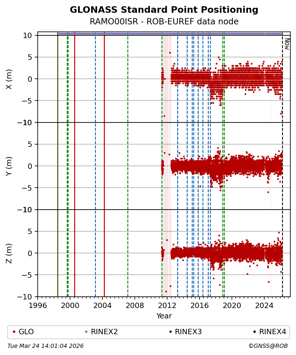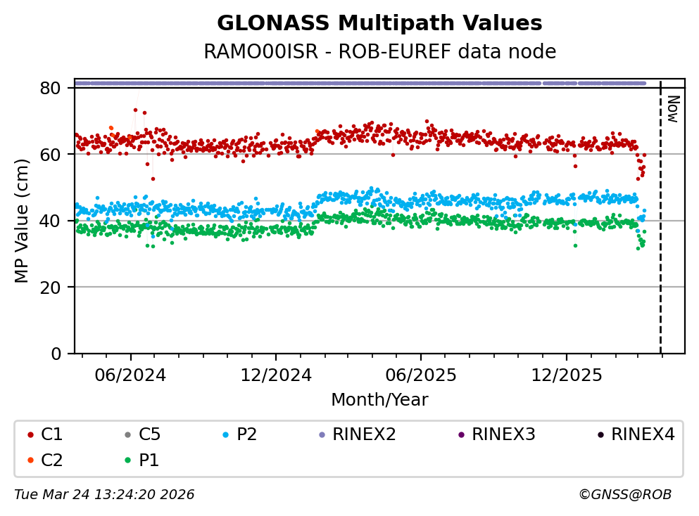 The plots below present the long-term tracking performance of the EPOS-GNSS station RAMO00ISR based on the daily RINEX data available from the ROB-EUREF EPOS-GNSS data node. The data quality metrics have been computed at the data node using the G-Nut/Anubis software.