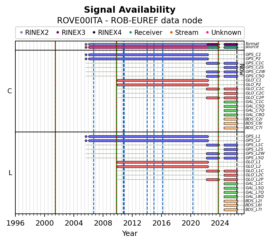 Red vertical lines, green and blue vertical dotted lines indicate respectively a change of antenna, receiver or receiver configuration (including firmware) as indicated by the station manager in the station site log available from the M3G GNSS Metadata Catalog. The purple points in the top of the plot indicate the daily RINEX data availability at the data node.