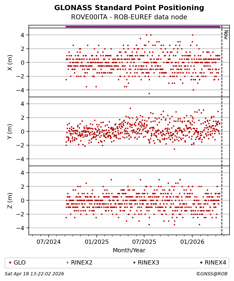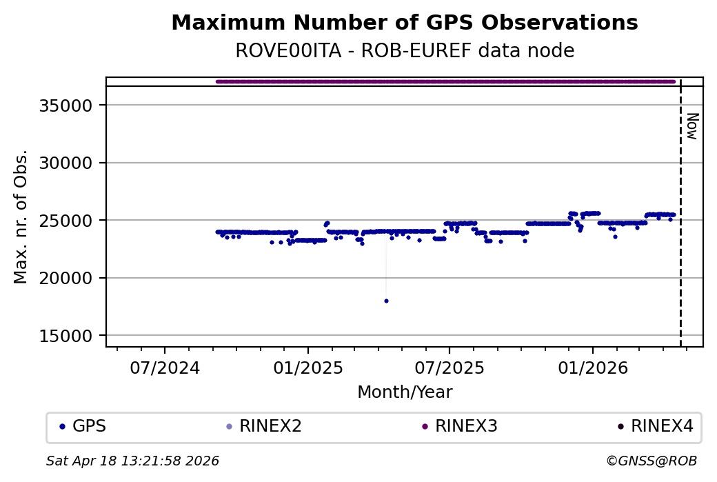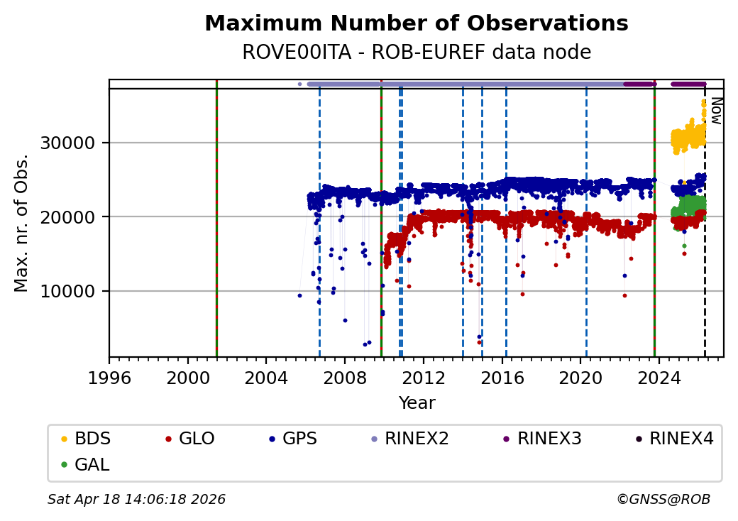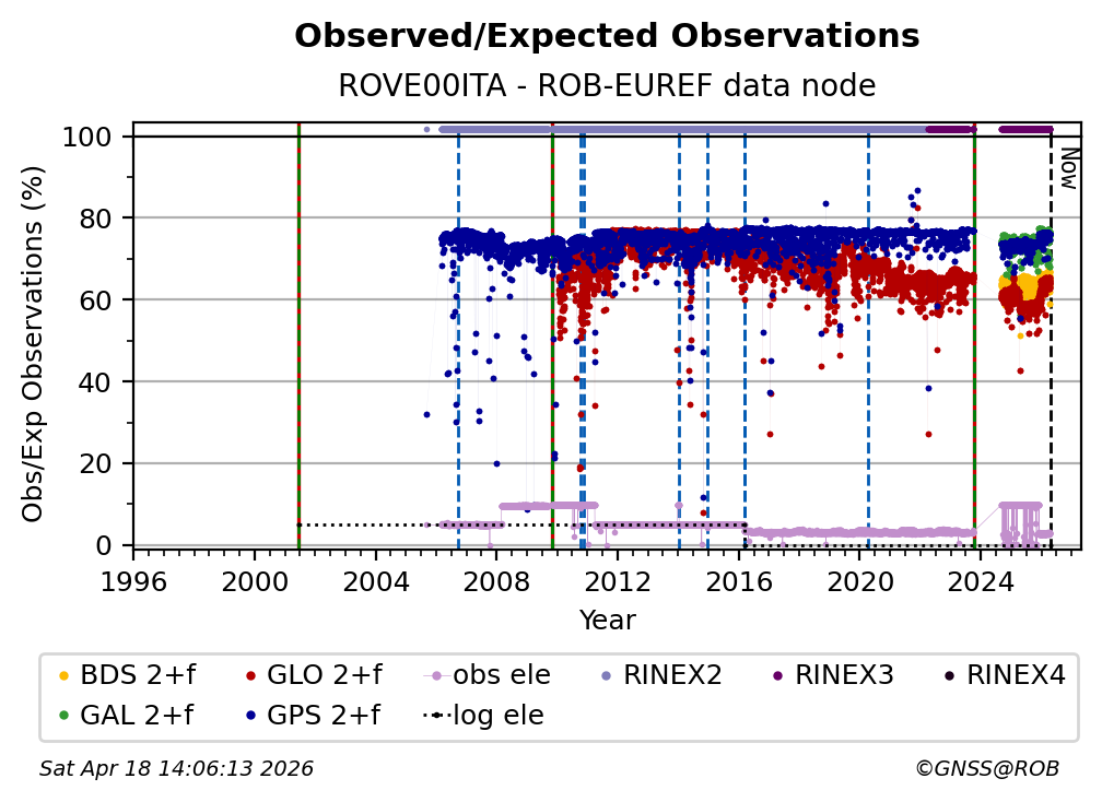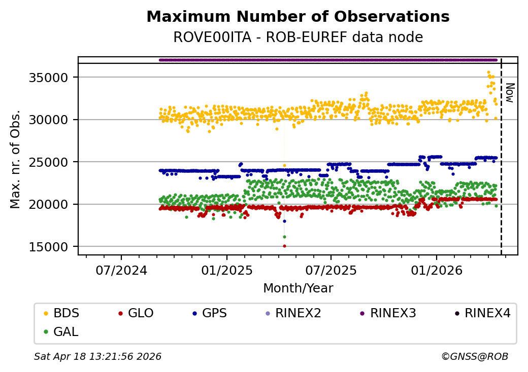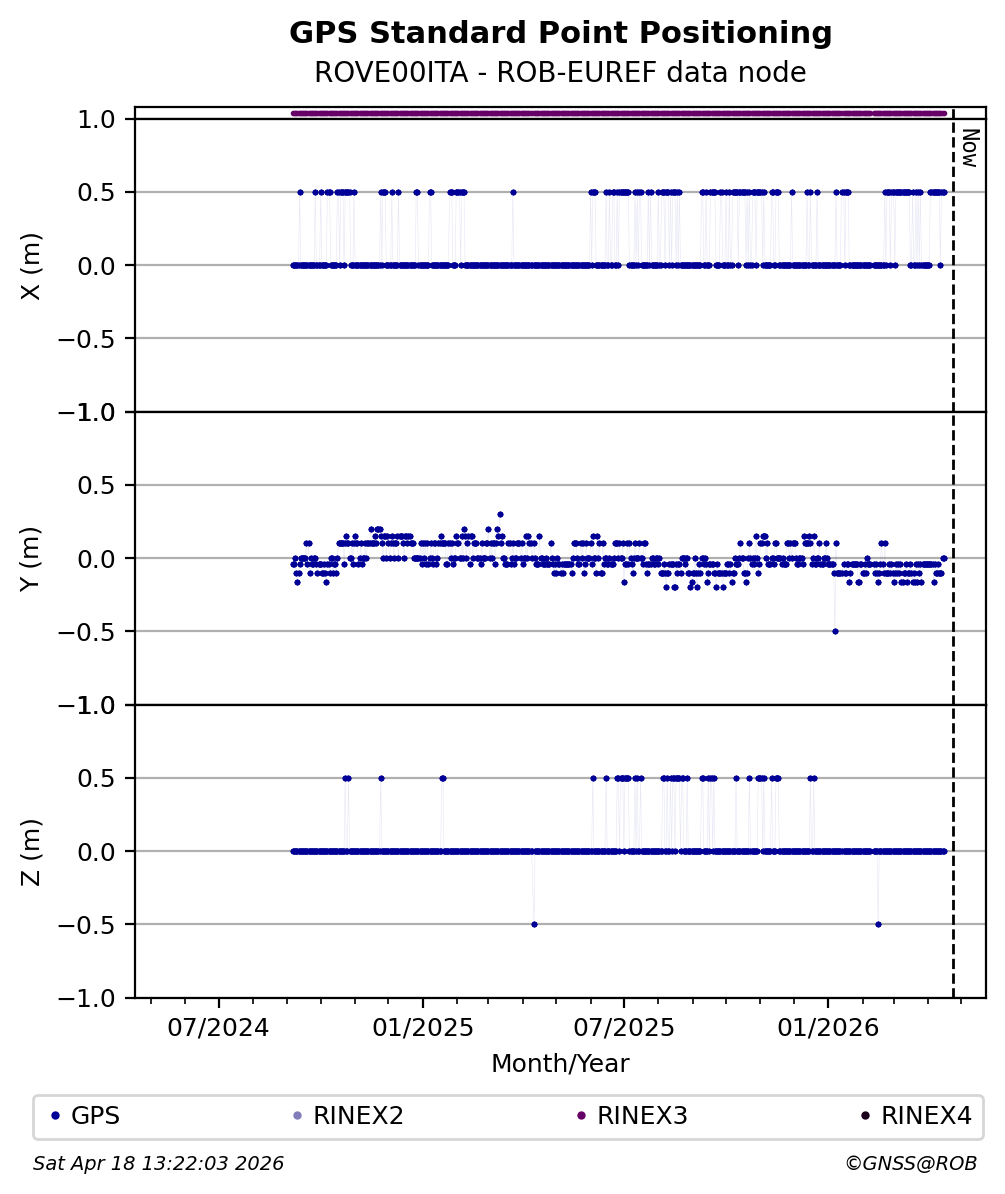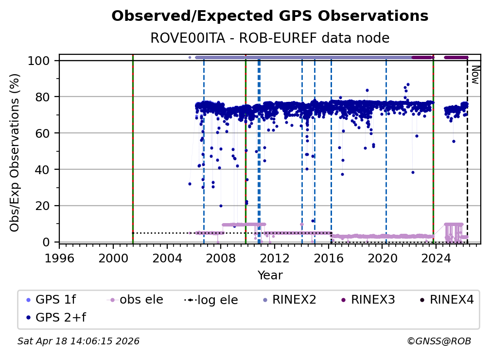 The plots below present the long-term tracking performance of the EPOS-GNSS station ROVE00ITA based on the daily RINEX data available from the ROB-EUREF EPOS-GNSS data node. The data quality metrics have been computed at the data node using the G-Nut/Anubis software.