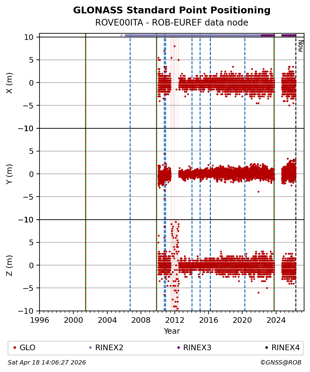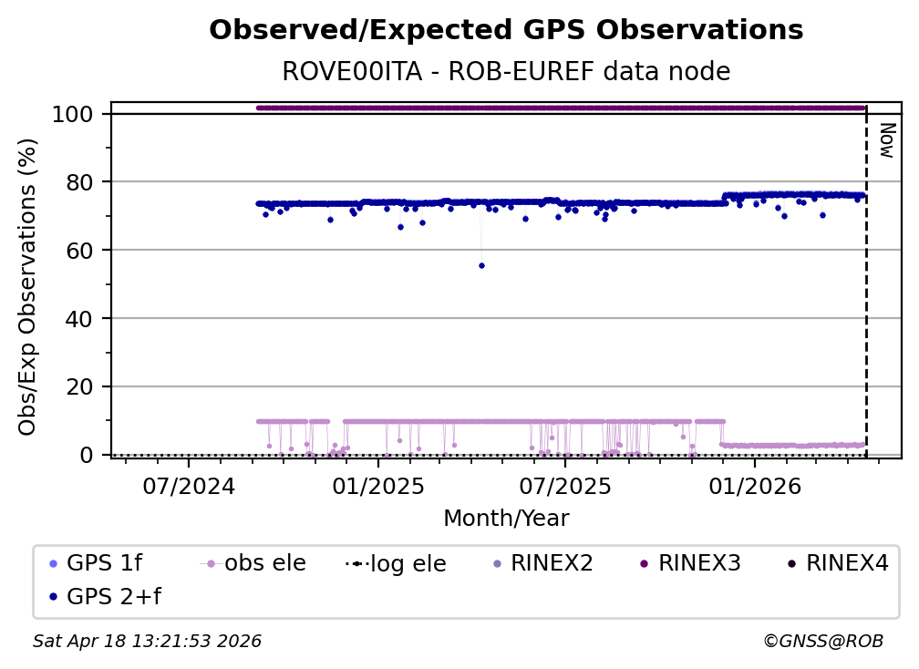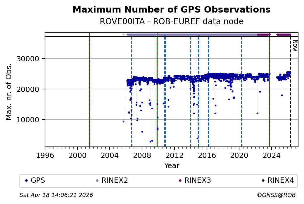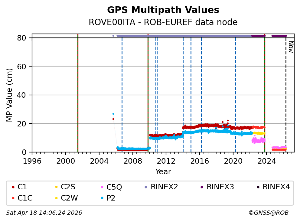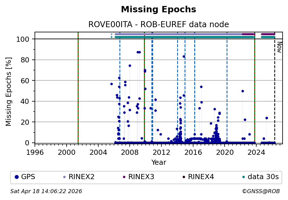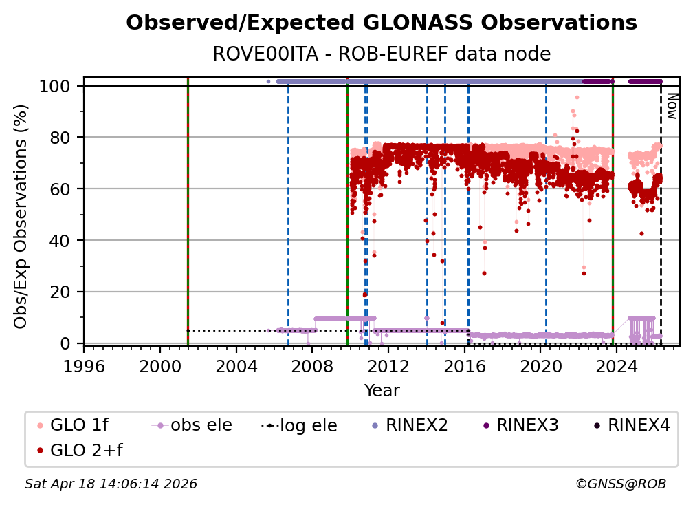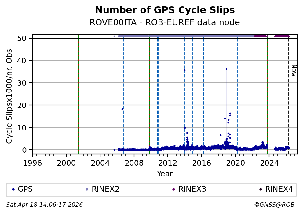 The plots below present the long-term tracking performance of the EPOS-GNSS station ROVE00ITA based on the daily RINEX data available from the ROB-EUREF EPOS-GNSS data node. The data quality metrics have been computed at the data node using the G-Nut/Anubis software.