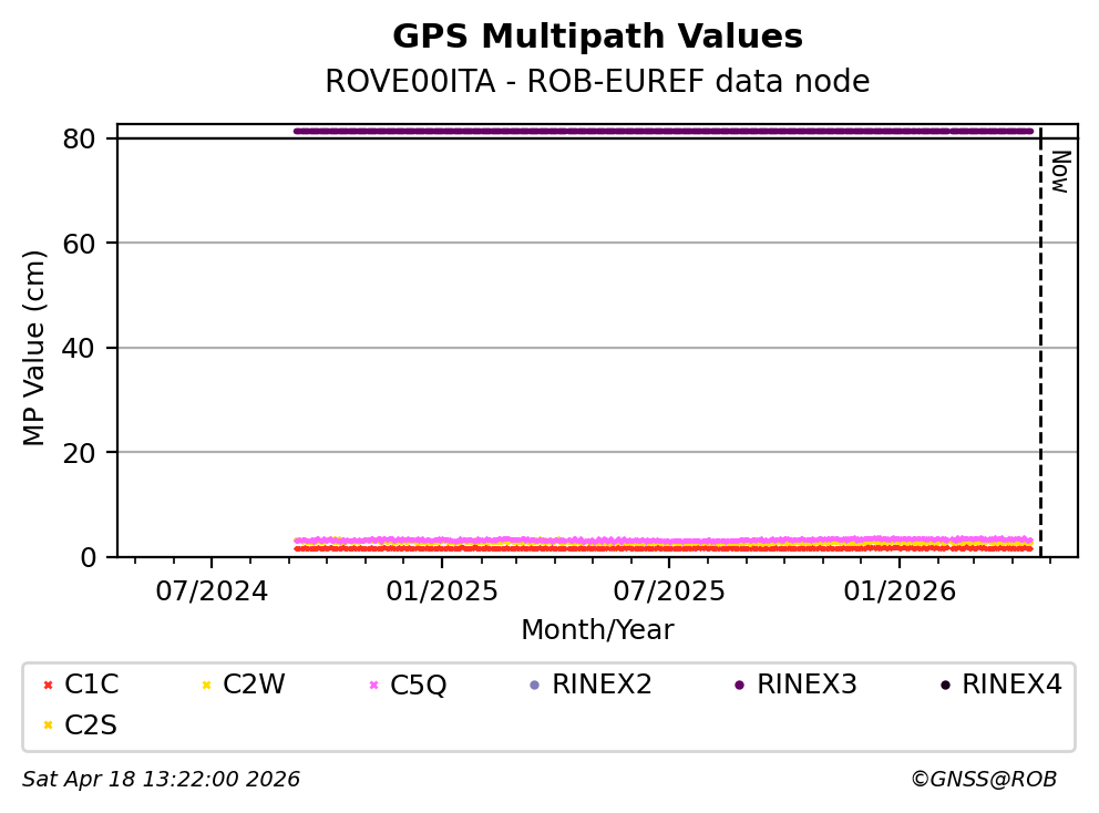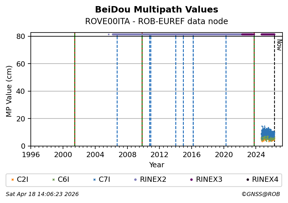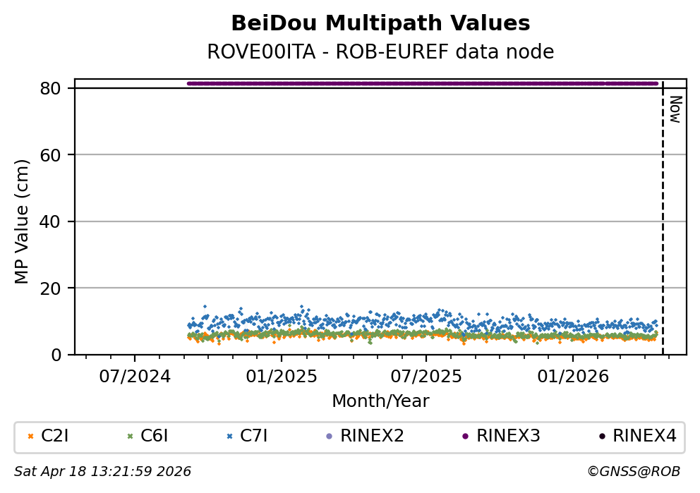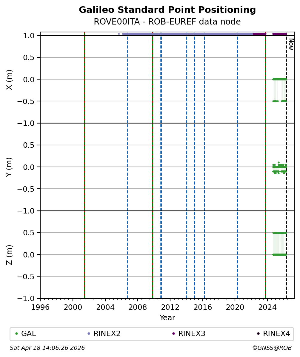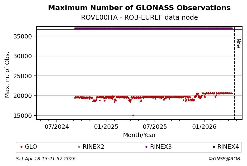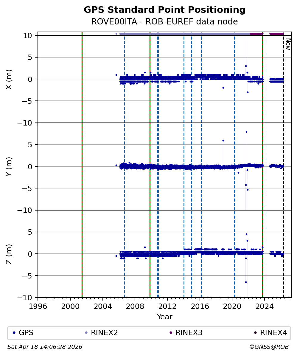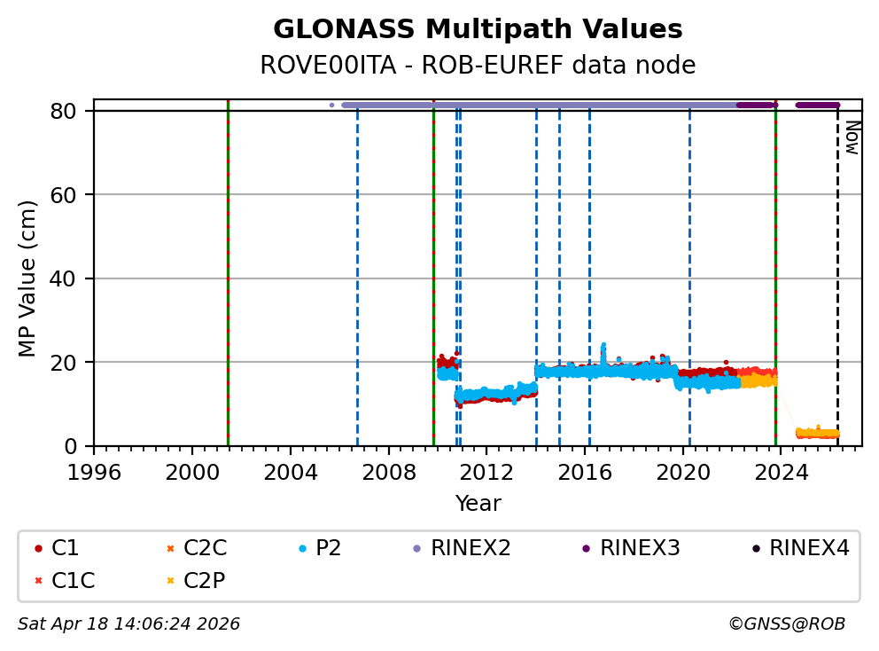 The plots below present the long-term tracking performance of the EPOS-GNSS station ROVE00ITA based on the daily RINEX data available from the ROB-EUREF EPOS-GNSS data node. The data quality metrics have been computed at the data node using the G-Nut/Anubis software.