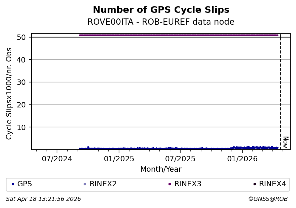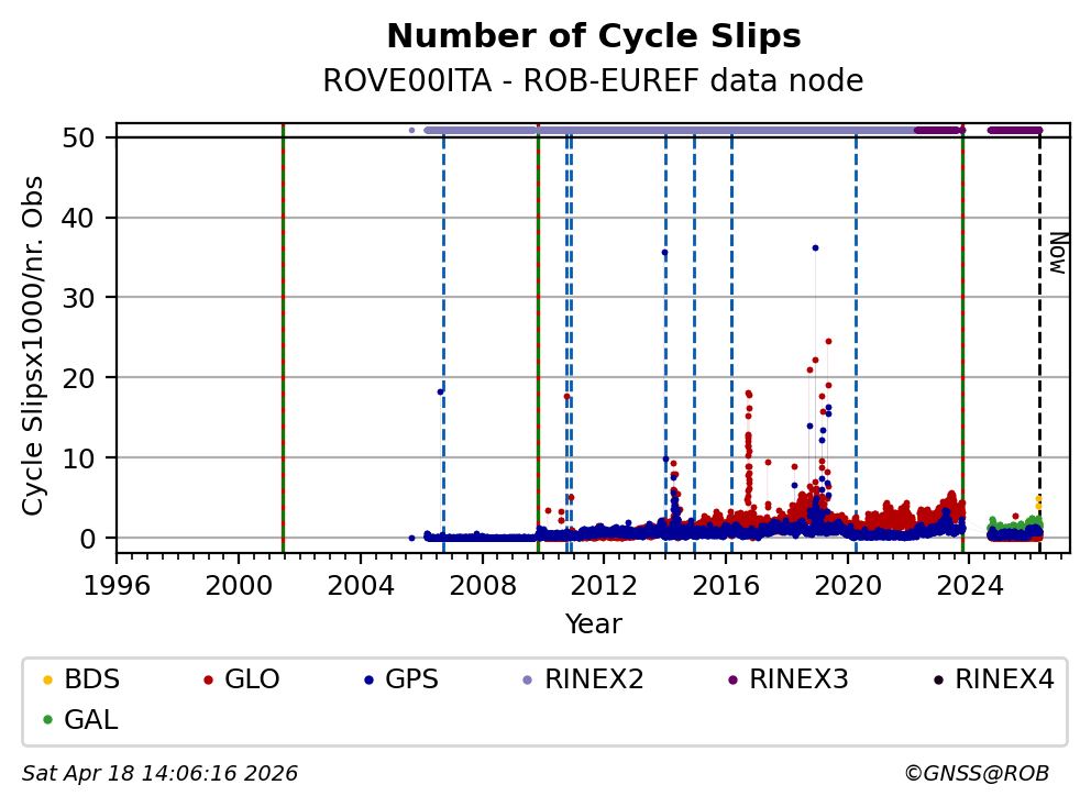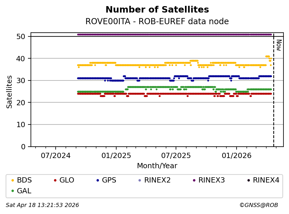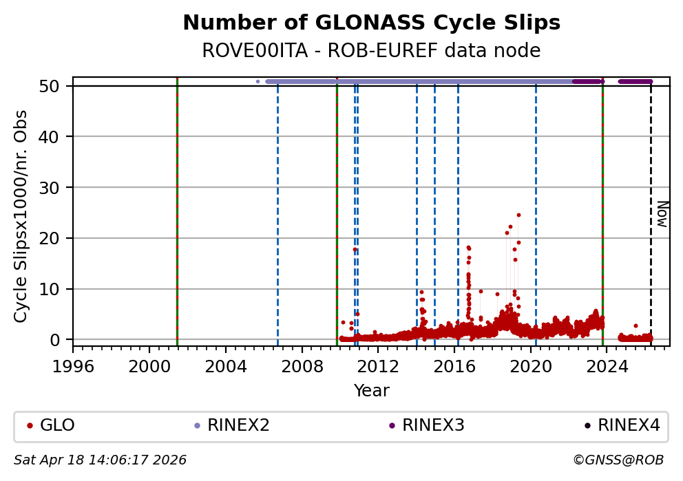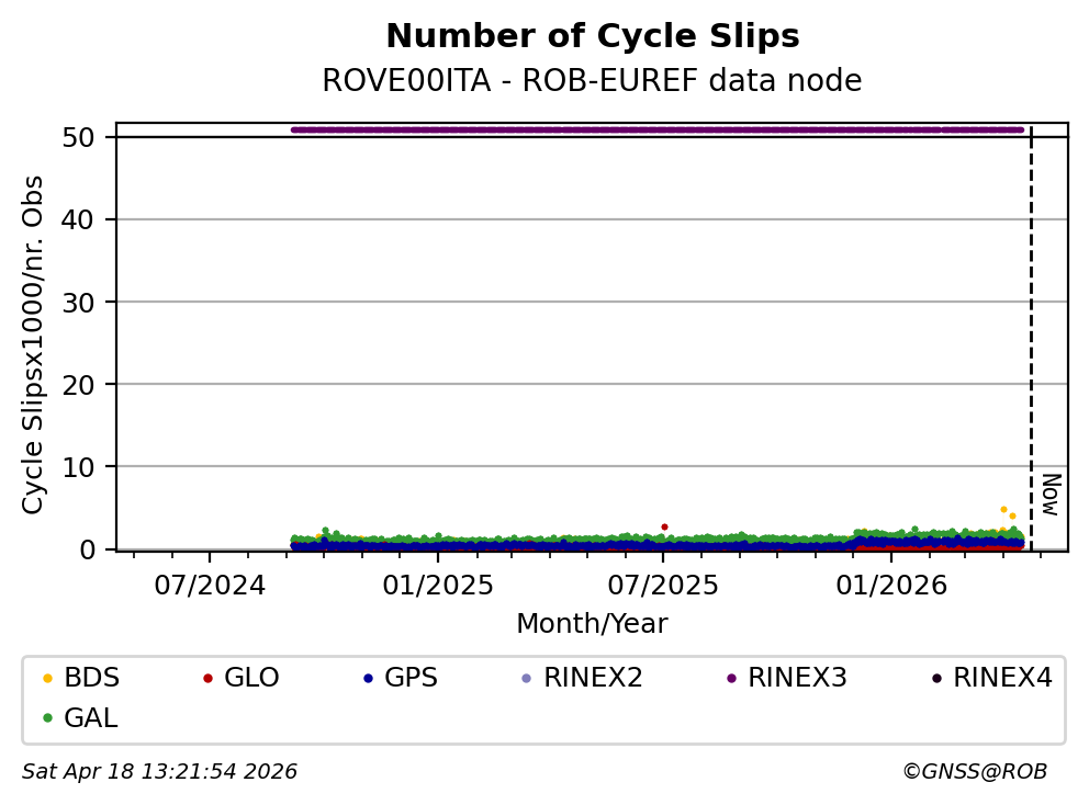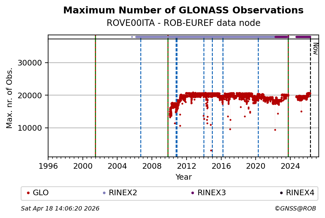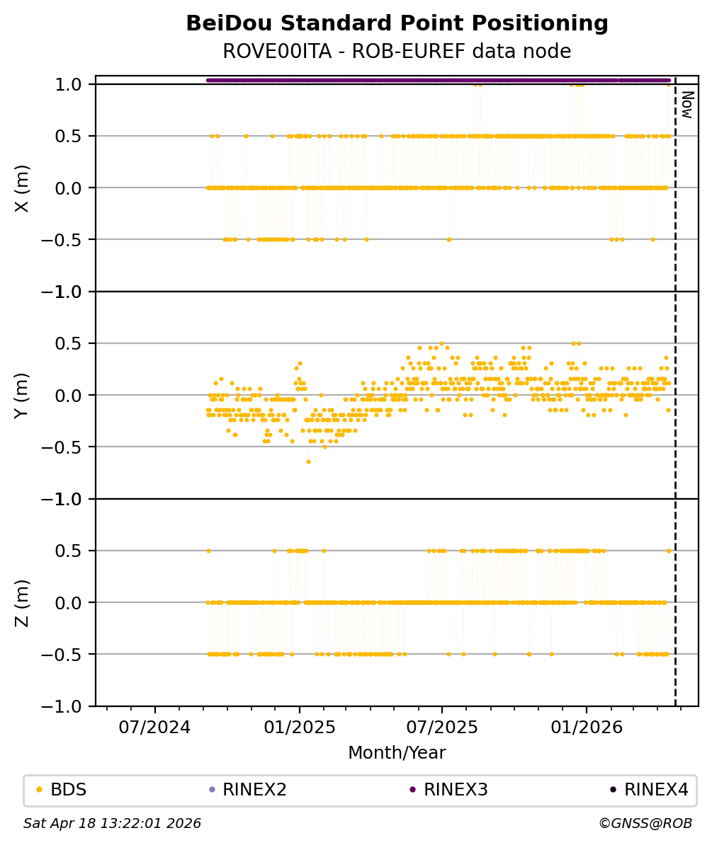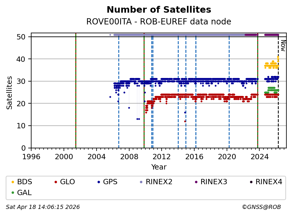 The plots below present the long-term tracking performance of the EPOS-GNSS station ROVE00ITA based on the daily RINEX data available from the ROB-EUREF EPOS-GNSS data node. The data quality metrics have been computed at the data node using the G-Nut/Anubis software.