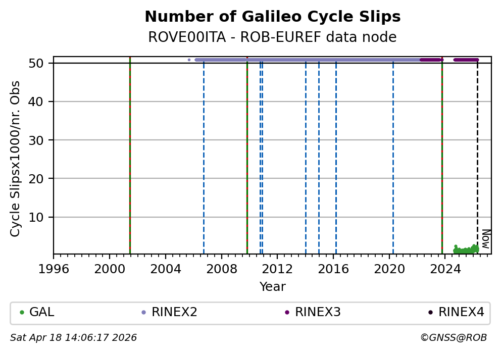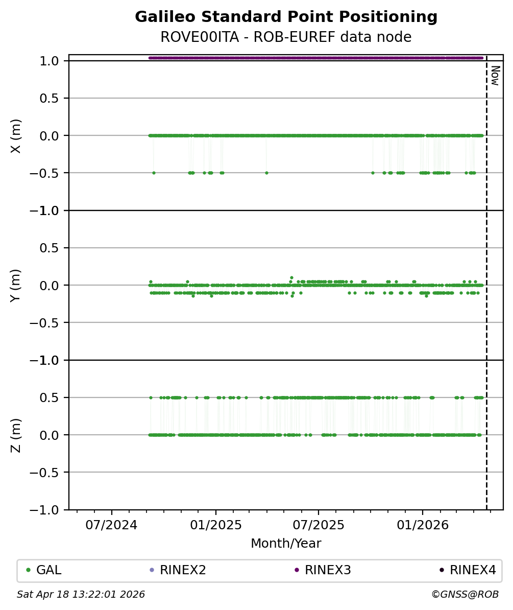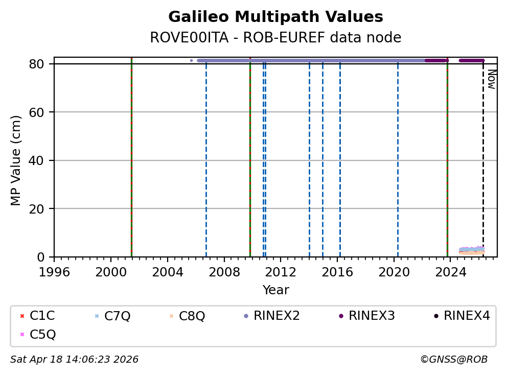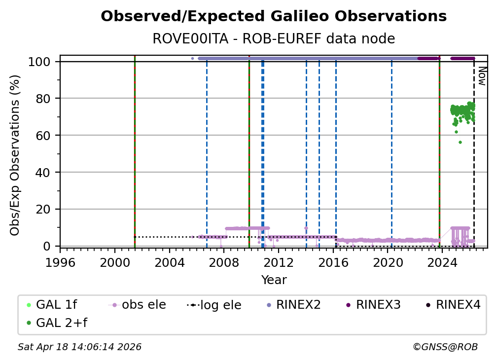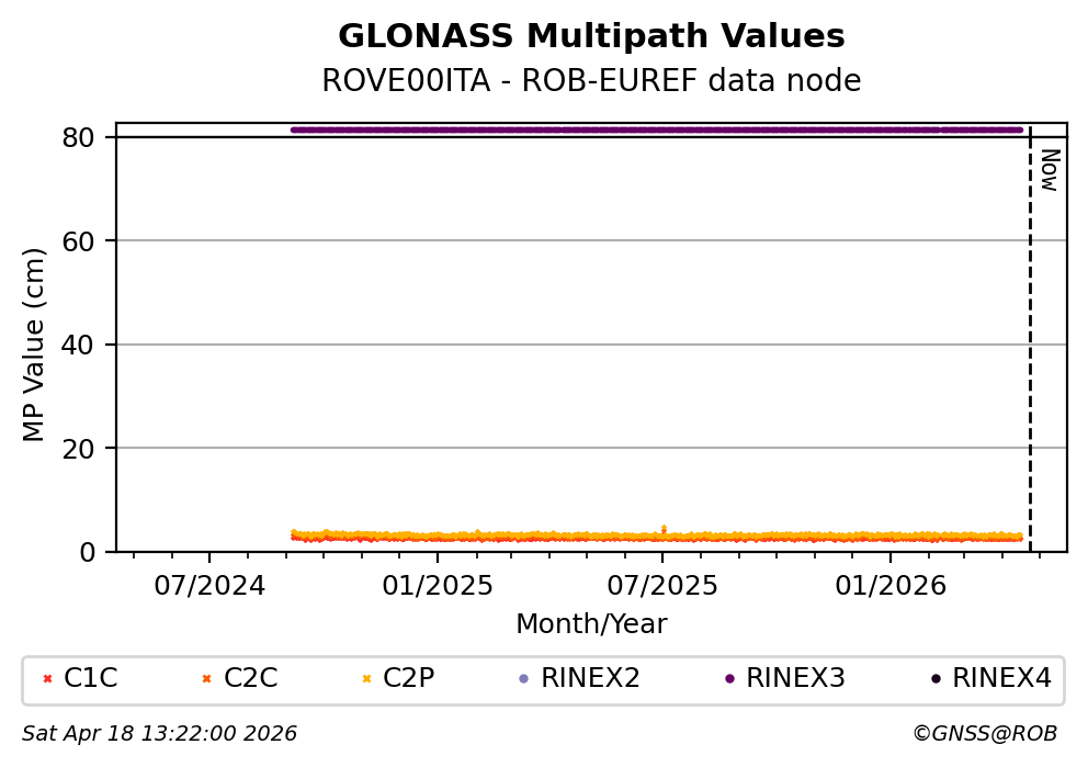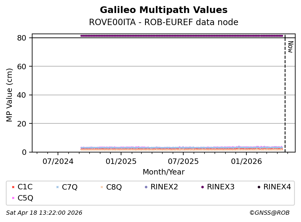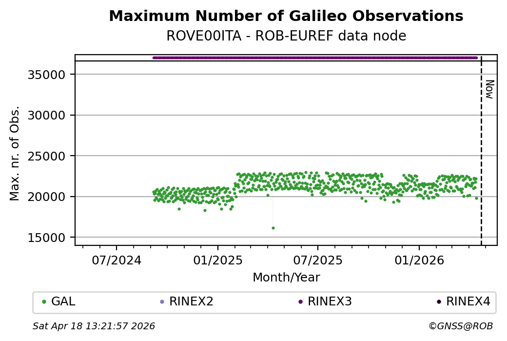 The plots below present the long-term tracking performance of the EPOS-GNSS station ROVE00ITA based on the daily RINEX data available from the ROB-EUREF EPOS-GNSS data node. The data quality metrics have been computed at the data node using the G-Nut/Anubis software.