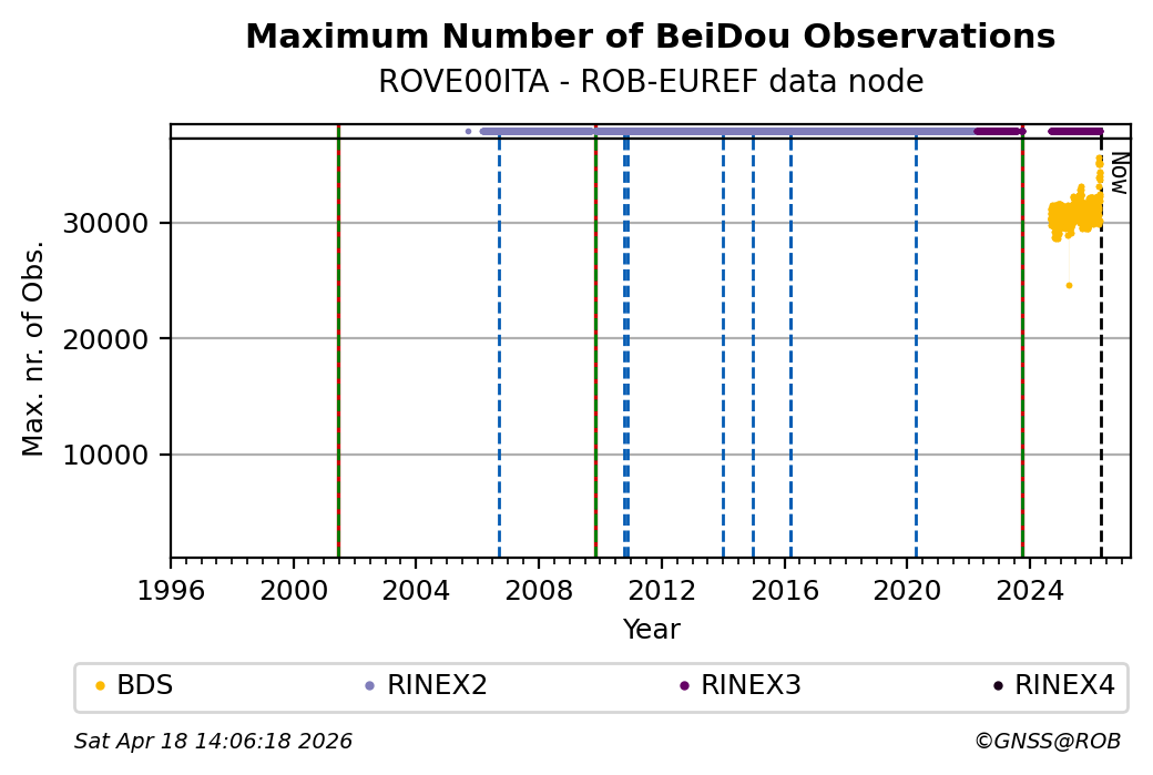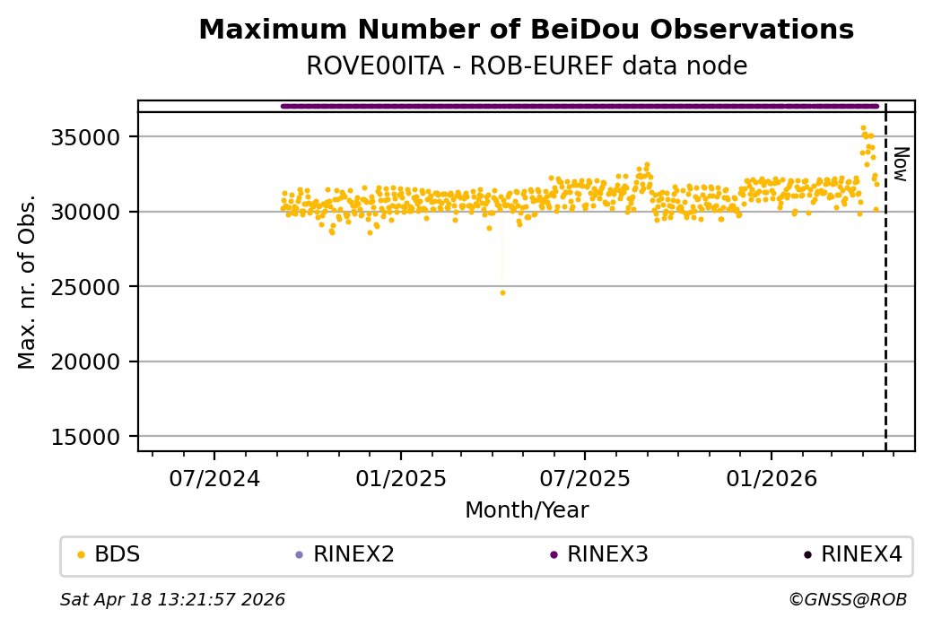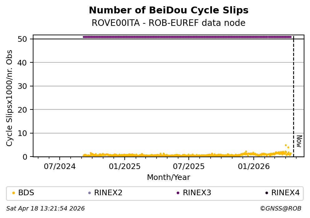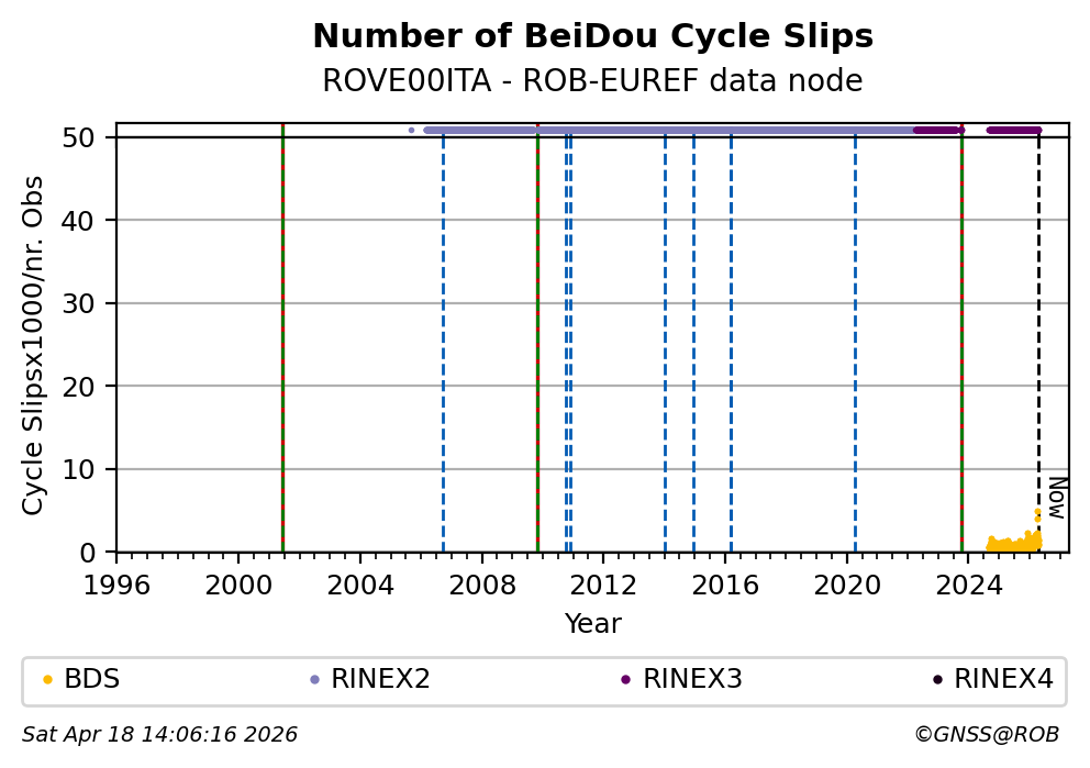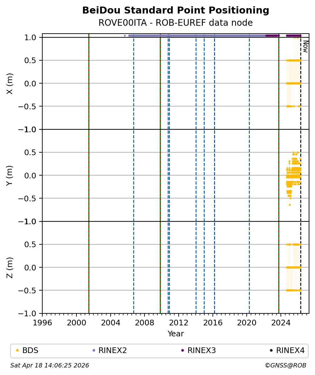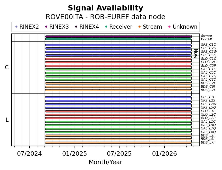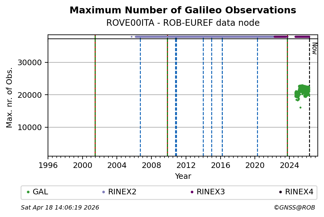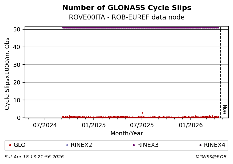 The plots below present the long-term tracking performance of the EPOS-GNSS station ROVE00ITA based on the daily RINEX data available from the ROB-EUREF EPOS-GNSS data node. The data quality metrics have been computed at the data node using the G-Nut/Anubis software.