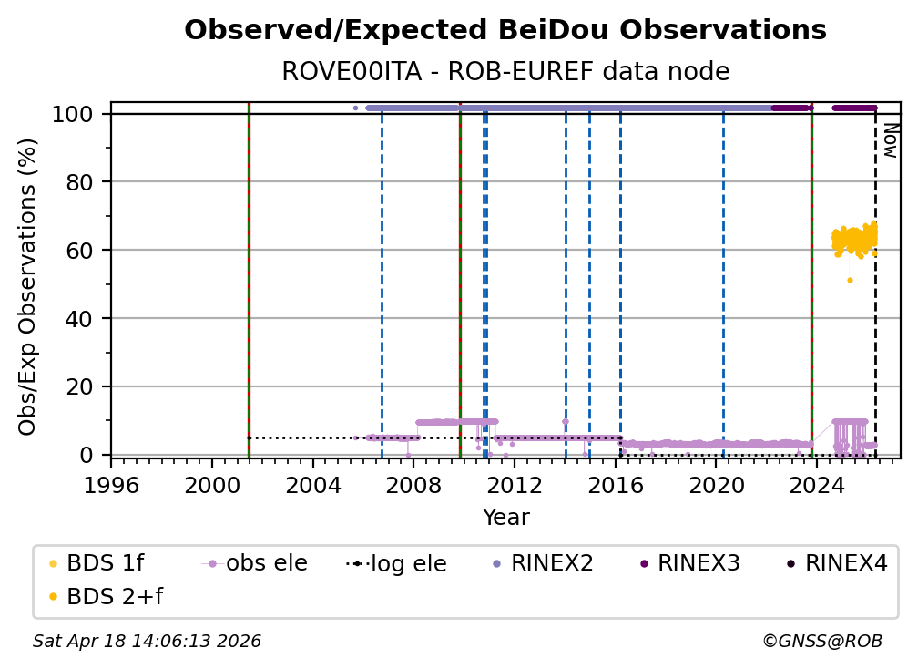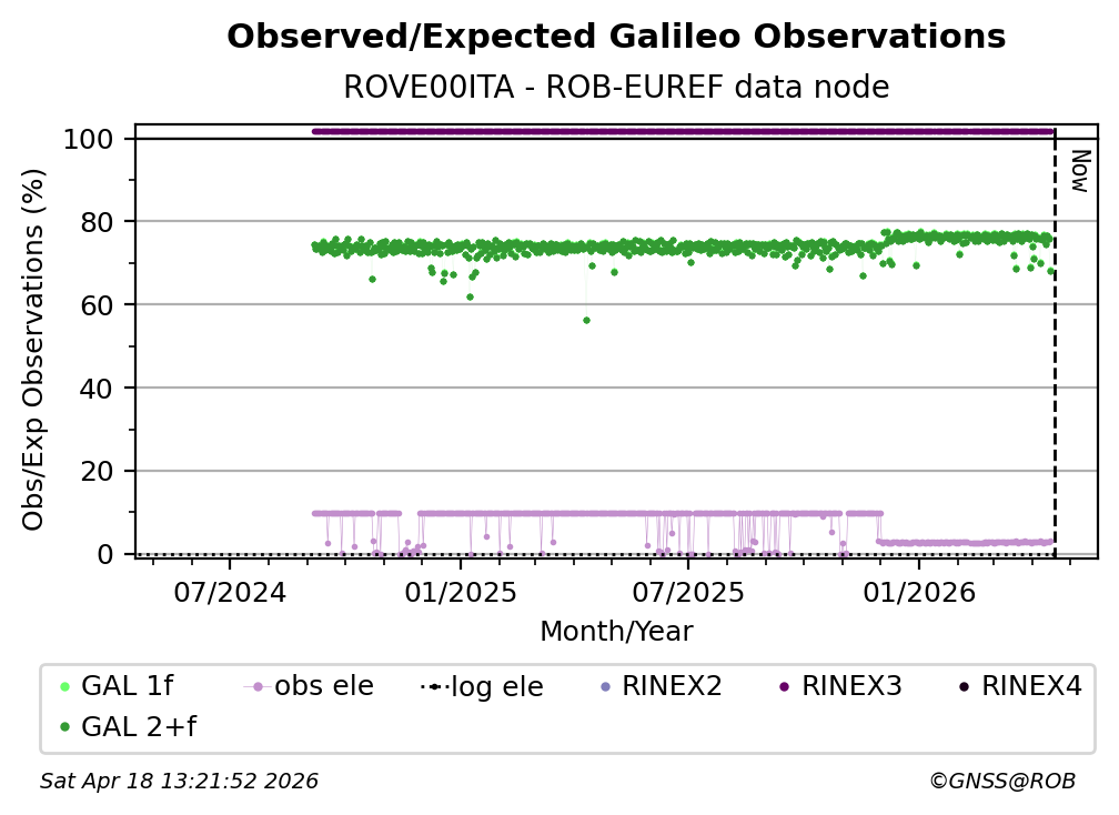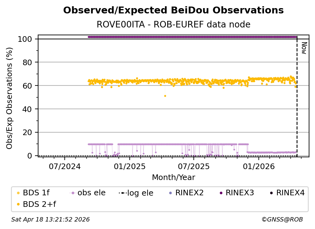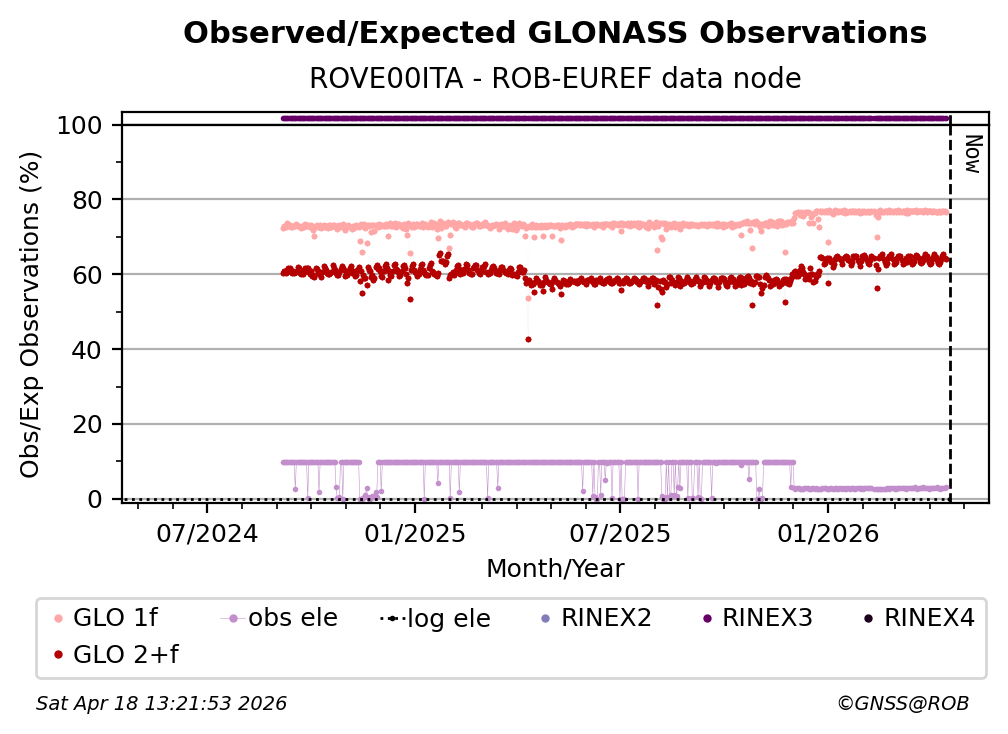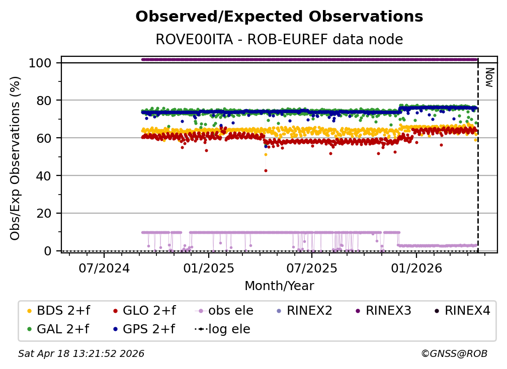 The percentage corresponds, for each constellation tracked by the station, to the ratio of the number of observations in the daily RINEX file with respect to the number of expected observations: