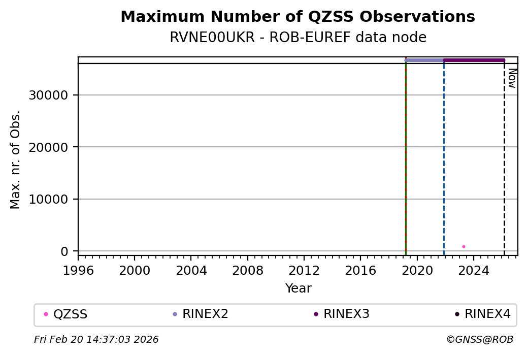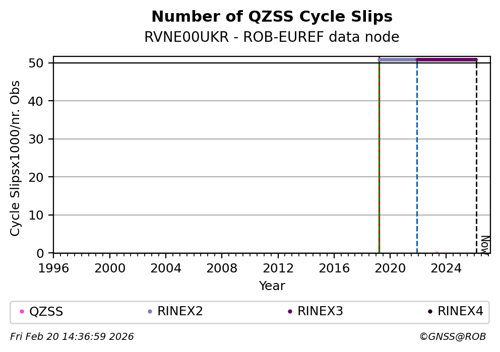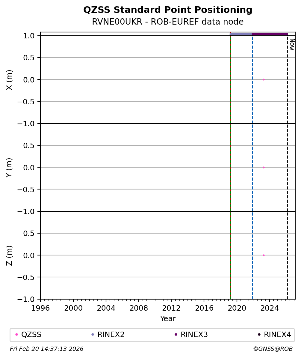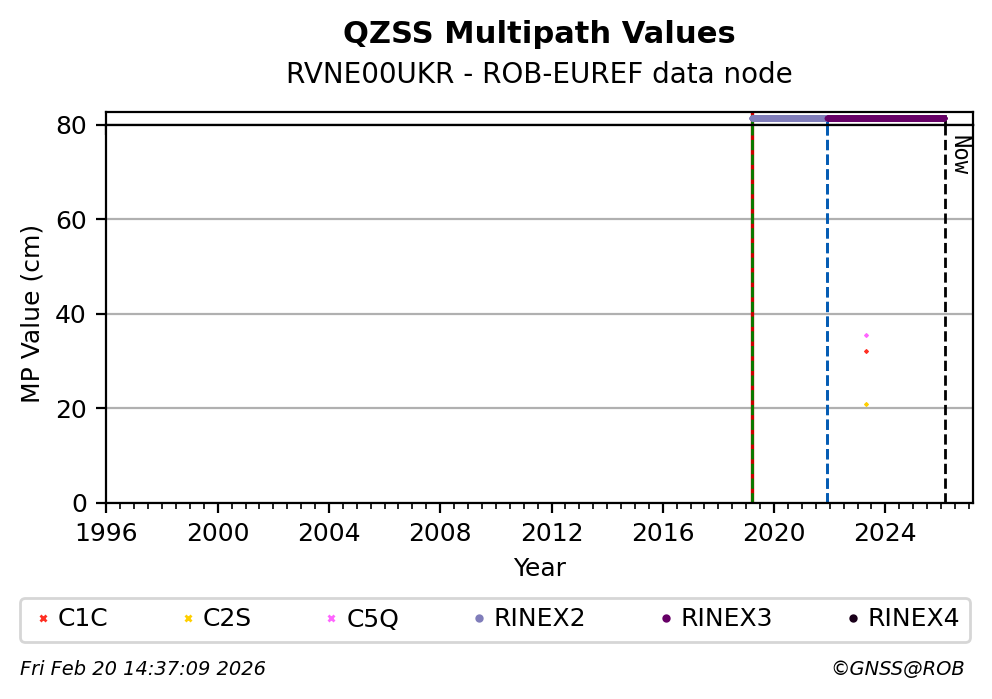 The plots below present the long-term tracking performance of the EPOS-GNSS station RVNE00UKR based on the daily RINEX data available from the ROB-EUREF EPOS-GNSS data node. The data quality metrics have been computed at the data node using the G-Nut/Anubis software.