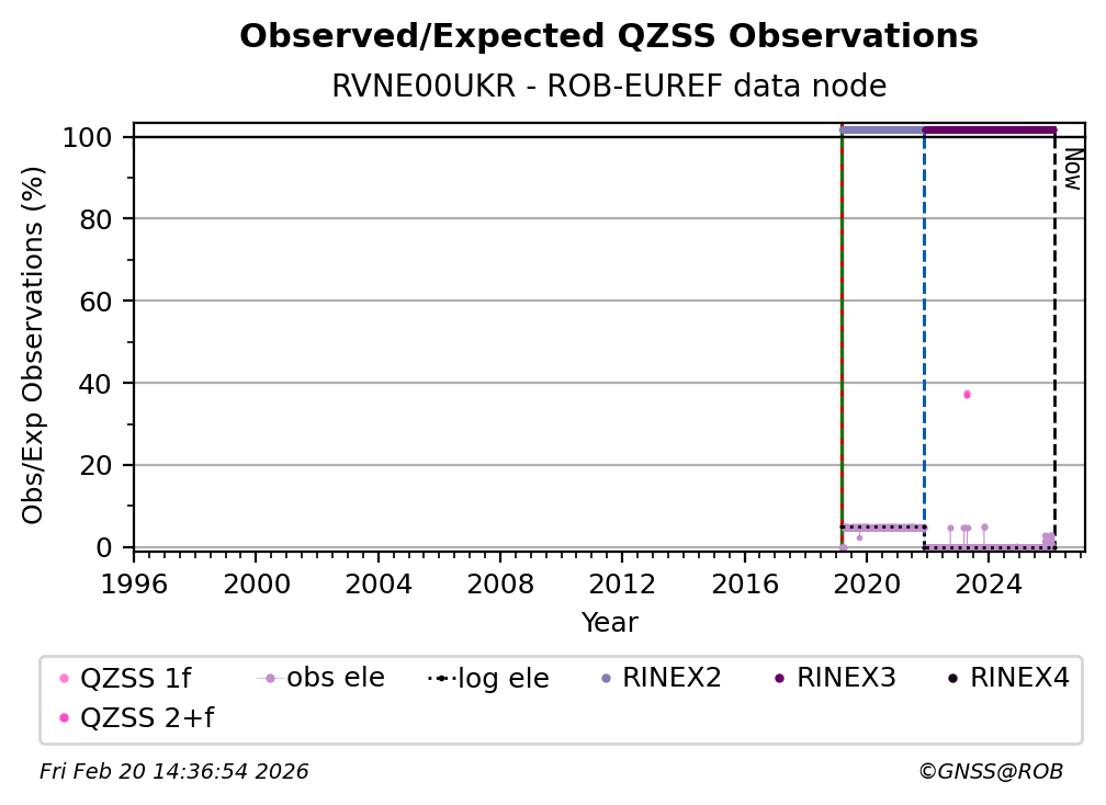 The percentage corresponds, for each constellation tracked by the station, to the ratio of the number of observations in the daily RINEX file with respect to the number of expected observations:
