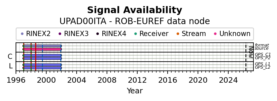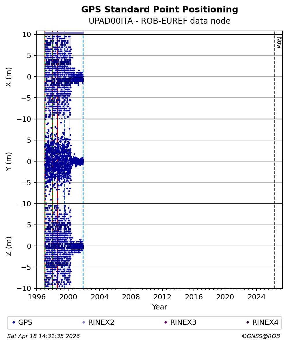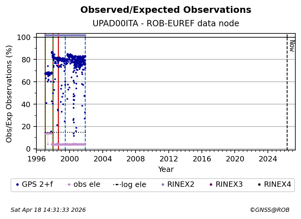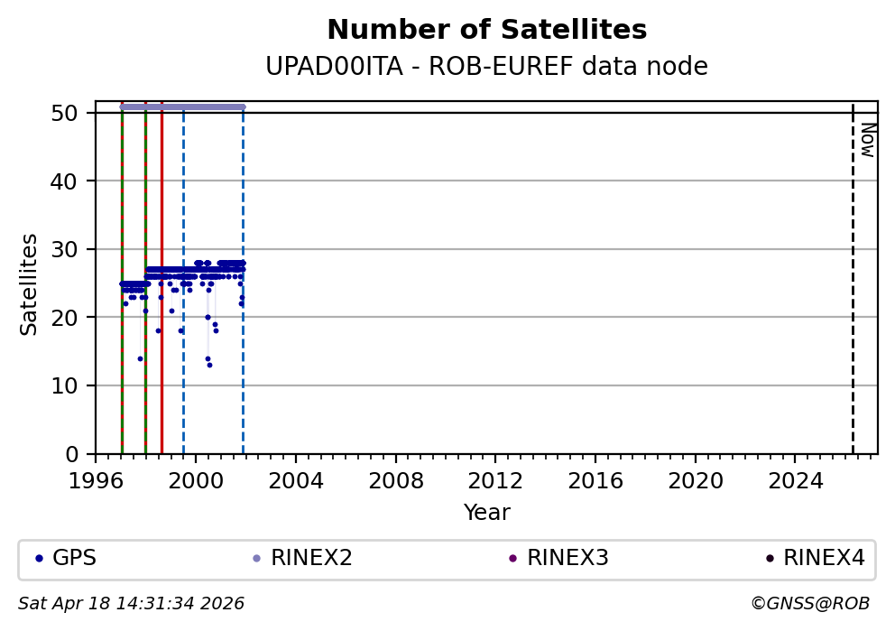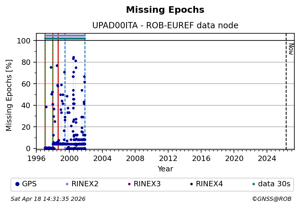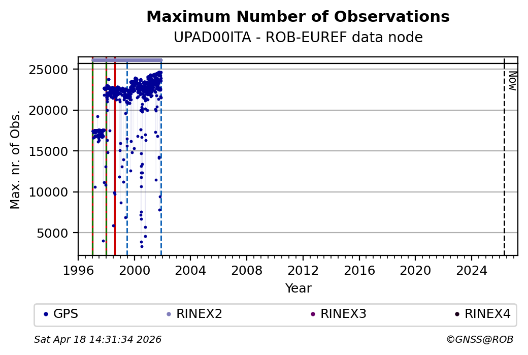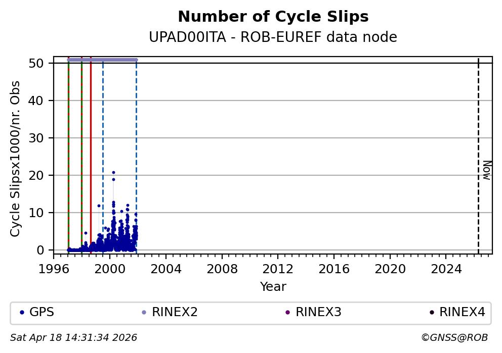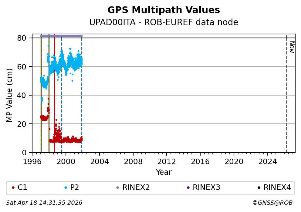 The plots below present the long-term tracking performance of the EPOS-GNSS station UPAD00ITA based on the daily RINEX data available from the ROB-EUREF EPOS-GNSS data node. The data quality metrics have been computed at the data node using the G-Nut/Anubis software. Input files are the daily RINEX (V2 or V3) observation files available from ROB-EUREF EPOS-GNSS data node.