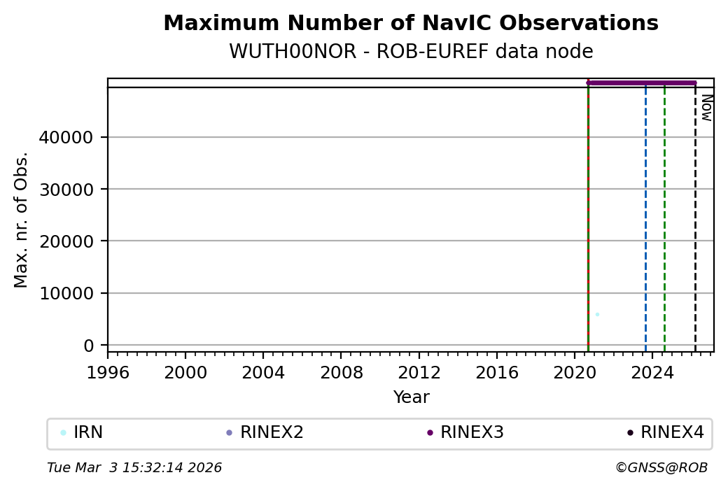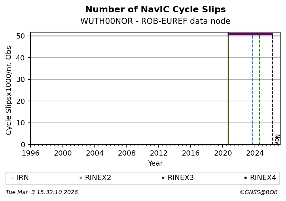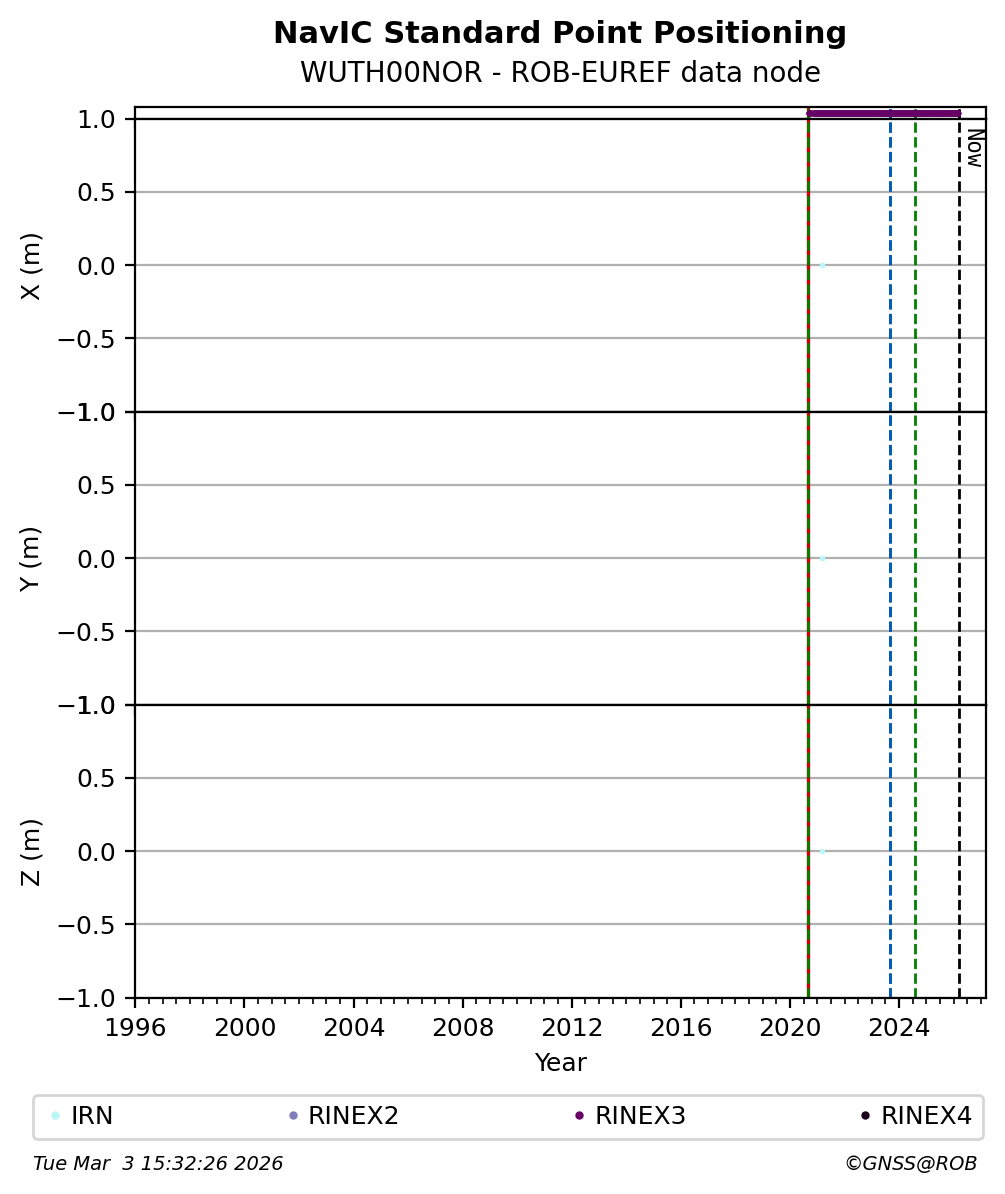 The plots below present the long-term tracking performance of the EPOS-GNSS station WUTH00NOR based on the daily RINEX data available from the ROB-EUREF EPOS-GNSS data node. The data quality metrics have been computed at the data node using the G-Nut/Anubis software.