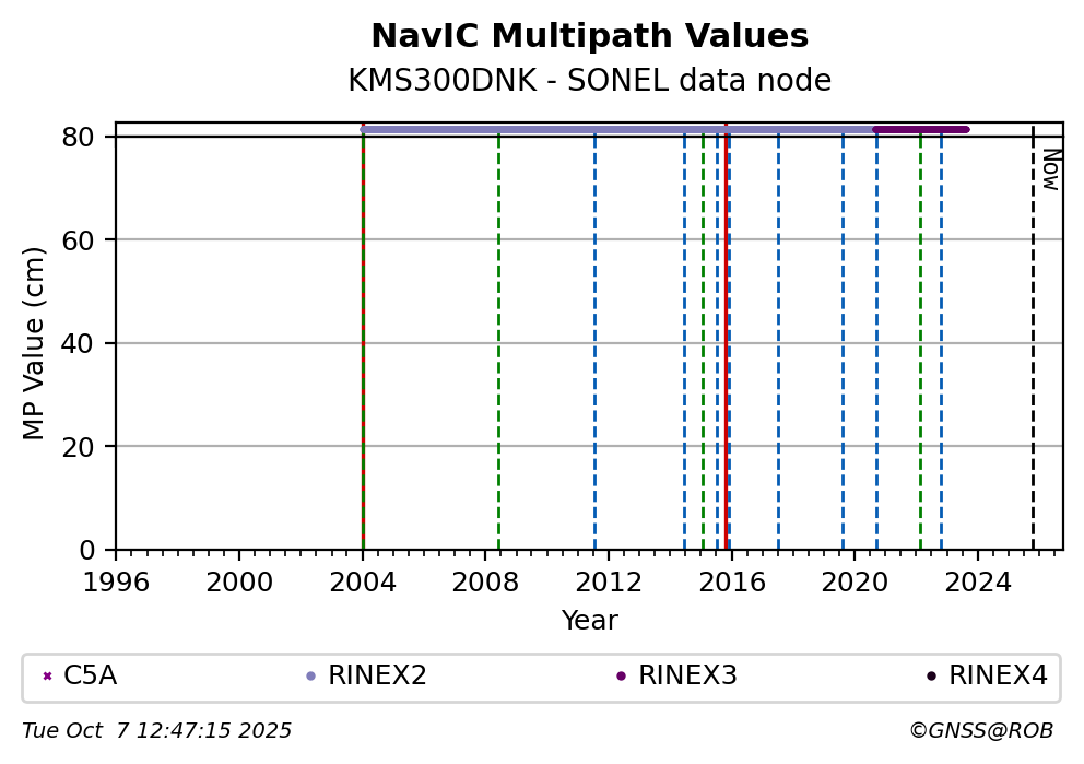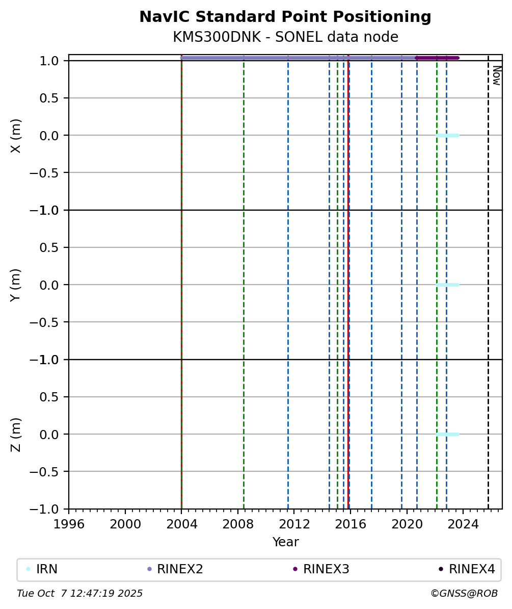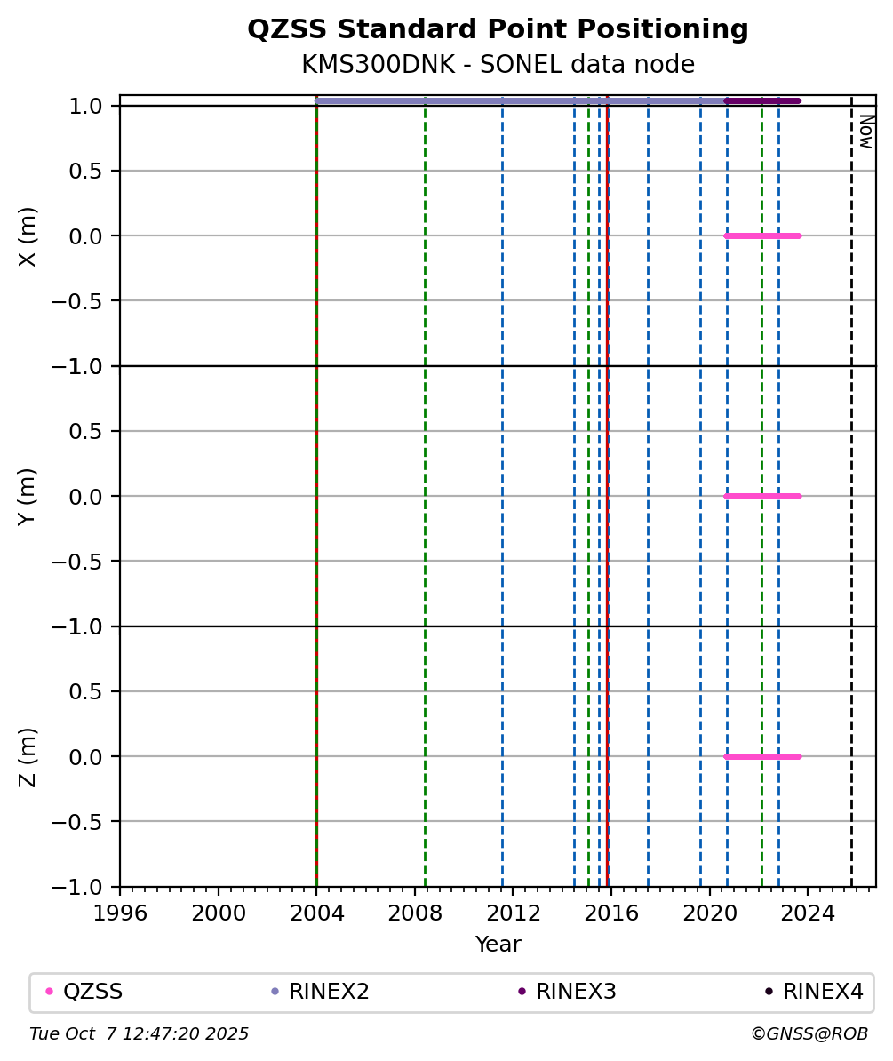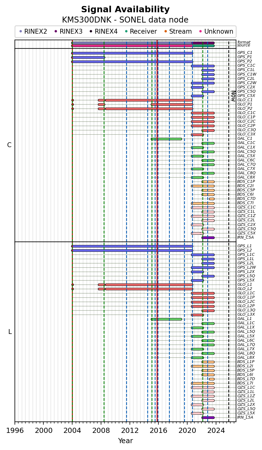 Red vertical lines, green and blue vertical dotted lines indicate respectively a change of antenna, receiver or receiver configuration (including firmware) as indicated by the station manager in the station site log available from the M3G GNSS Metadata Catalog. The purple points in the top of the plot indicate the daily RINEX data availability at the data node.