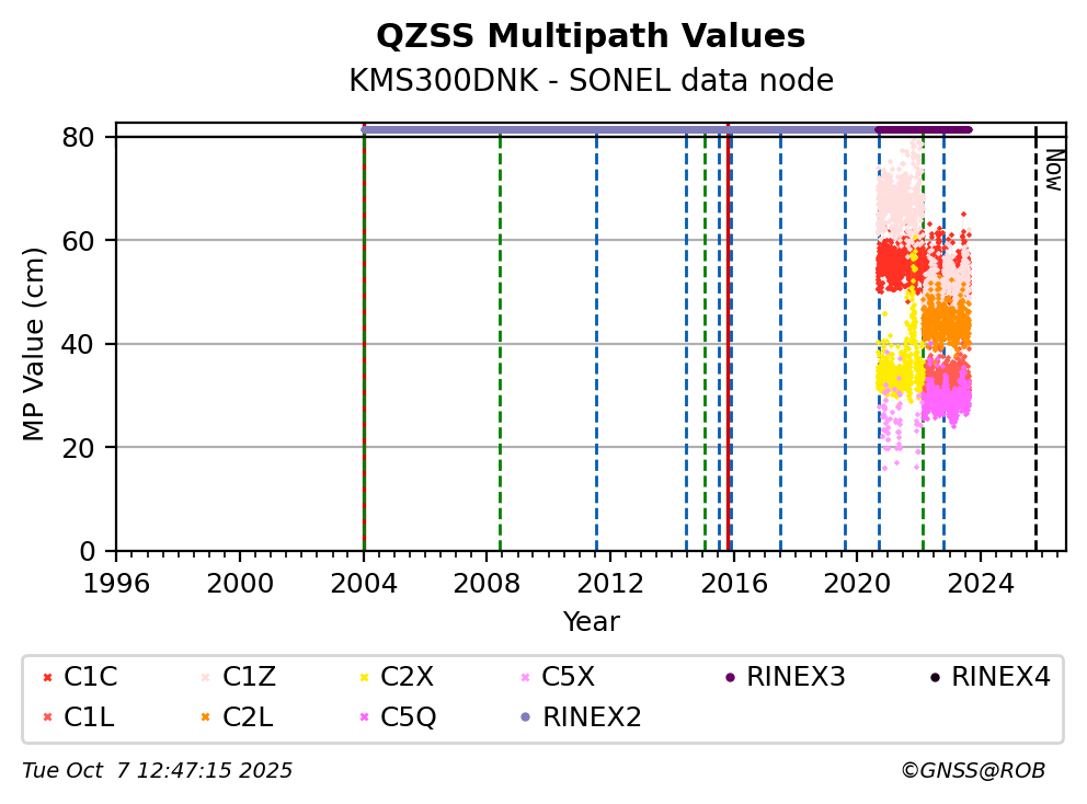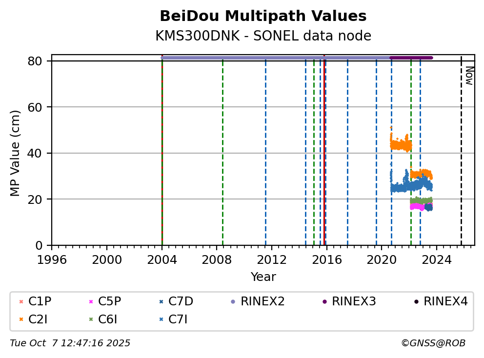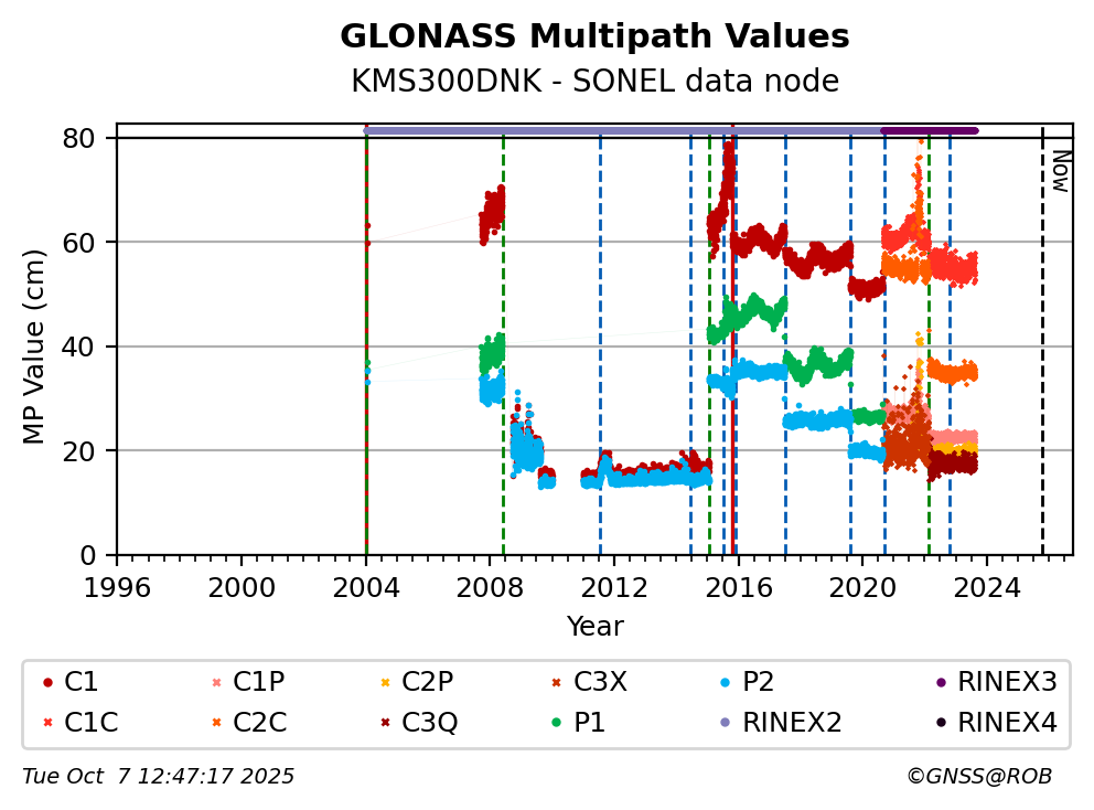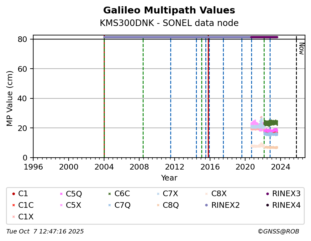 These plots display the daily mean of code multipath per frequency band and satellite constellation. Code multipath statistics are calculated for all pseudorange codes of all GNSS satellites providing dual-frequency carrier-phase observations. The code multipath characterizes the quality of the observed signal and the site environment.