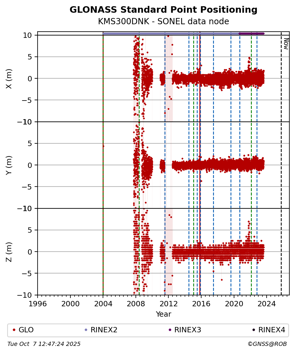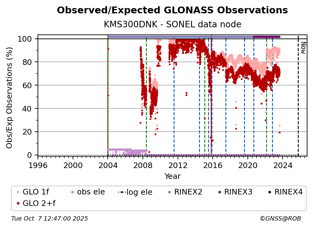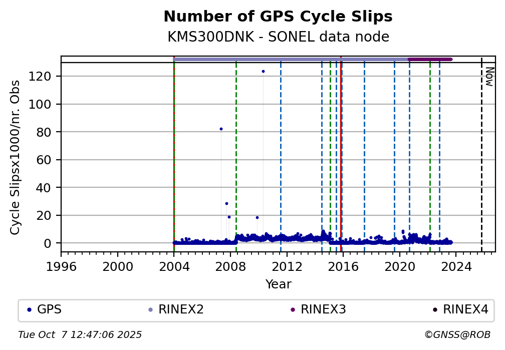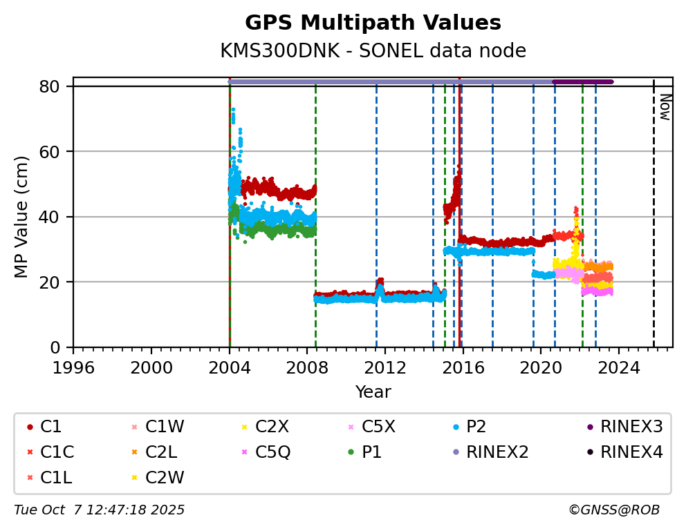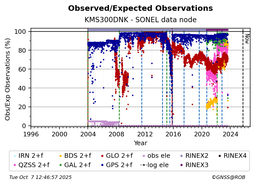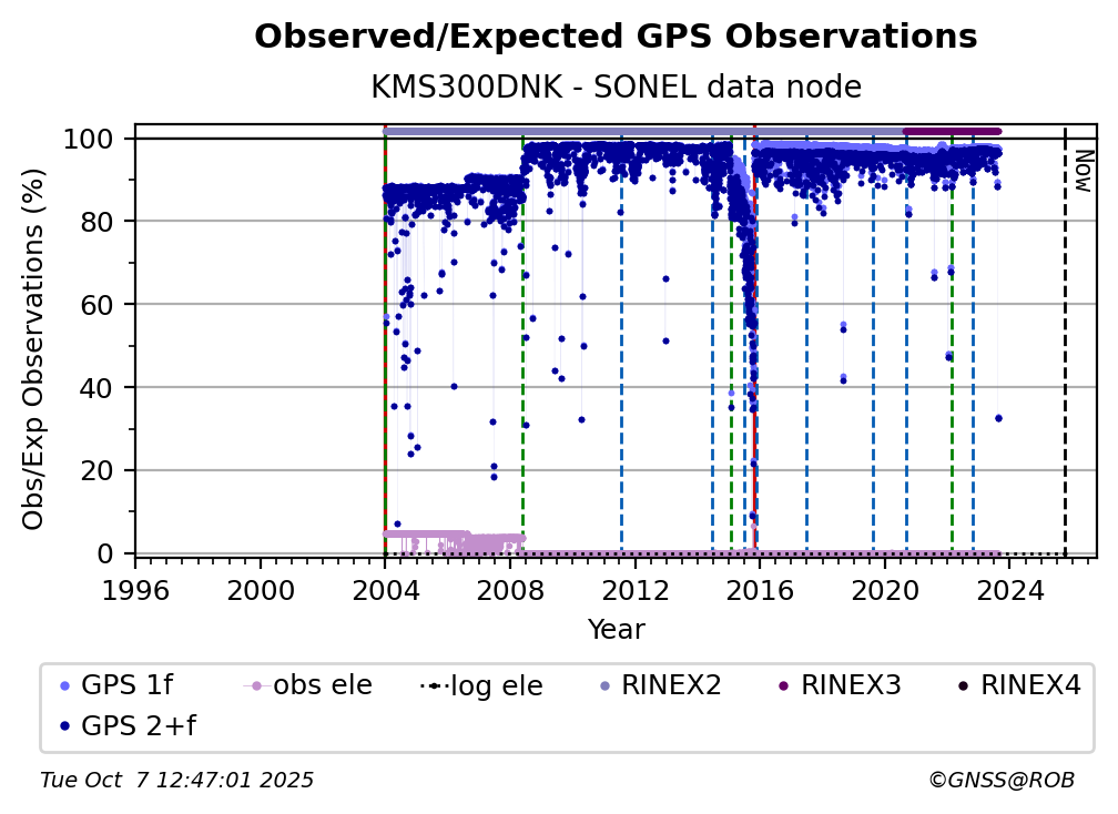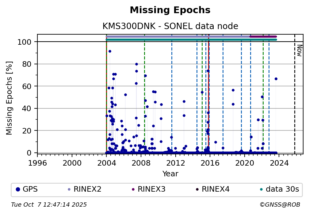 The plots below present the long-term tracking performance of the EPOS-GNSS station KMS300DNK based on the daily RINEX data available from the SONEL EPOS-GNSS data node. The data quality metrics have been computed at the data node using the G-Nut/Anubis software.