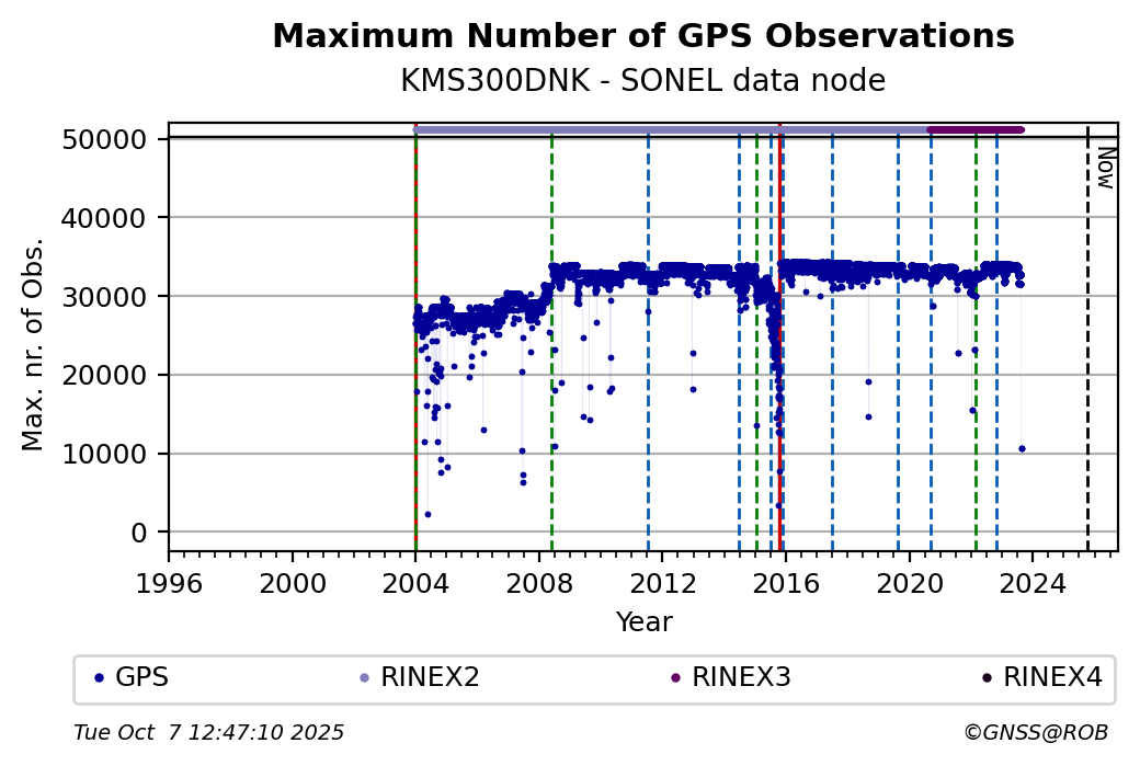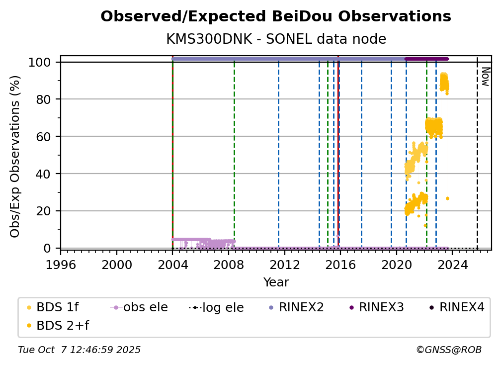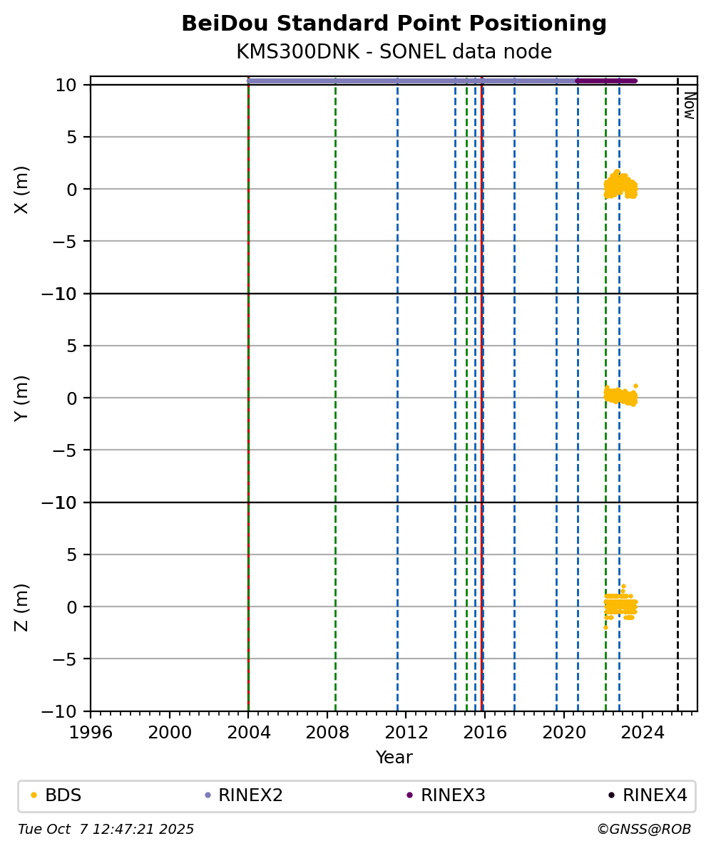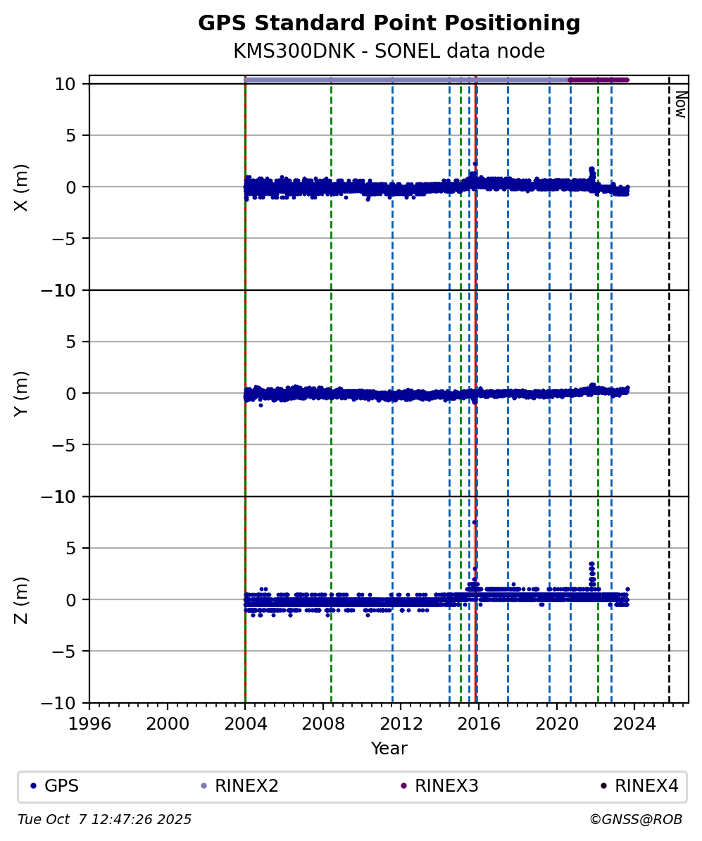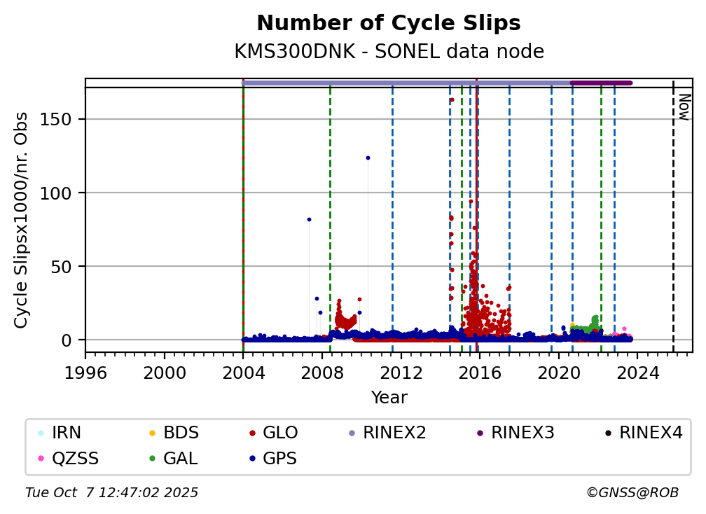 The plots below present the long-term tracking performance of the EPOS-GNSS station KMS300DNK based on the daily RINEX data available from the SONEL EPOS-GNSS data node. The data quality metrics have been computed at the data node using the G-Nut/Anubis software.