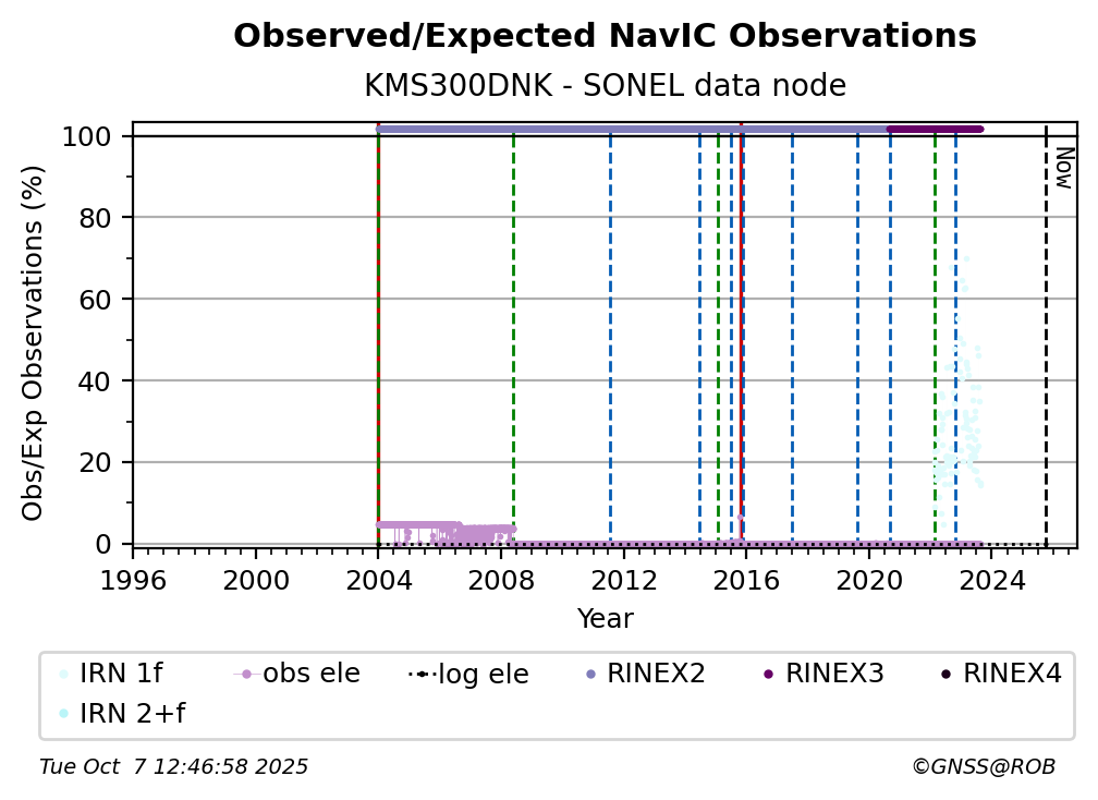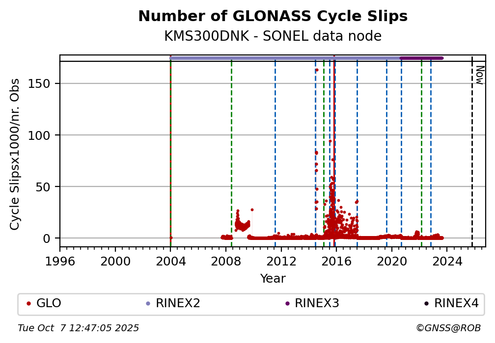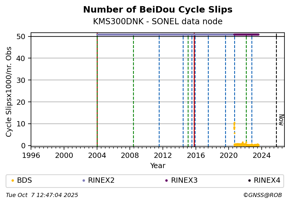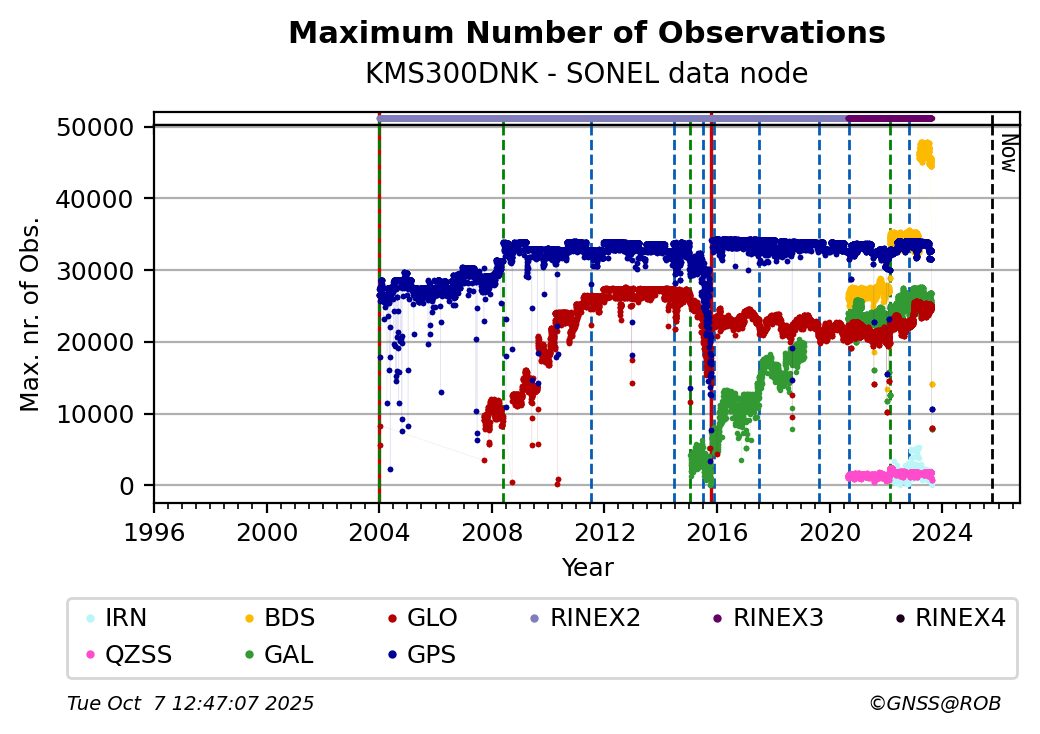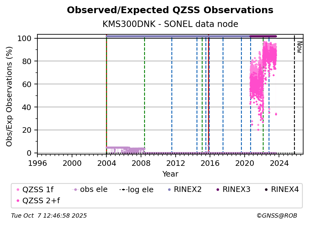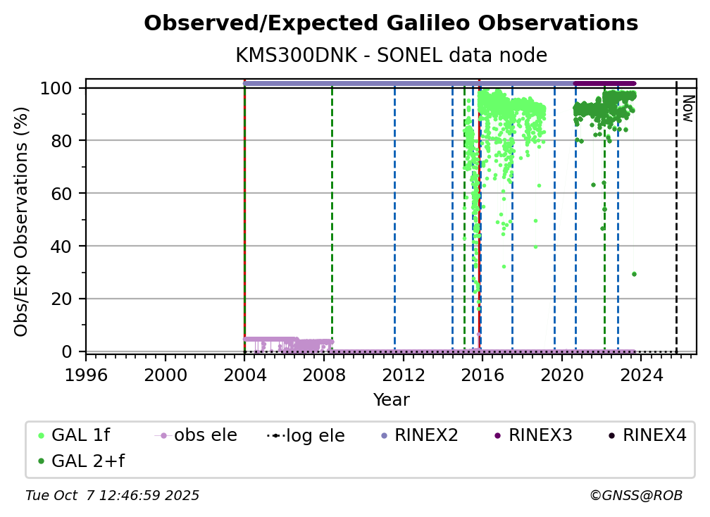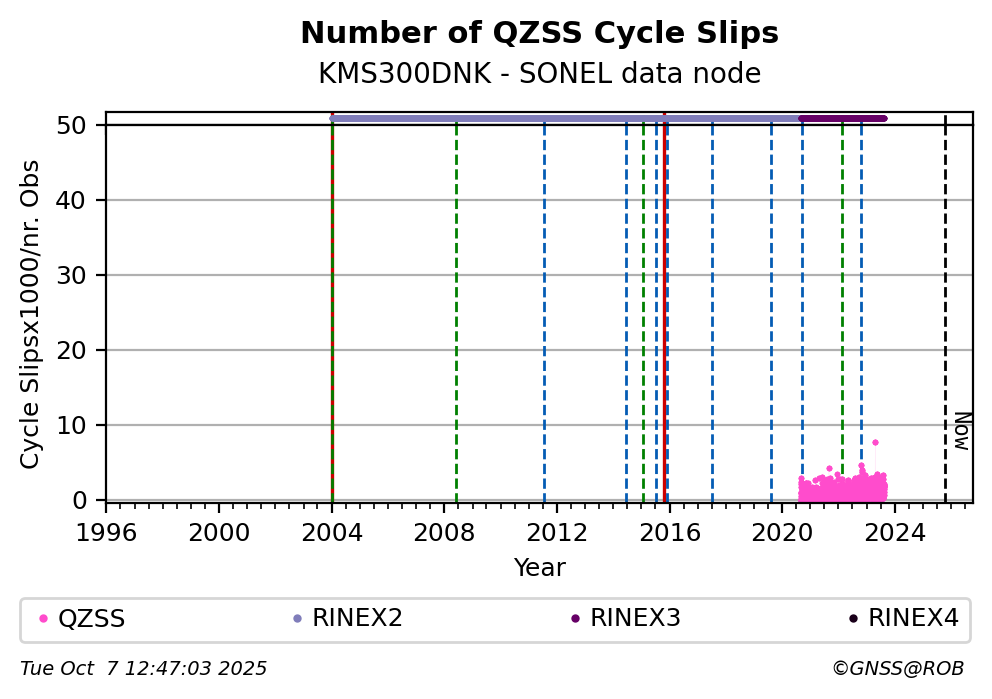 The plots below present the long-term tracking performance of the EPOS-GNSS station KMS300DNK based on the daily RINEX data available from the SONEL EPOS-GNSS data node. The data quality metrics have been computed at the data node using the G-Nut/Anubis software.
