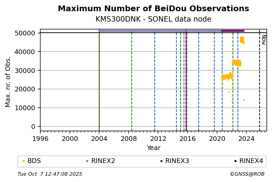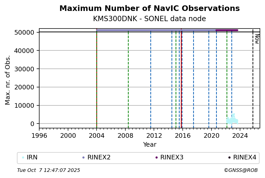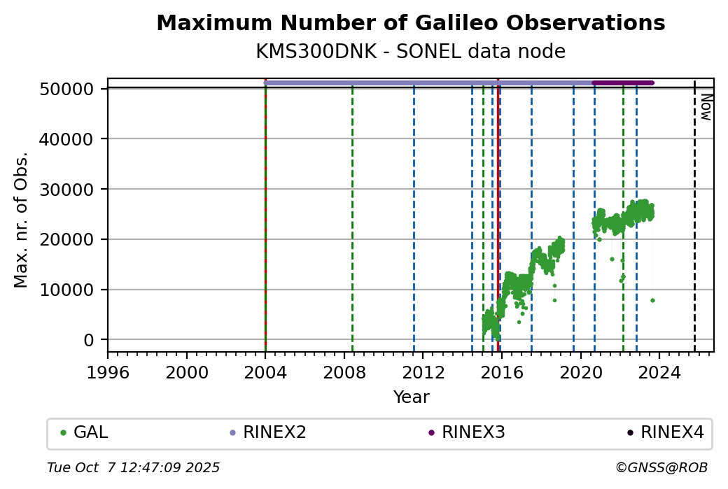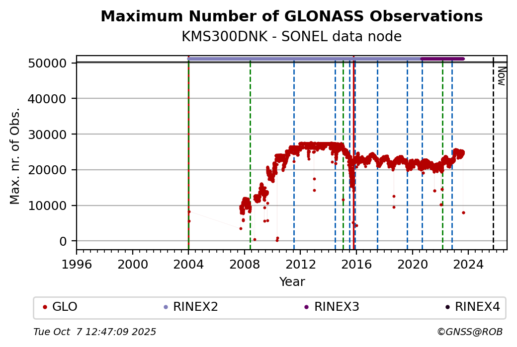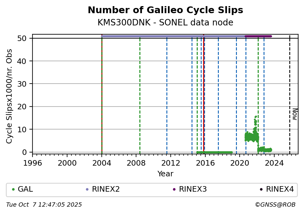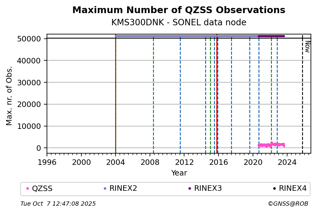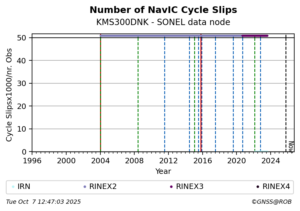 The plots below present the long-term tracking performance of the EPOS-GNSS station KMS300DNK based on the daily RINEX data available from the SONEL EPOS-GNSS data node. The data quality metrics have been computed at the data node using the G-Nut/Anubis software.