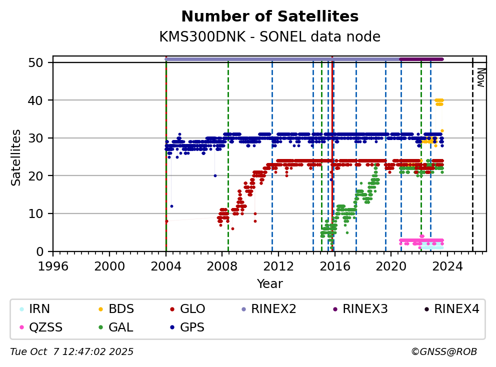 These plots display the number of observed satellites for each constellation tracked by the station.